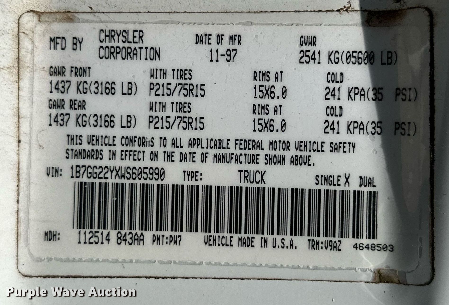 Purple Wave is selling a used Compact Pickup or Van in Kansas. This item is a 1998 Dodge Dakota Club Cab pickup truck with the following: Miles: 276,884 on odometer, VIN: 1B7GG22YXWS605990