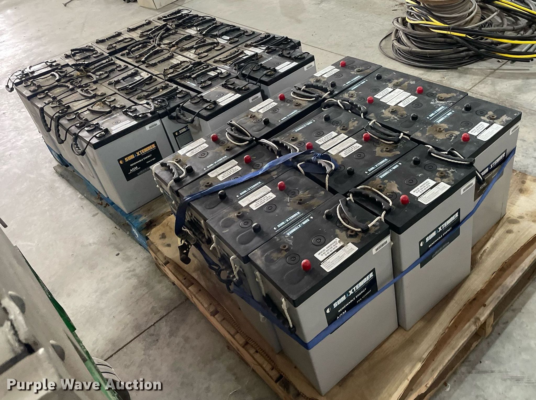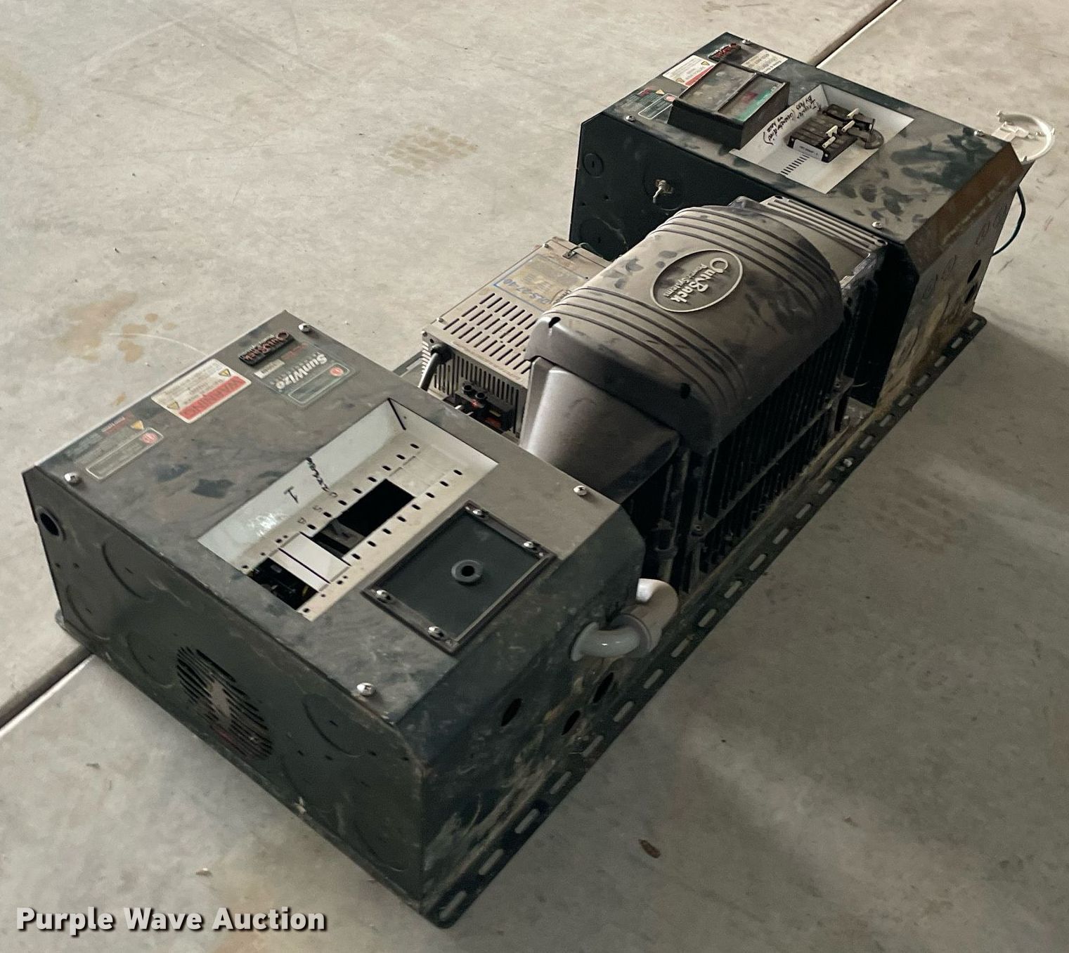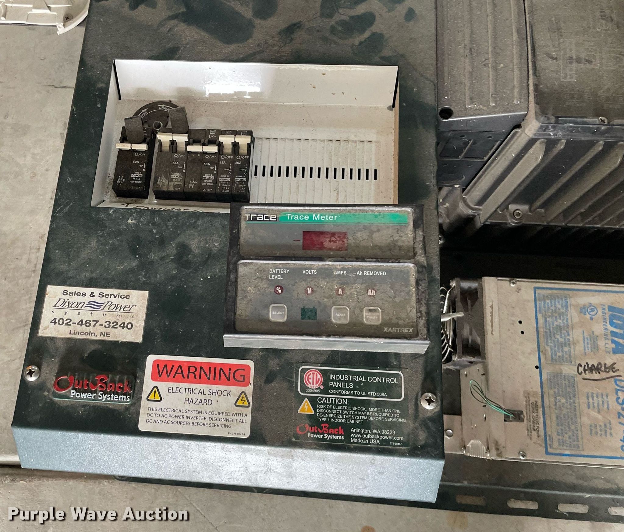 Purple Wave is selling a used Electronics in Kansas. This item is a Renewal energy equipment with the following: (24) Concord Sun Xtender PVX-9105T batteries, Volt: 2, Ampere 24 hour capacity: 915, (12) Concord Sun Xtender PVX-12150HT batteries, Volt: 2, Ampere 24 hour capacity: 1,215, Outback Power Systems control panel, Serial: 10049