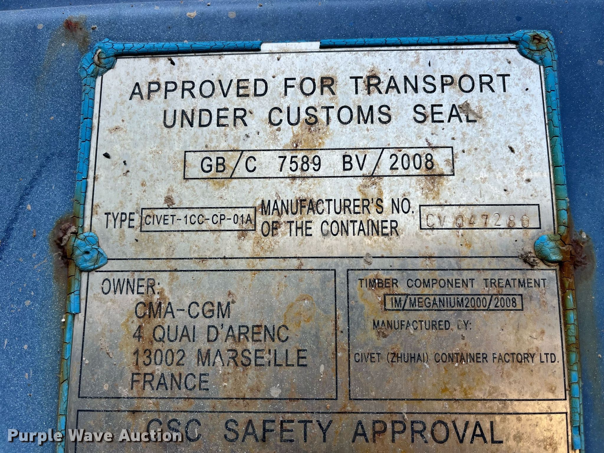 Purple Wave is selling a used Storage or Shipping Container in Illinois. This item is a 2008 Civet CIVET-1CC-CP-01A shipping container with the following: 19' 10" L x 95.5" W x 8' 6" H, Serial: DC047280