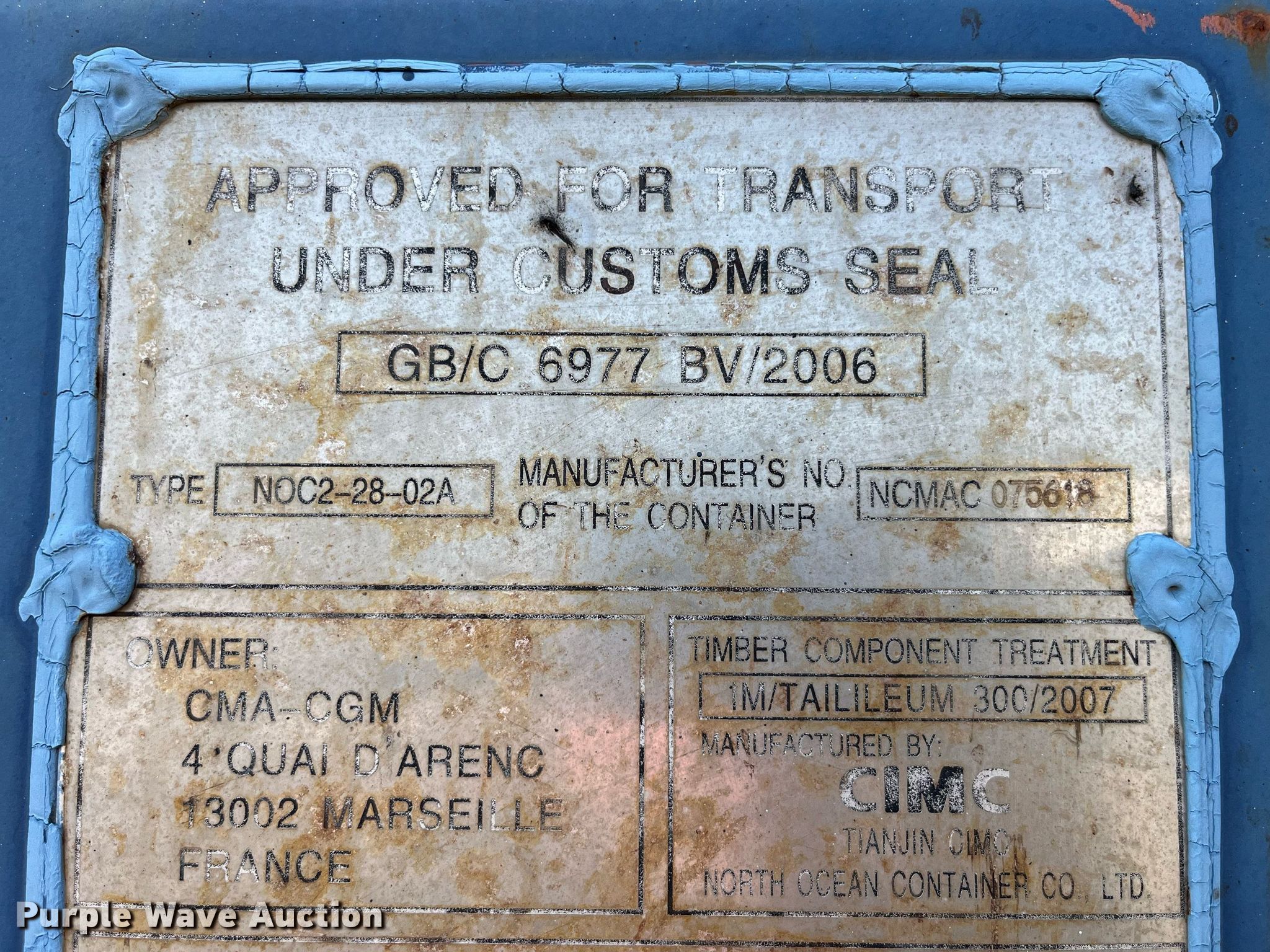 Purple Wave is selling a used Storage or Shipping Container in Illinois. This item is a 2007 CIMC NOC2-28-02A shipping container with the following: 19' 10" L x 8' W x 8' 6" H, Serial: CMAU127917