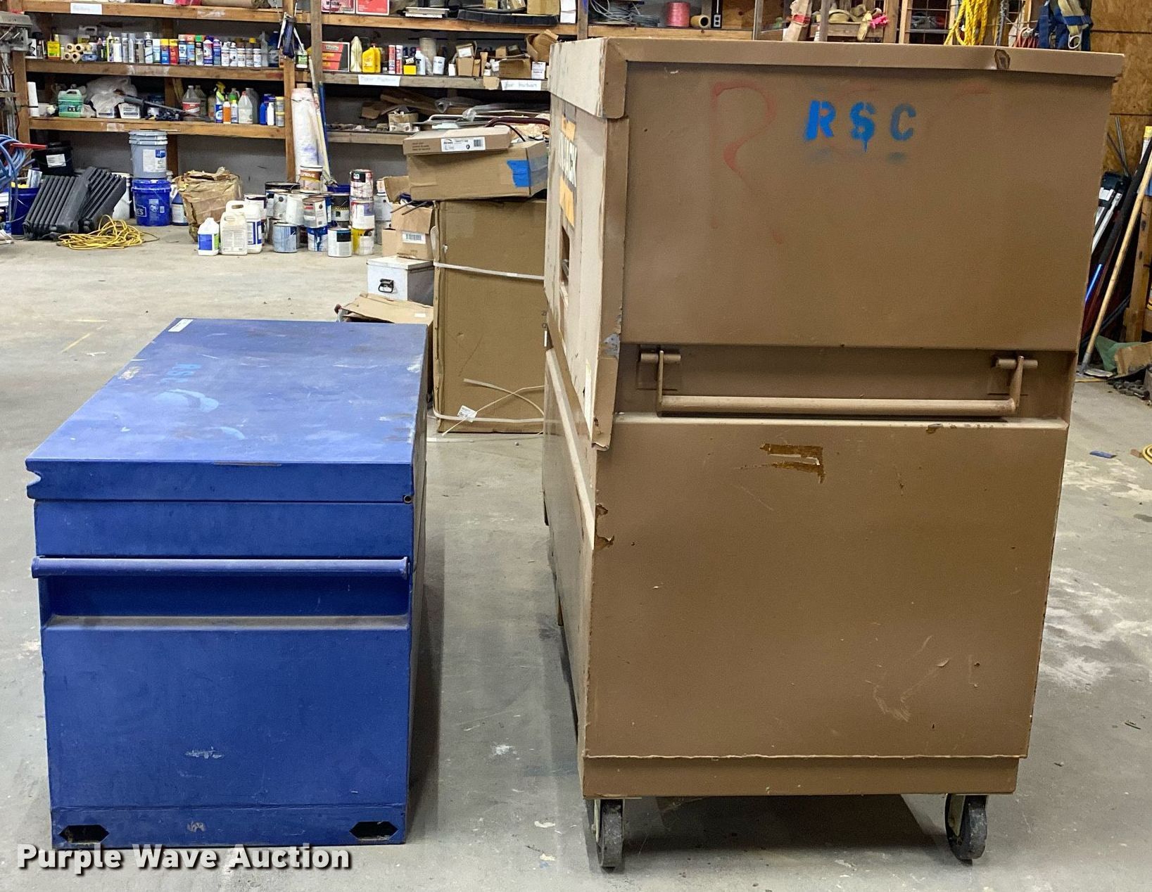Purple Wave is selling a used Tools in Oklahoma. This item is a (2) toolboxes with the following: Site Safe, 4' x 2' x 28", Knaack:, 61" x 31" x 55"