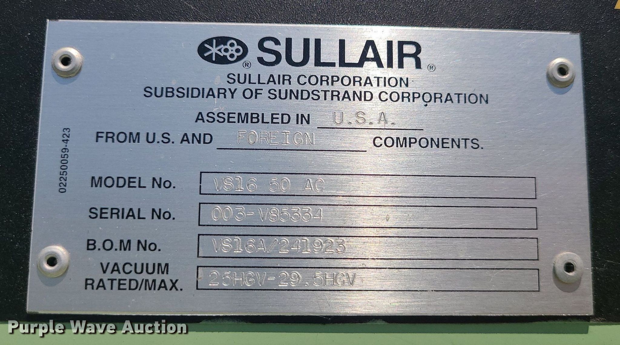 Purple Wave is selling a used Pump in Missouri. This item is a Sullair VS-16 vacuum pump with the following: Hours: 23,883 on meter, Serial: 003-V85334