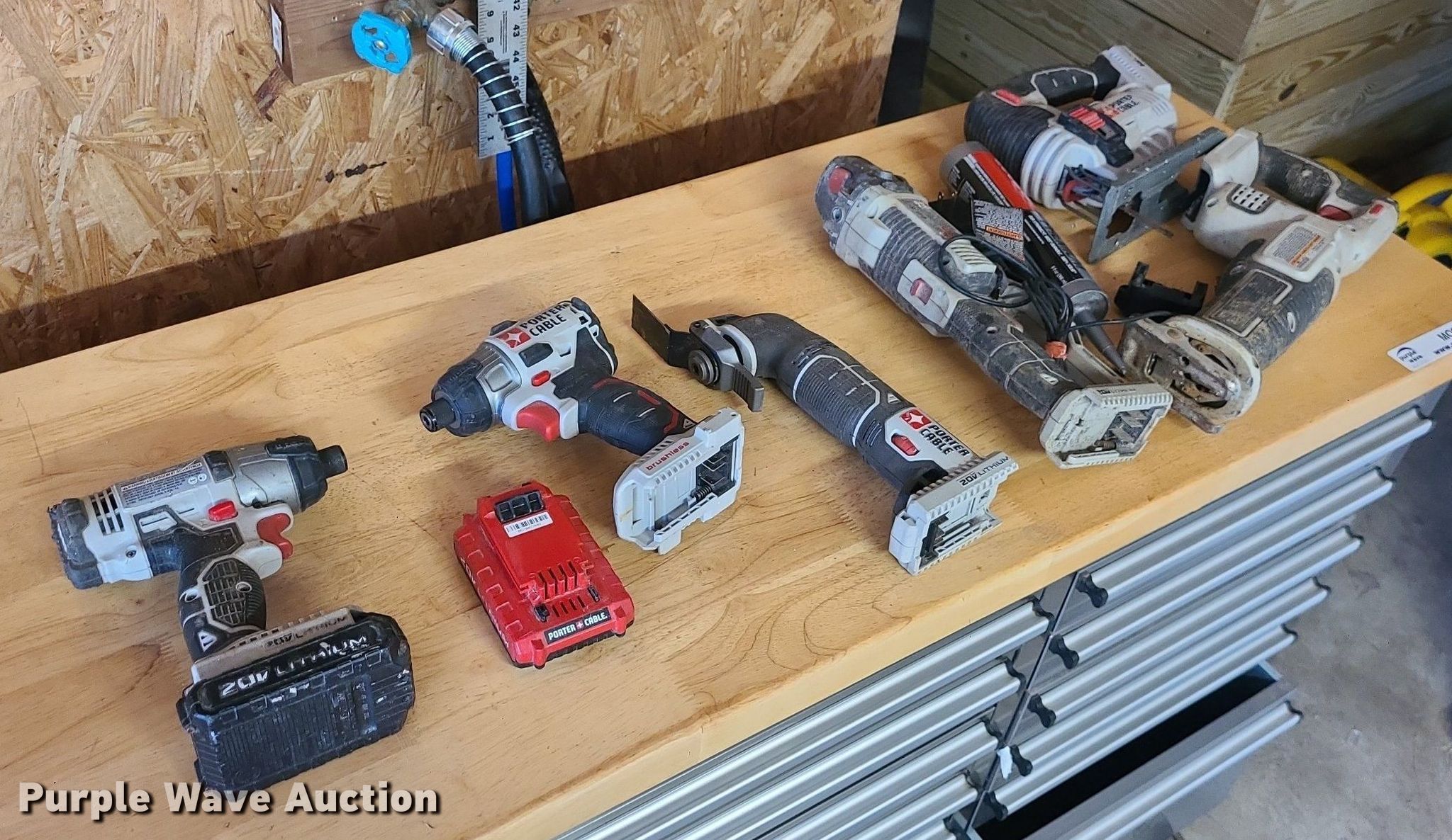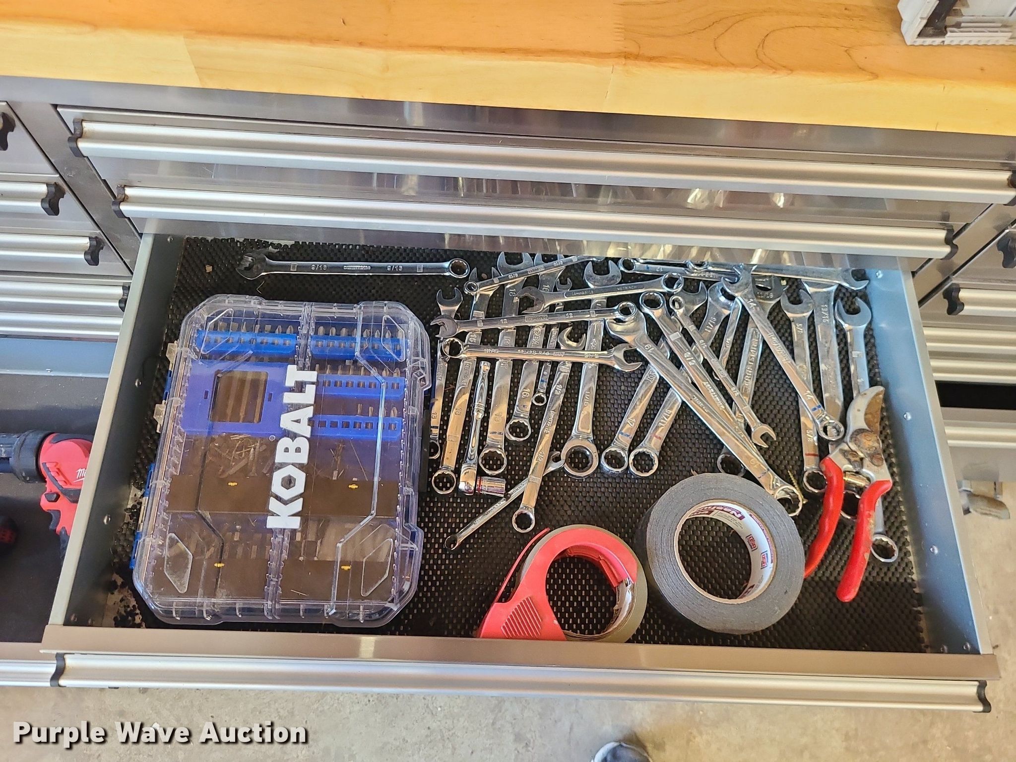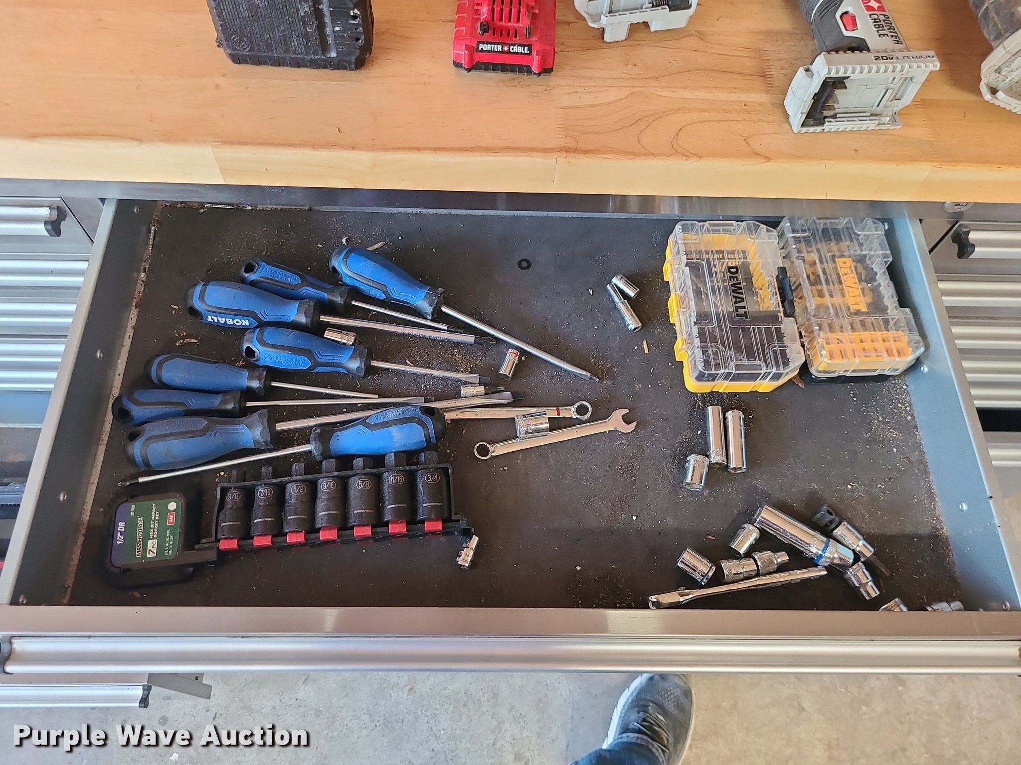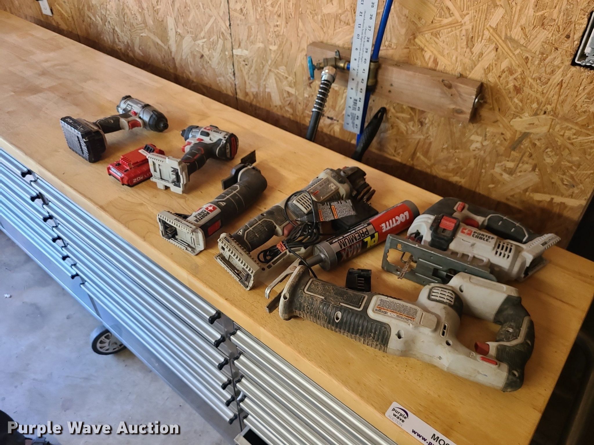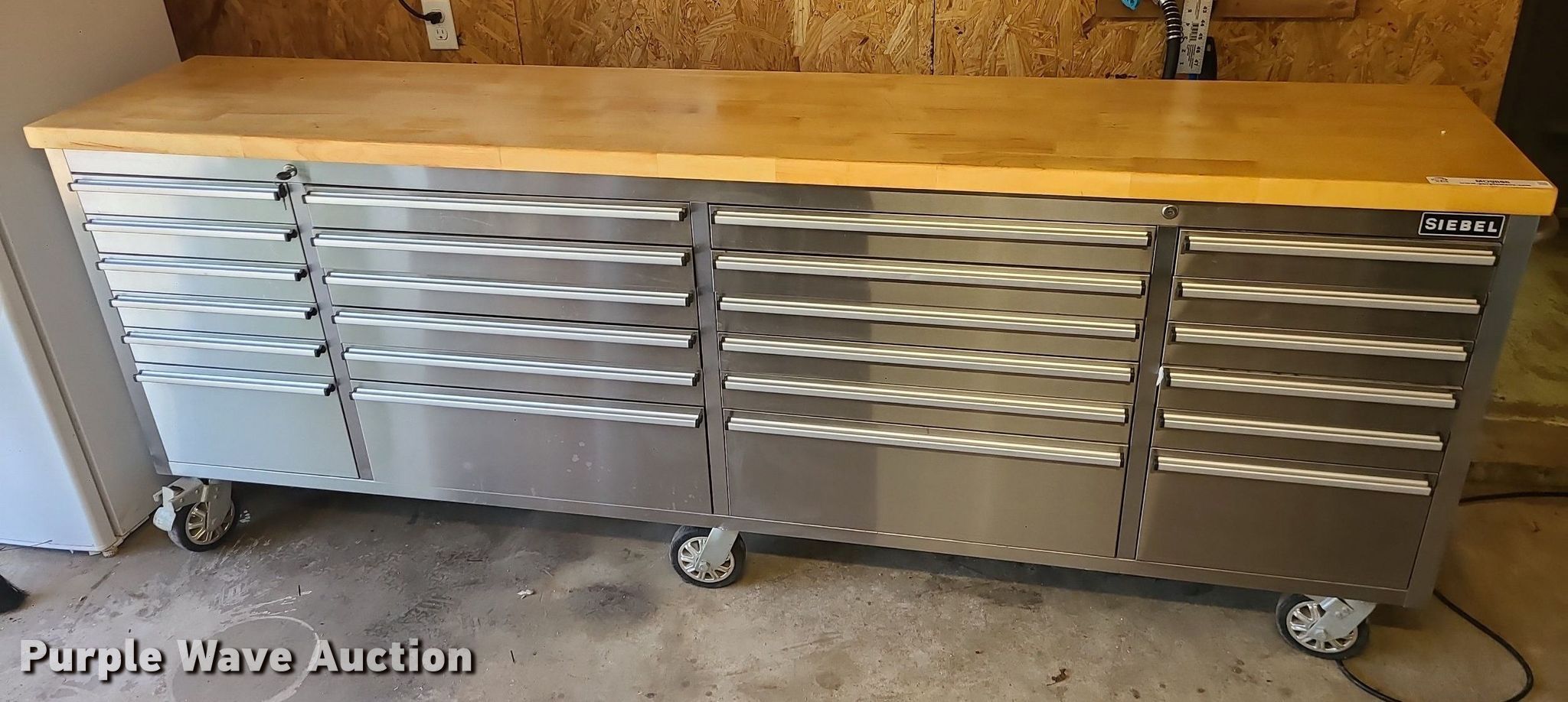 Purple Wave is selling a used Tools in Missouri. This item is a Siebel work bench with the following: 8' W x 37" H x 19" D, Wrenches, Sockets, Bits, Grinder, Porter Cable cordless tool kit, Keys