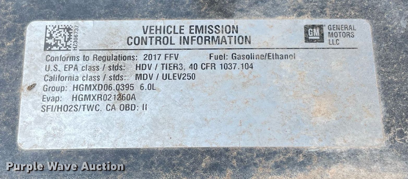 2017 Chevrolet Silverado 2500HD Double Cab pickup truck. Miles: 116,159 on odometer, VIN: 1GC2KUEG2HZ306737. Engine Displacement: 6.0L V8 OHV, Cylinders: 8, Fuel type: Gas. Transmission Automatic, Four wheel drive. Interior AC, Heat, Heated mirrors, Power windows, Power locks, Cruise control, Backup camera. Tires Size: 265/70R17. Notes Dash warning indicator: Check engine, TPMS. Oklahoma title. Title distribution may be delayed up to 30 days from verification of funds. Territory Resources. LLC. 2201 U.S. 81. Marlow, OK 73055