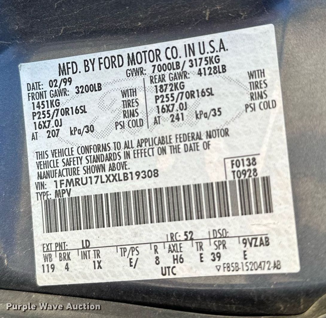 Purple Wave is selling a used Passenger Vehicle in Oklahoma. This item is a 1999 Ford Expedition SUV with the following: Miles: Unknown, VIN: 1FMRU17LXXLB19308