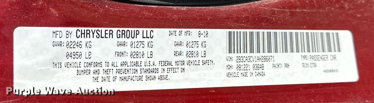 Purple Wave is selling a used Passenger Vehicle in Oklahoma. This item is a 2010 Dodge Charger with the following: Miles: 253,798 on odometer, VIN: 2B3CA3CV1AH286071