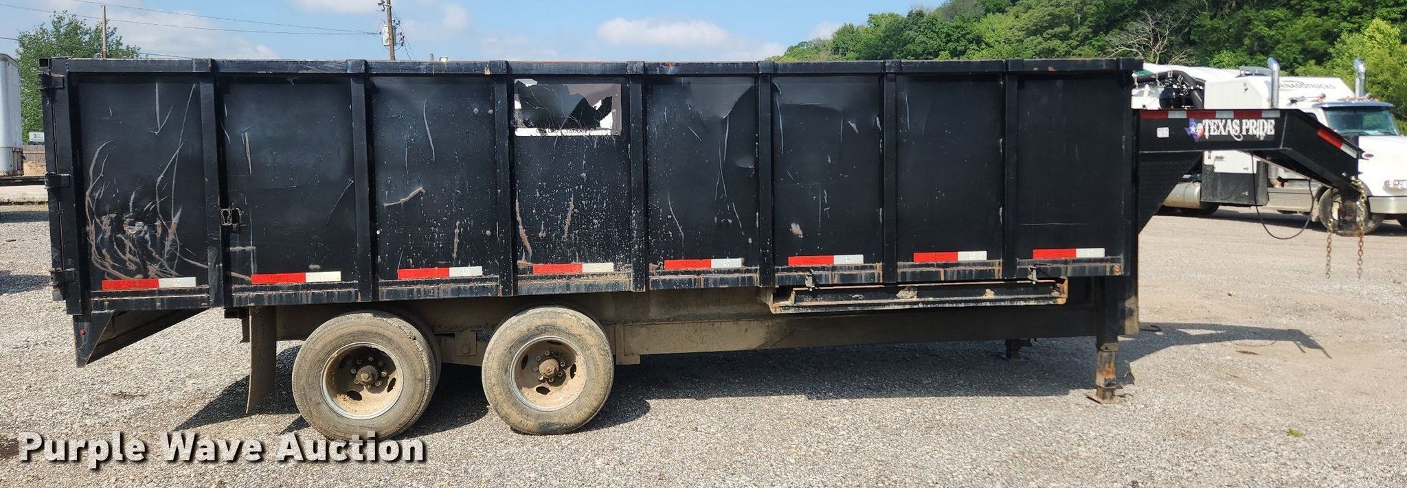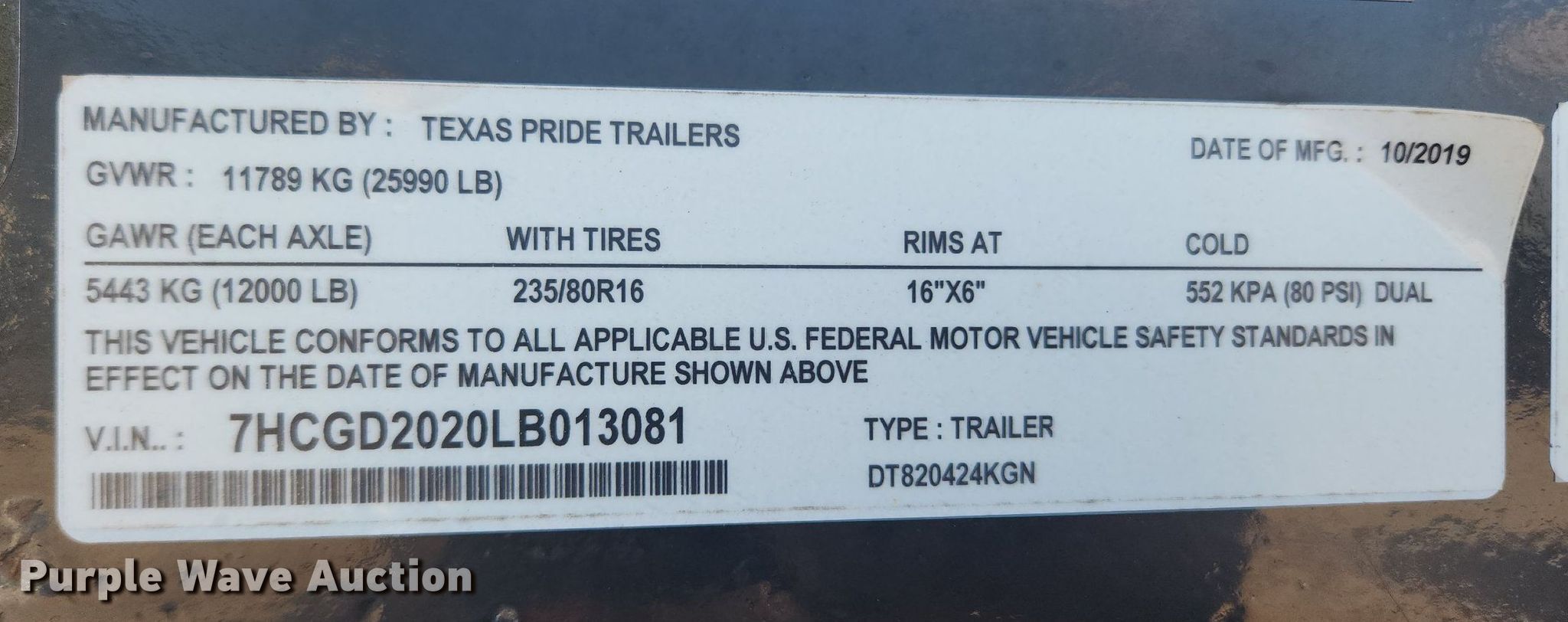 2020 Texas Pride DT82042KGN dump trailer. VIN: 7HCGD2020LB013081. Dimensions Overall: 29' L x 100" W, Body: 20' L x 100" W, Side height: 53". Features Body type: Steel, Ram: Dual, End gate: Manual. Chassis Hitch: Gooseneck, Landing gear: Dual, Suspension: Spring, Brakes: Electric, Axles: Tandem, GVWR: 25,990 lbs, GAWR: 12,000 lbs. Tires Size: 235/80R16. Notes Dead batteries. Missouri title. Title distribution may be delayed up to 14 days from verification of funds. Excel Utility Contractors, LLC. Pacific, MO 63069