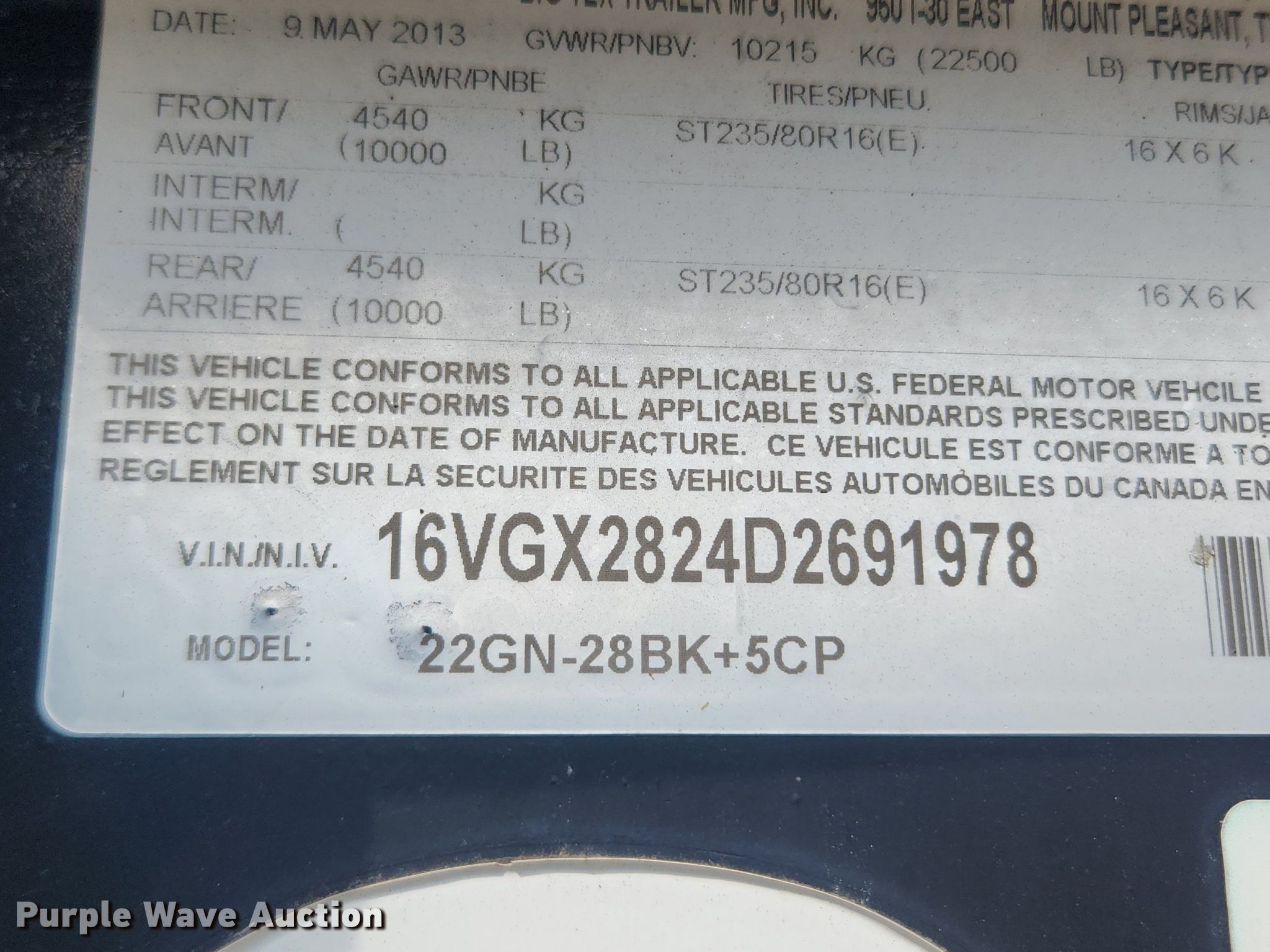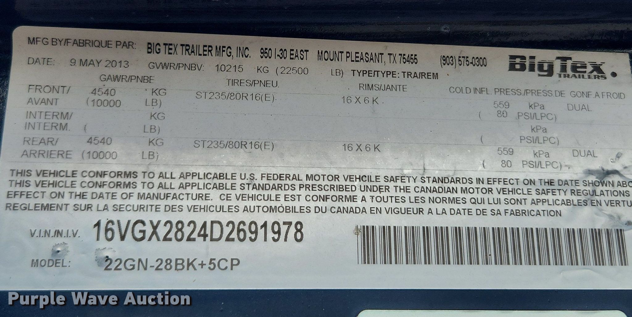 Purple Wave is selling a used Equip. Trailer in Missouri. This item is a 2013 Big Tex 22GN-28BK+5CP equipment trailer with the following: VIN: 16VGX2824D2691978