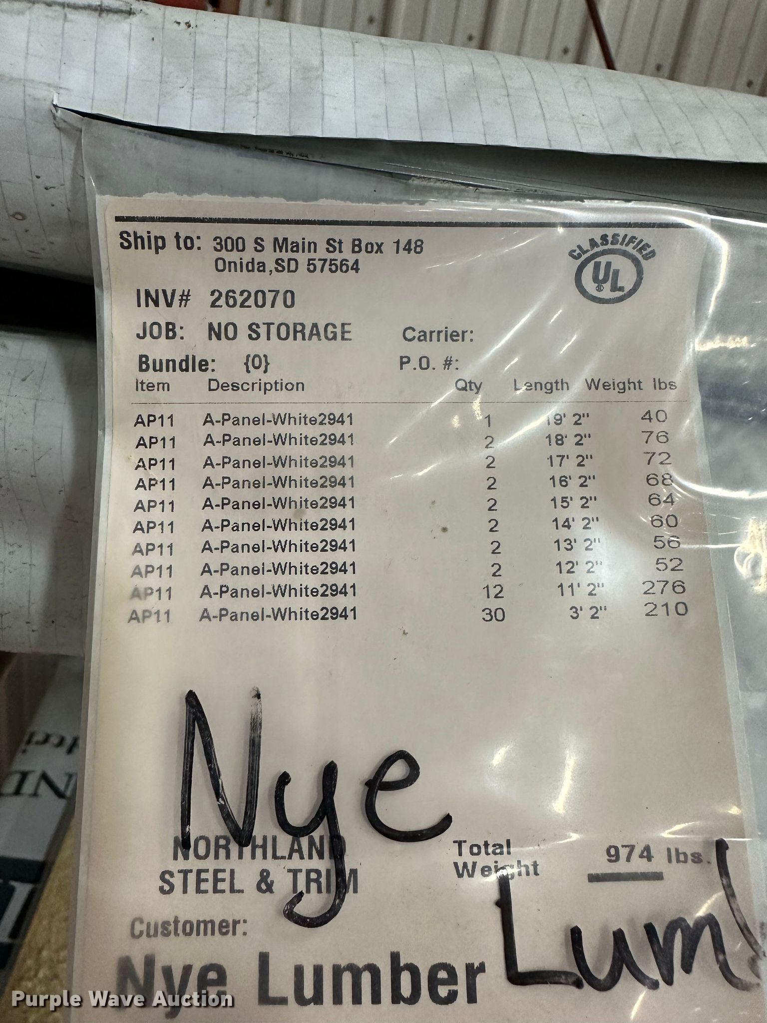 (57) sheets of metal siding/roofing. 19' 2" L x 36" W , (2) 18' 2" L x 36" W, (2) 17' 2" L x 36" W, (2) 16' 2" L x 36" W, (2) 15' 2" L x 36" W, (2) 14' 2" L x 36" W, (2) 13' 2" L x 36" W, (2) 12' 2" L x 36" W, (12) 11' 2" L x 36" W, (30) 3' 2" L x 36" W, A-Panels, 29 gauge, Color: White, Possible blemishes. Northland Steel & Trim. 9262 93rd Ave SE. Fullerton, ND 58441