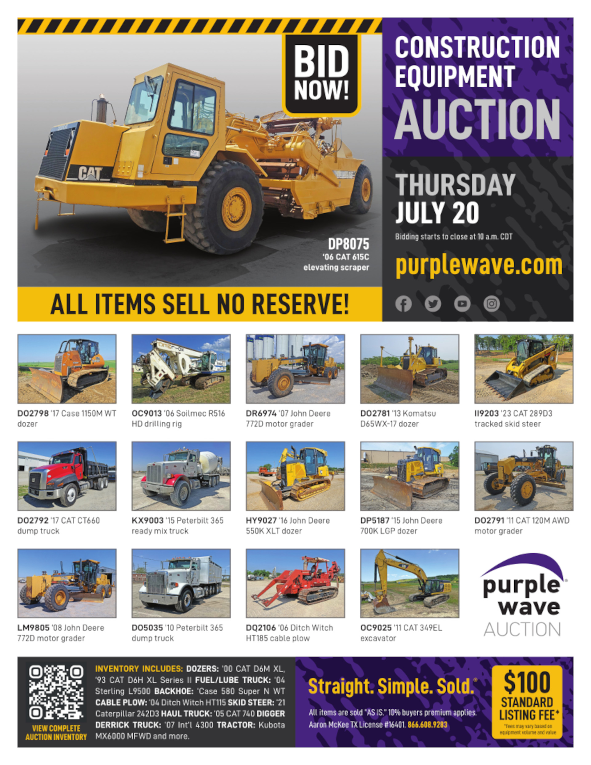This auction is conducted by Purple Wave, Inc., whose home office is 825 Levee Drive, Manhattan, Kansas. Aaron McKee, Texas auctioneer license # 16401, operates Purple Wave, Inc. Complaints against us may be directed to the Texas Department of Licensing and Regulation, P.O. Box 12157, Austin, Texas 78711, (512) 463-6599. For additional required information, see the attached document.