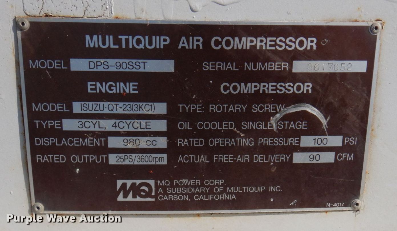 (2) air compressors. Multiquip DPS-90SS. Hours: 1,644 on meter. Engine Isuzu, Cylinders: 3, Fuel type: Diesel. Features Generator Electric start, Fuel tank, Air compressor CFM: 90. Trailer Ball hitch size: 2", Suspension: Spring, Axles: Single, Tire size: ST175/80R13. Notes Non-operational DPS-90SST air compressor included Parts missing. 1989 Multiquip DPS-90SST Hours: 3,015 on meter, Serial: 3617652. Engine Izuzu QT-23, Displacement: 930cc. Features Air compressor PSI: 100. Transfer of ownership documentation will be a bill of sale. Rivera Landscape LLC. 4960 County Road 10. Chaska, MN 55318