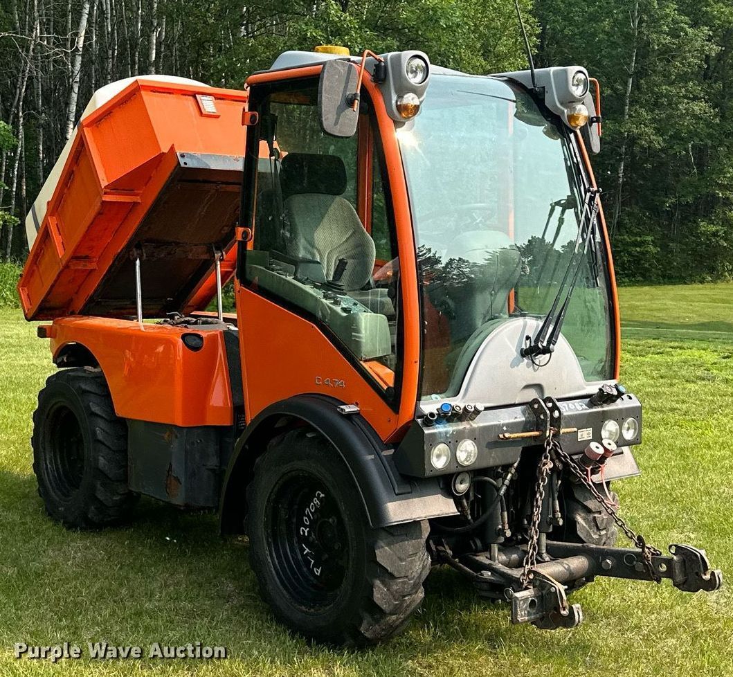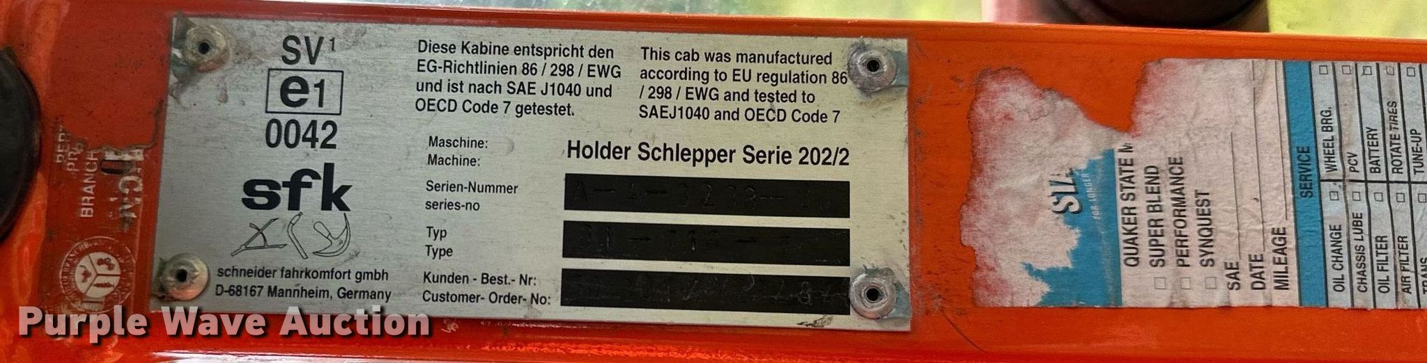 Holder C4.74 sidewalk tractor. Hours: 1,332 on meter, Serial: 4DB070958. Engine Deutz, Displacement: 3.109, Cylinders: 4, Fuel type: Diesel, HP: 73, kW: 53.5. Transmission Hydrostatic, 4F, Differential lock. Operators station AC, Heat. Features PTO: 540, Seven pin outlet, Hydraulic remote sets Front: 4, Rear: 1, Loader Controls: Joystick, Dump bed 60" L x 42" W, Dump bed type: hydraulic, 120 gallon tank, Holder sweeper Width: 60", Holder 4150SB snow blower Width: 48", Kugelman plow Width: 60". Tires Size: 10.5/80-18. Notes Intermittent hydrostatic issues, Three point hydraulic issues. 6903 Grange Road Northwest. Bemidji, MN 56601
