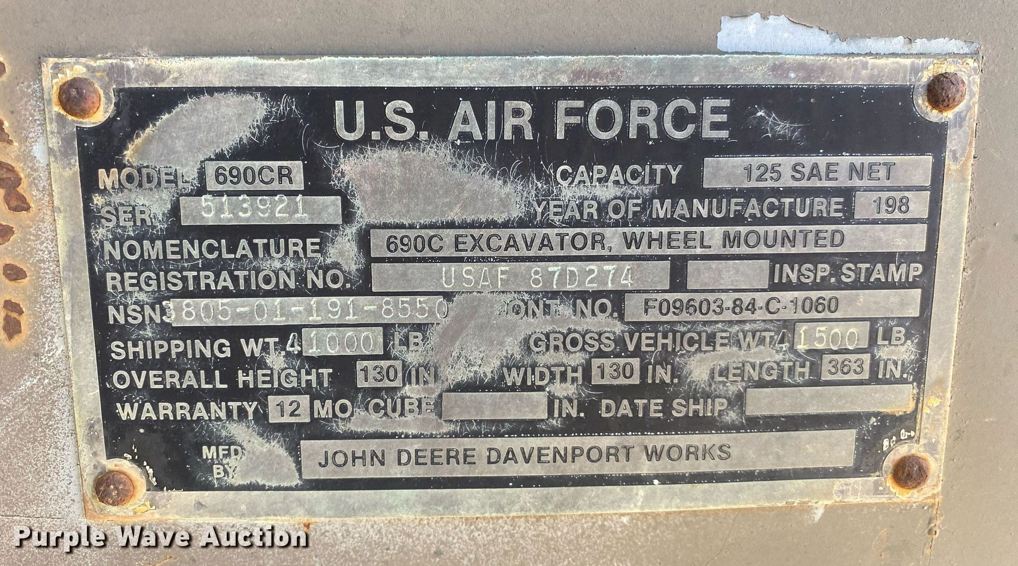 Purple Wave is selling a used Wheeled Excavator in Oklahoma. This item is a 1987 John Deere 690CR wheeled excavator with the following: Hours: 1,999 on meter, Serial: DW690CR513921