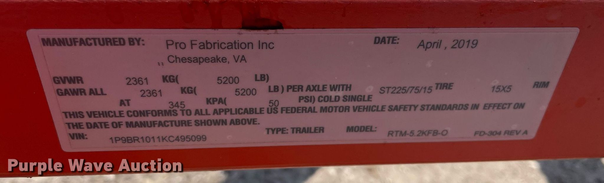 Purple Wave is selling a used Reel Trailer in Illinois. This item is a 2019 Pro Fabrication Inc RMT5.2KFB-O reel trailer with the following: VIN: 1P9BR1011KC495099, Unit #: TR38