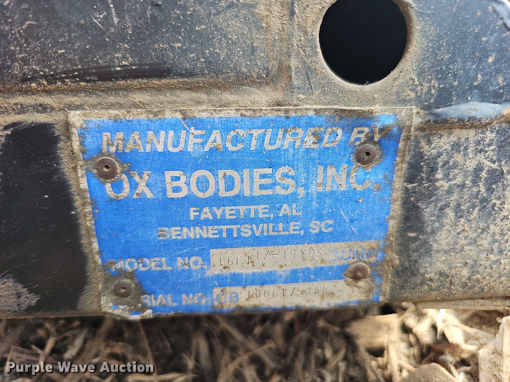 Ox Bodies 16FT17-19YDS dump truck bed. Serial: 10061753AR. Features 16' L x 96" W, Side height: 48", Side board height: 8", Bed type: Steel, Ram: Single, End gate: Air operated. Valley Corp. 28001 Ida Circle. Valley, NE 68064