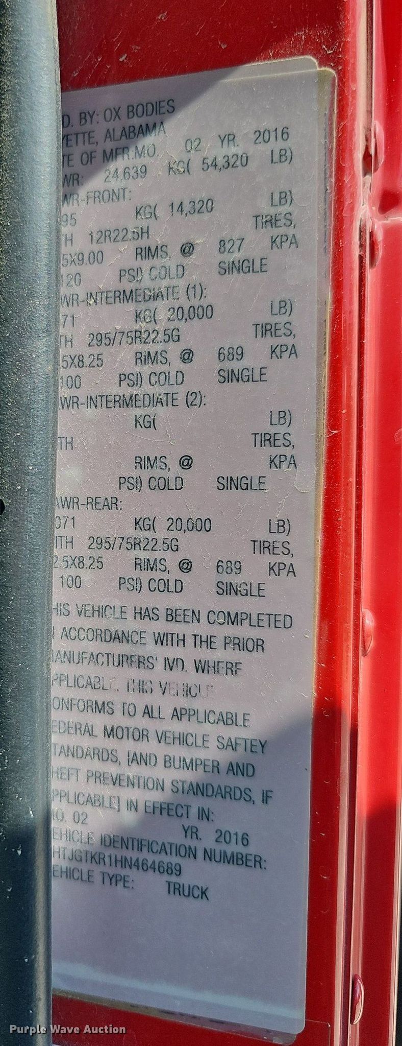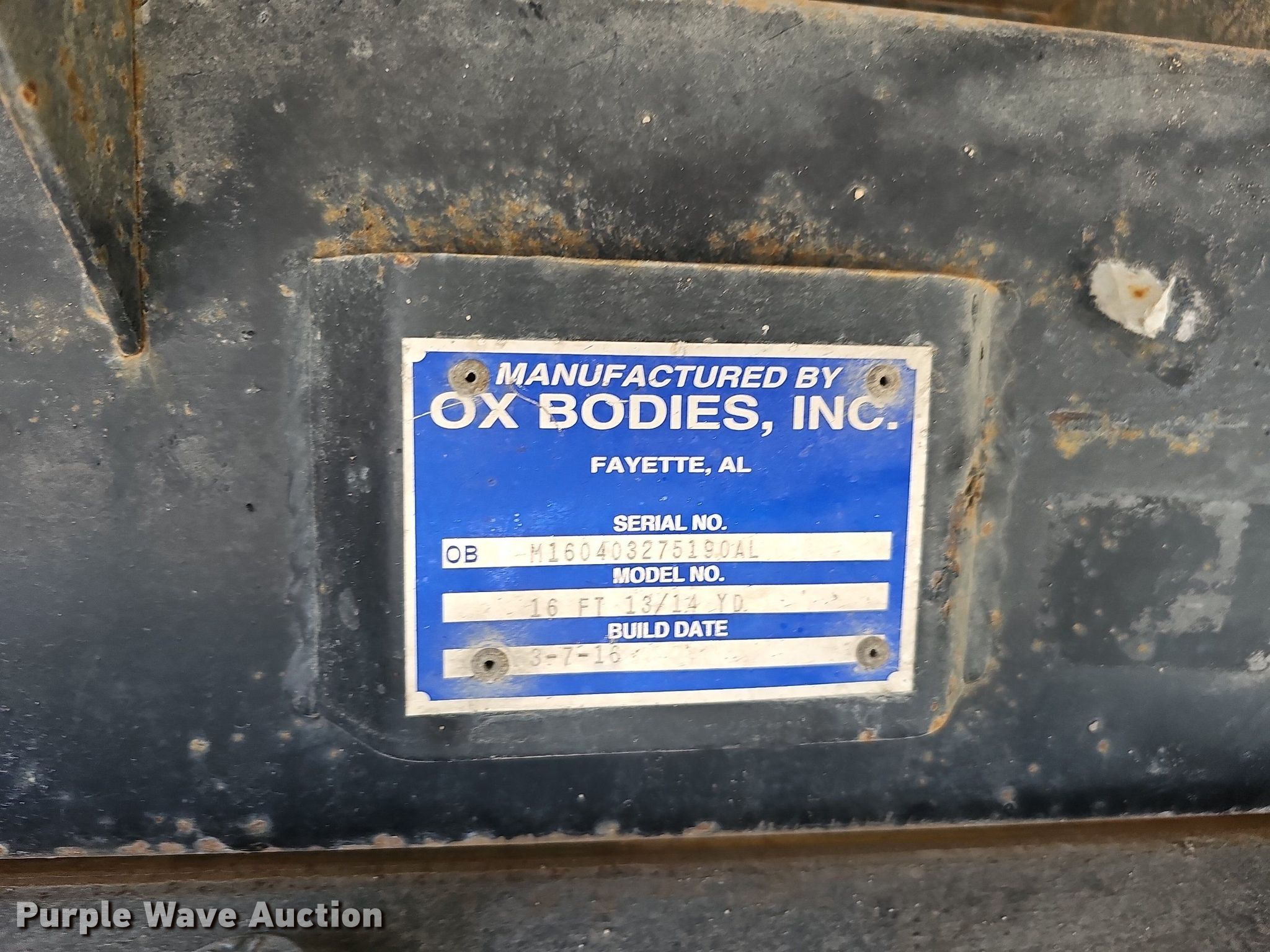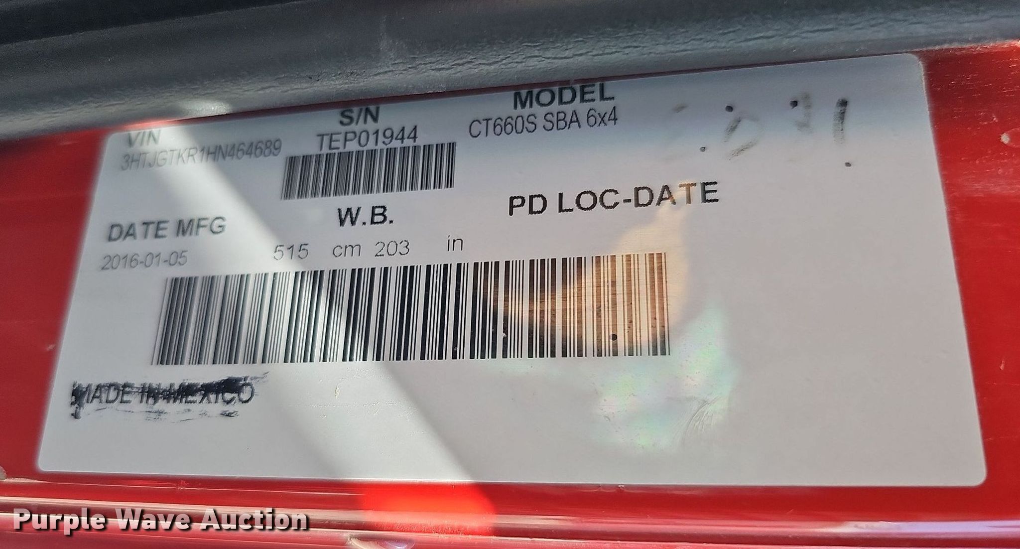 2017 Caterpillar CT660 dump truck. Miles: 115,088 on odometer, Hours: 4,321 on meter, VIN: 3HTJGTKR1HN464689. Engine Caterpillar CT13, Cylinders: 6, Fuel type: Diesel. Transmission Eaton Fuller, Manual, Speed: 10. Chassis Axles: Tandem, Differential lock: Full, Suspension: Spring over walking beam, Brakes: Air, PTO, GVWR: 54,320 lbs FAWR: 14,320 lbs, IAWR: 20,000 lbs, RAWR: 20,000 lbs, Wheelbase: 204". Interior AC, Heat, Heated mirrors, Power windows, Cruise control. Features Dump bed Ox Bodies, Capacity: 13 cu.yd., 16' L x 96" W, Side height: 36", Side board height: 8", Bed type: Steel, Roll tarp, Ram: Single , End gate: Air operated. Tires Size: 11R24.5. Iowa title. Title distribution may be delayed up to 14 days from verification of funds. Lawrence Trenching LLC. 21854 Platteview Road. Gretna, NE 68028