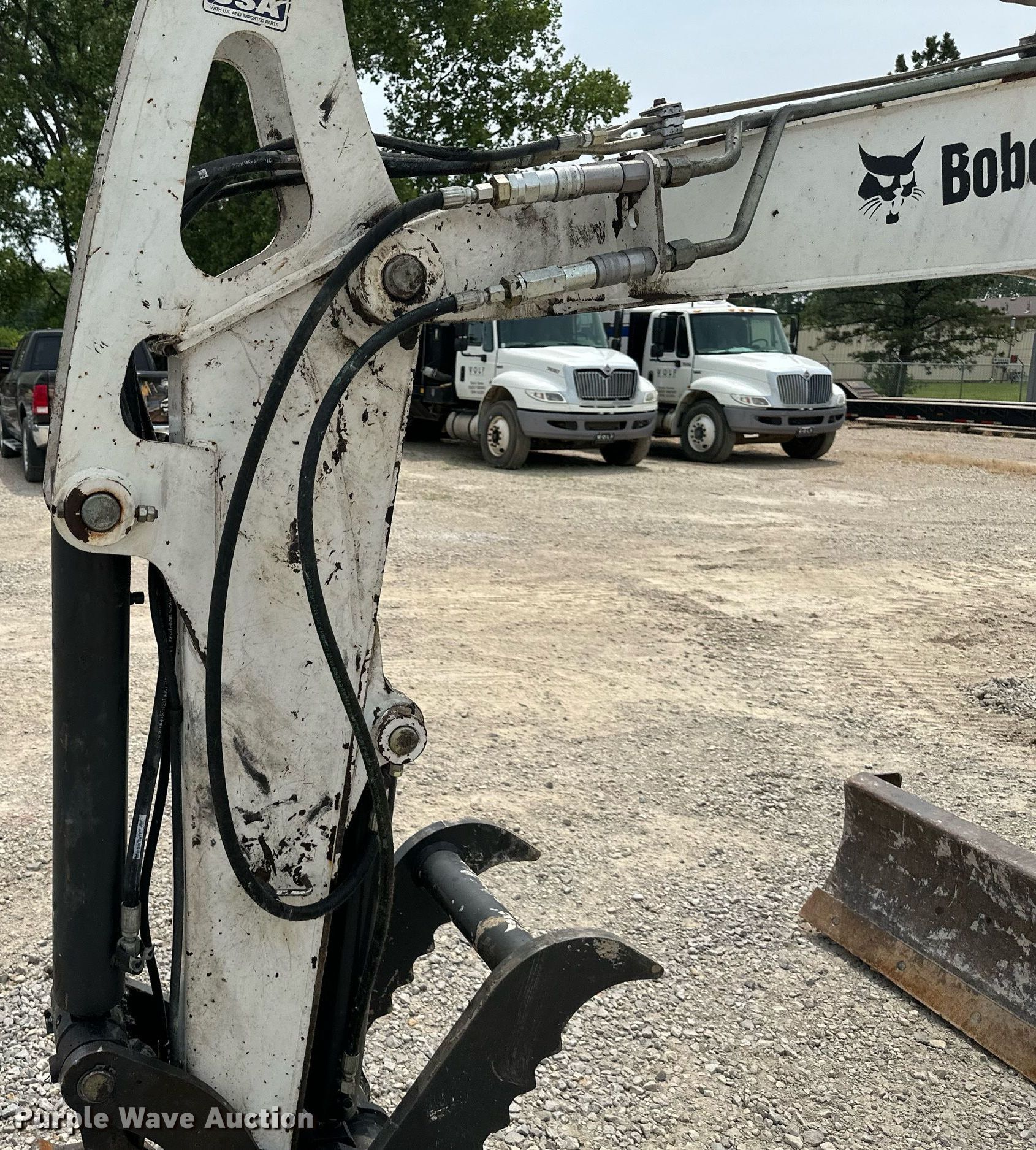 2012 Bobcat E50 mini excavator. Hours: 4,540 on meter, Serial: AG3N12254. Engine Kubota, Cylinders: 4, Fuel type: Diesel. Transmission Hydrostatic. Operators station Enclosed cab, AC, Heat. Features Auxiliary hydraulics Standard, Two-way, Counter weights, Removable, Backfill blade Width: 77", Boom Swing, Stick Stick length: 66", Quick coupler: Hydraulic Bobcat, Thumb: Hydraulic Bobcat, Bucket Bobcat, Width: 22", Cutting edge: Weld-on. Tracks Width: 16", Rubber. Wolf Construction. 5630 Southwest Randolph Avenue. Topeka, KS 66609