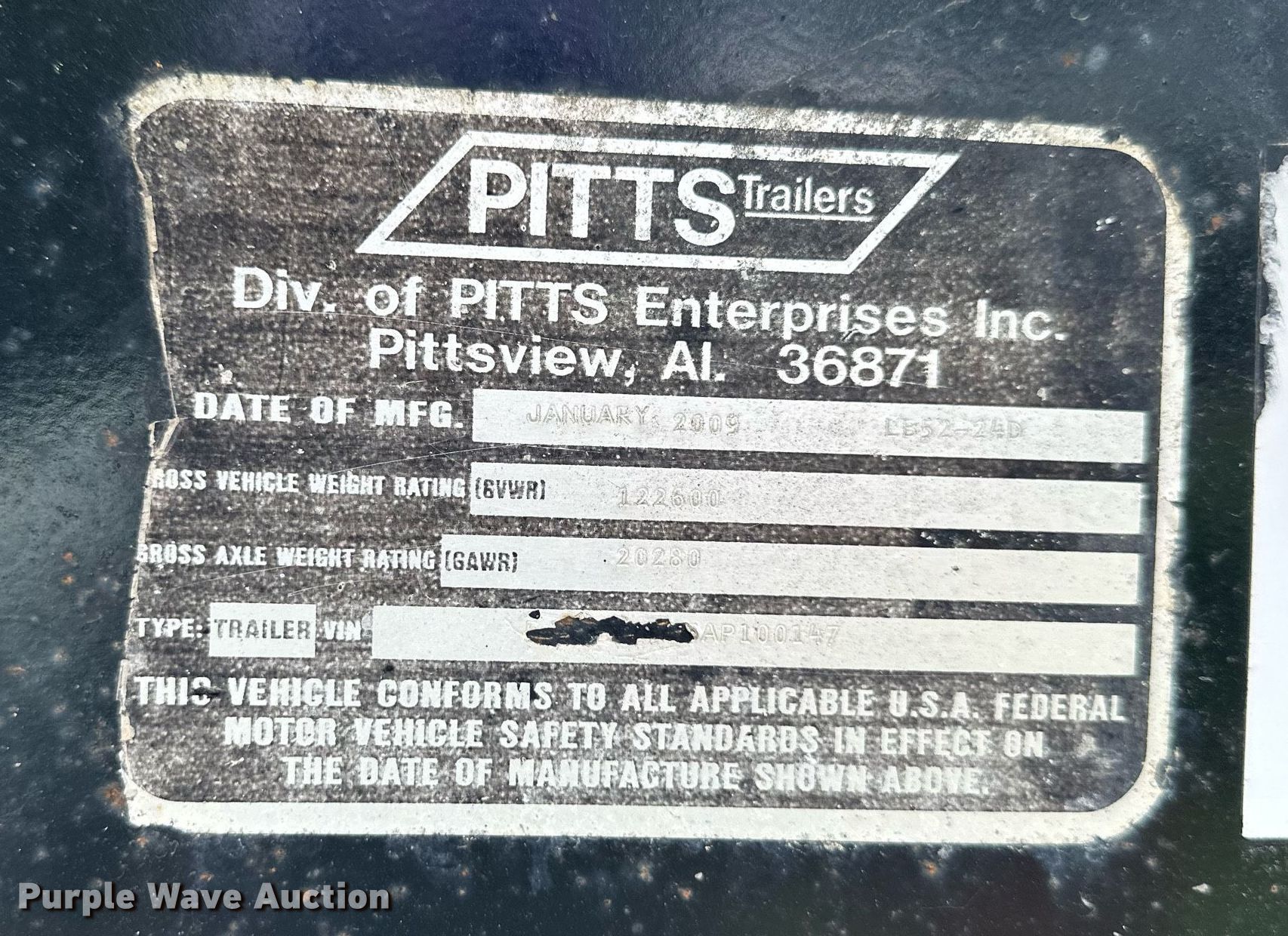 2010 Pitts lowboy equipment trailer. VIN: 5JYLB5235AP100147. Dimensions Overall: 50' L x 102" W, Deck: 24' L x 102" W, Tail length: 14' 6". Features Deck type: Wood, Outriggers: Swing-out, Neck type: Detachable, Self-contained hydraulics. Chassis Hitch: Gooseneck, Suspension: Air, Brakes: Air, Axles: Triple, GVWR: 122,600 lbs, GAWR: 20,280 lbs. Tires Steel wheels, Size: 255/70R22.5. Kansas title. Title distribution may be delayed up to 14 days from verification of funds. Topeka, KS 66618