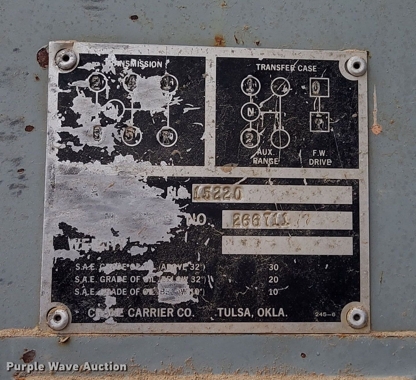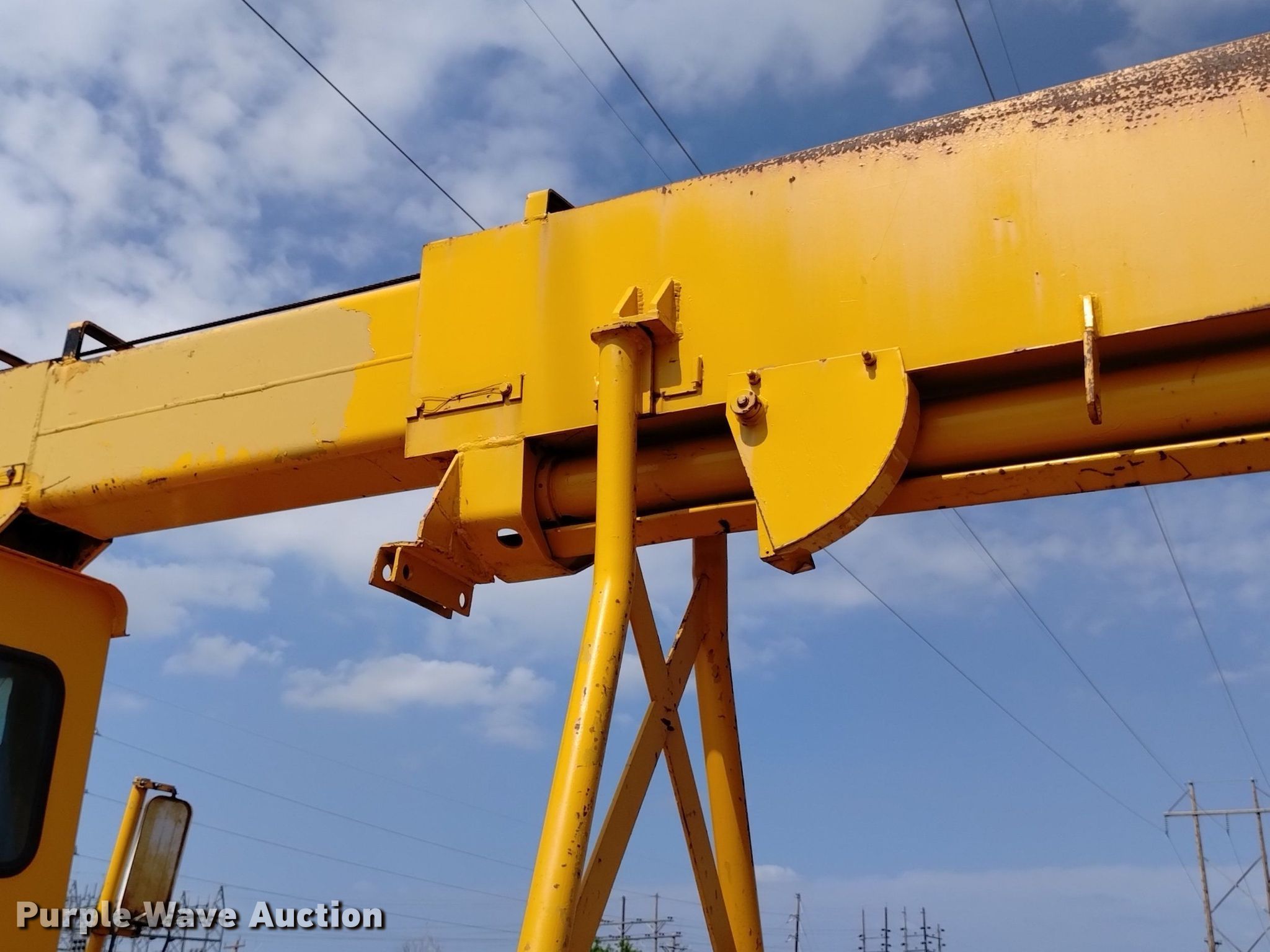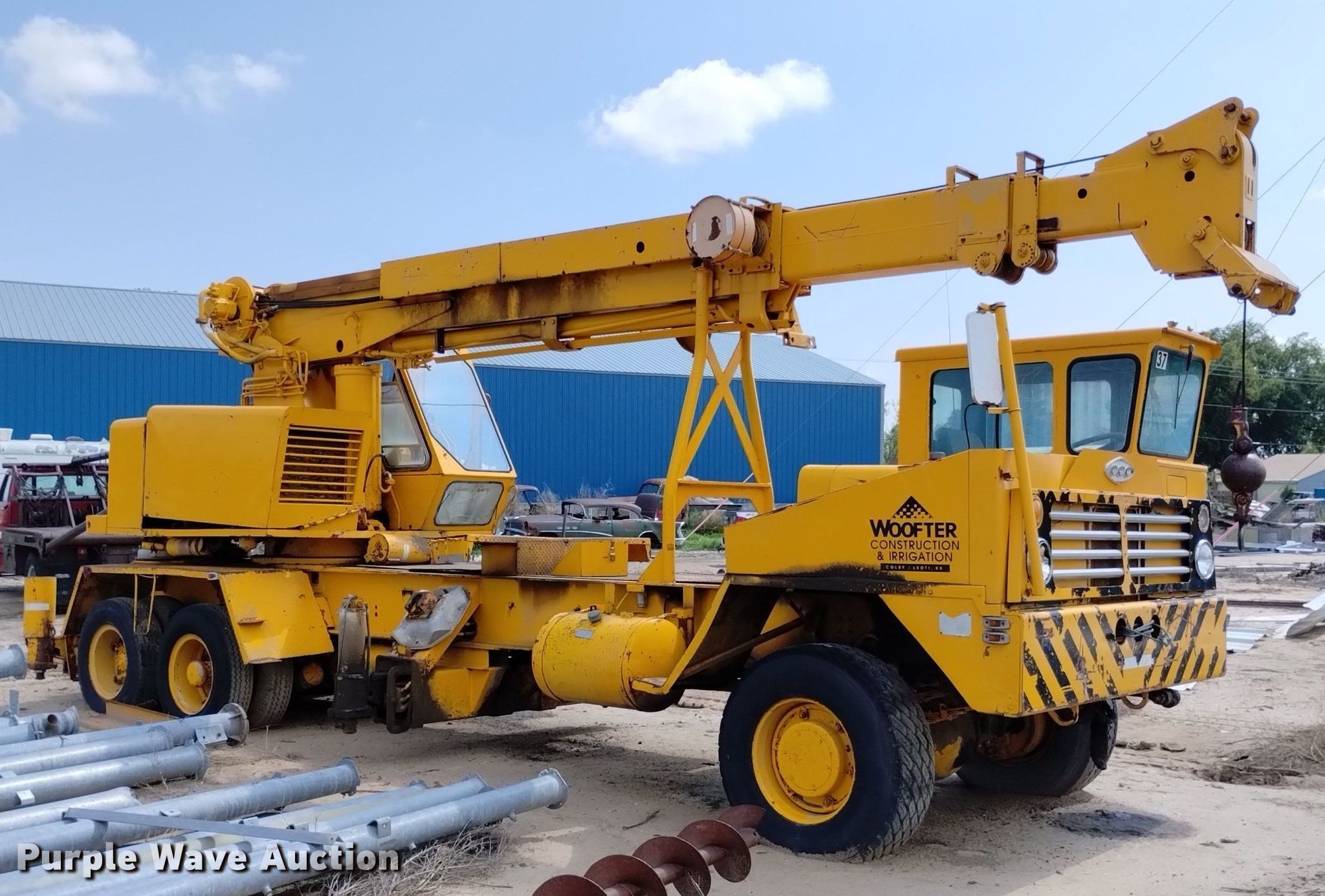 Galion 150T crane. Miles: 17,138 on odometer, Hours: 4,493 on meter, Serial: 266711. Engine Cylinders: 6, Fuel type: Gas. Second engine Cylinders: 8, Fuel type: Gas. Transmission Manual, Speed: 5. Chassis Axles: Tandem, Suspension: Spring, Brakes: Air. Operators station Enclosed cab, Upper interior Crane controls: Stick. Features Boom Telescopic, Maximum boom length: 64' Sections: 3, Maximum lift capacity: 30,000 lbs, Boom controls In-cab, Crane block, Crane ball & hook, Lift chart. Tires Front: 385/65R22.5, Rear: 9.00-20. Notes Glass cracked, No battery , Non-operational unit. Woofter Construction & Irrigation. 1965 Thielen Avenue. Colby, KS 67701
