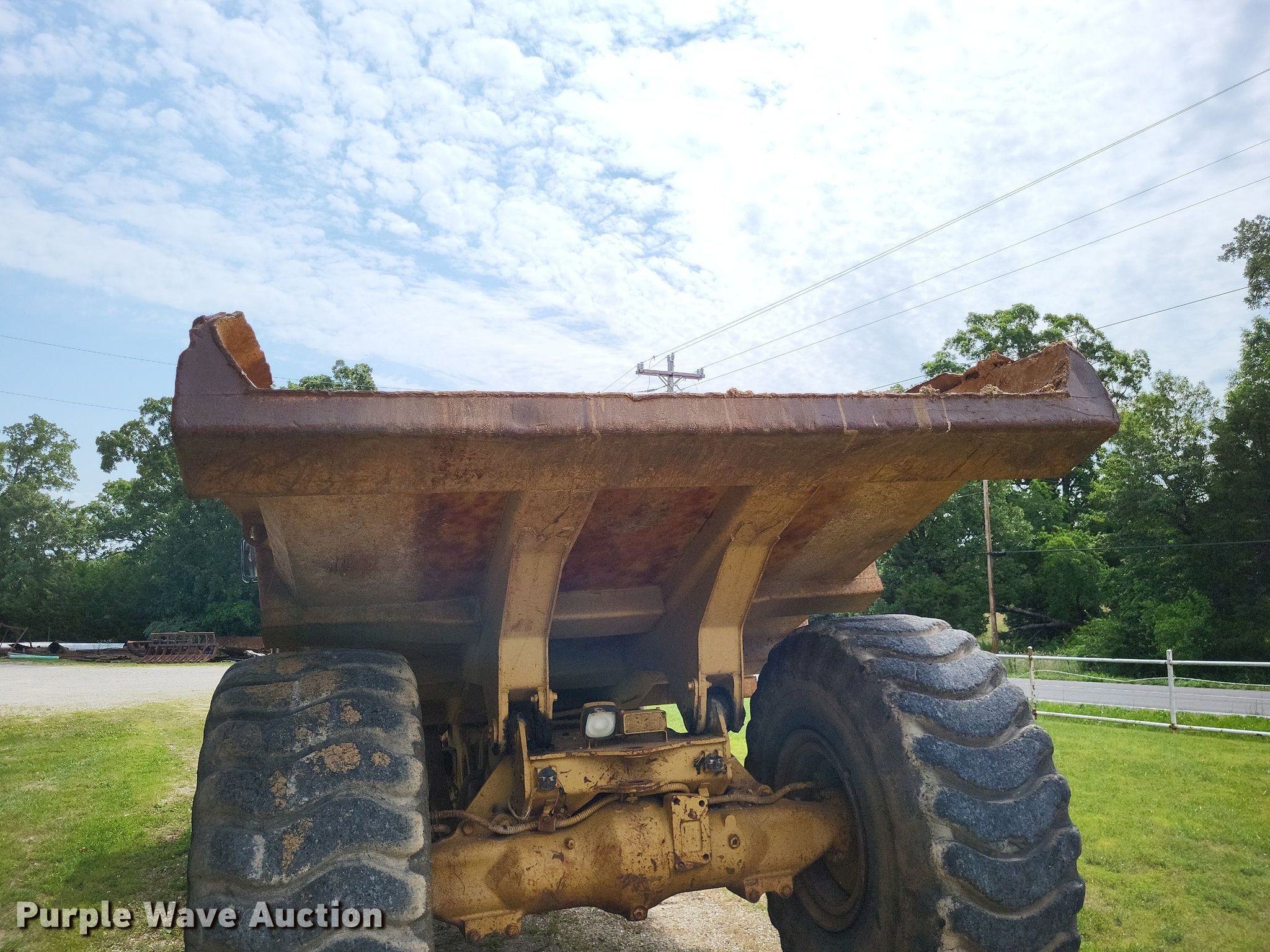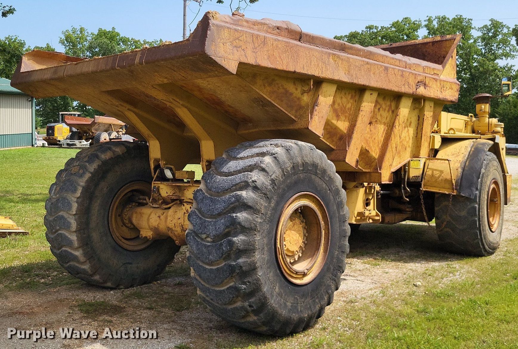 1990 Caterpillar D25D haul truck. Hours: 12,912 on meter, Serial: 1HK00123. Engine Caterpillar 3306, Cylinders: 6, Fuel type: Diesel, HP: 260. Transmission Powershift, 5F - 2R. Chassis Four wheel drive. Features Dump bed Capacity: 18.4 cu.yd., Capacity: 25 tons. Tires Size: 26.5R25. Notes Unattached door included, Non-operational brakes , Transmission leak. 2701 Highway 32 West. Salem, MO 65560