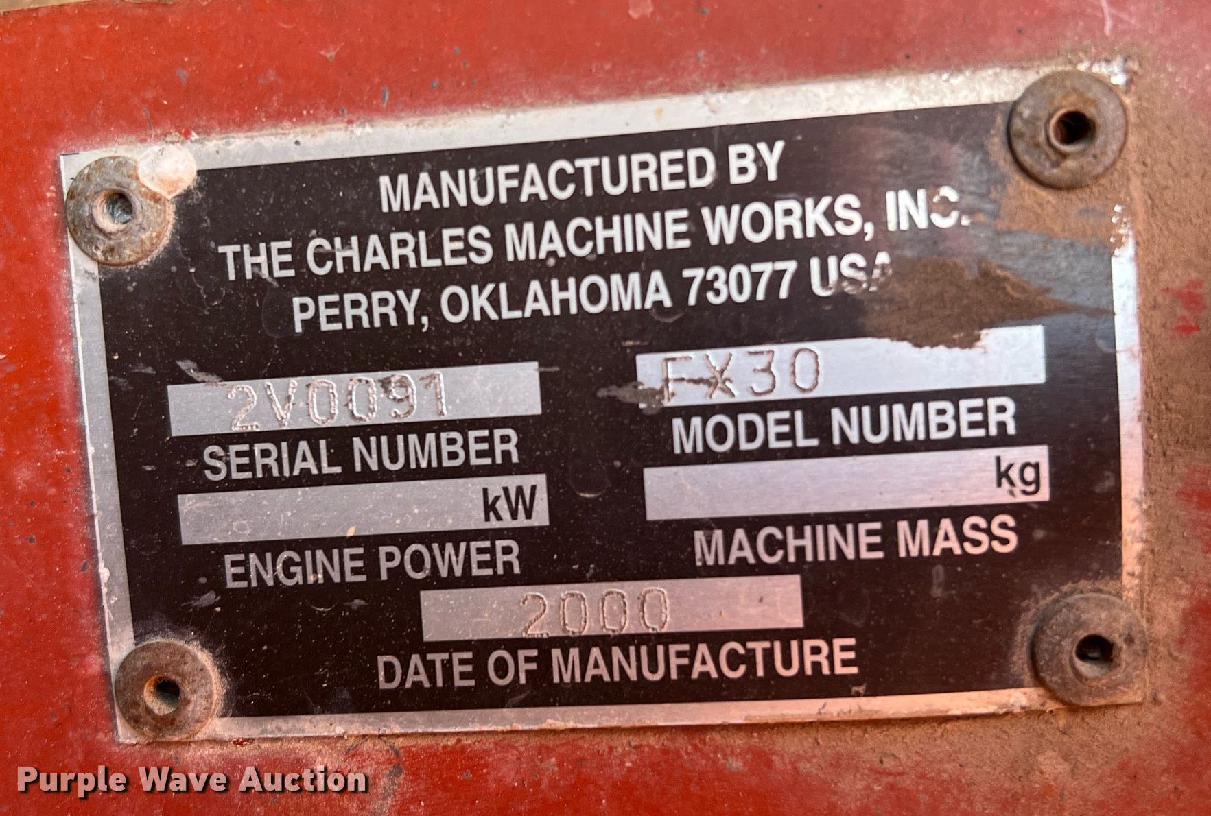 2000 Ditch Witch FX30 vacuum excavator. Hours: 3,591 on meter, VIN: 1DSB202S7117V2397, Serial: 2V0091. Engine Kubota, Cylinders: 3, Fuel type: Diesel. Features Spoils tank Capacity: 500 gallons, Water tank Capacity: 200 gallons, Water pump, Vacuum pump Inlet valve size: 3", Outlet valve size: 3", Suction hose Diameter: 3". Trailer 2001 The Charles Machine Works T18S, 22' L x 102" W, Ball hitch size: 2", Suspension: Spring, Brakes: Electric, Axles: Tandem, Tire size: 215/75R17.5, GVWR: 18,000 lbs. Notes Tank damaged. Texas title. Title distribution may be delayed up to 14 days from verification of funds. Isbell Construction. 701 N Patterson Ave. Florence, TX 76527