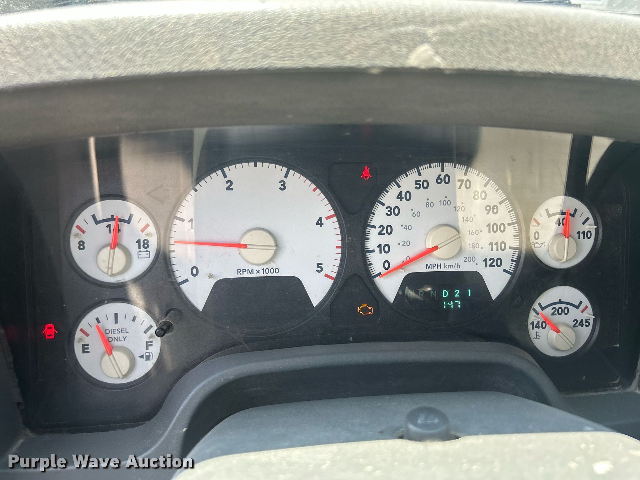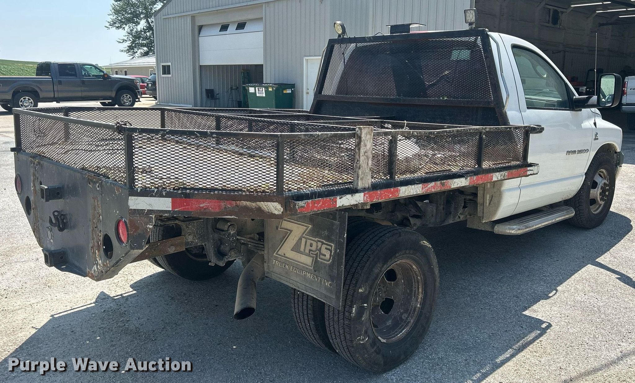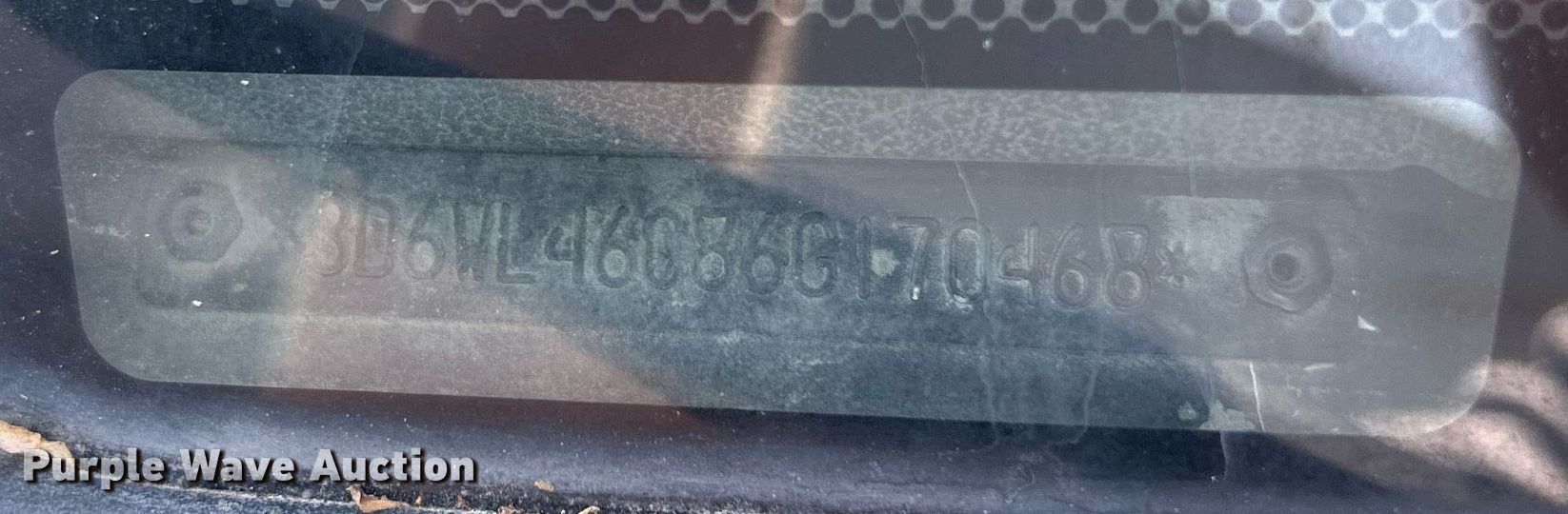 2006 Dodge Ram 3500 flatbed pickup truck. Miles: 176,147 on odometer, VIN: 3D6WL46C86G170468, Unit #: 5. Engine Displacement: 5.9L L6 OHV , Cylinders: 6, Fuel type: Diesel. Transmission Automatic. Interior AC, Heat, Cruise control. Features Flatbed 9' L x 102" W. Tires Size: 235/80R17. Notes Dash warning indicator: Check engine, Airbag, Windshield chipped or cracked. Iowa title. Title distribution may be delayed up to 14 days from verification of funds. Iowa Civil Contracting Inc. 1106 3rd Street. Victor, IA 52347