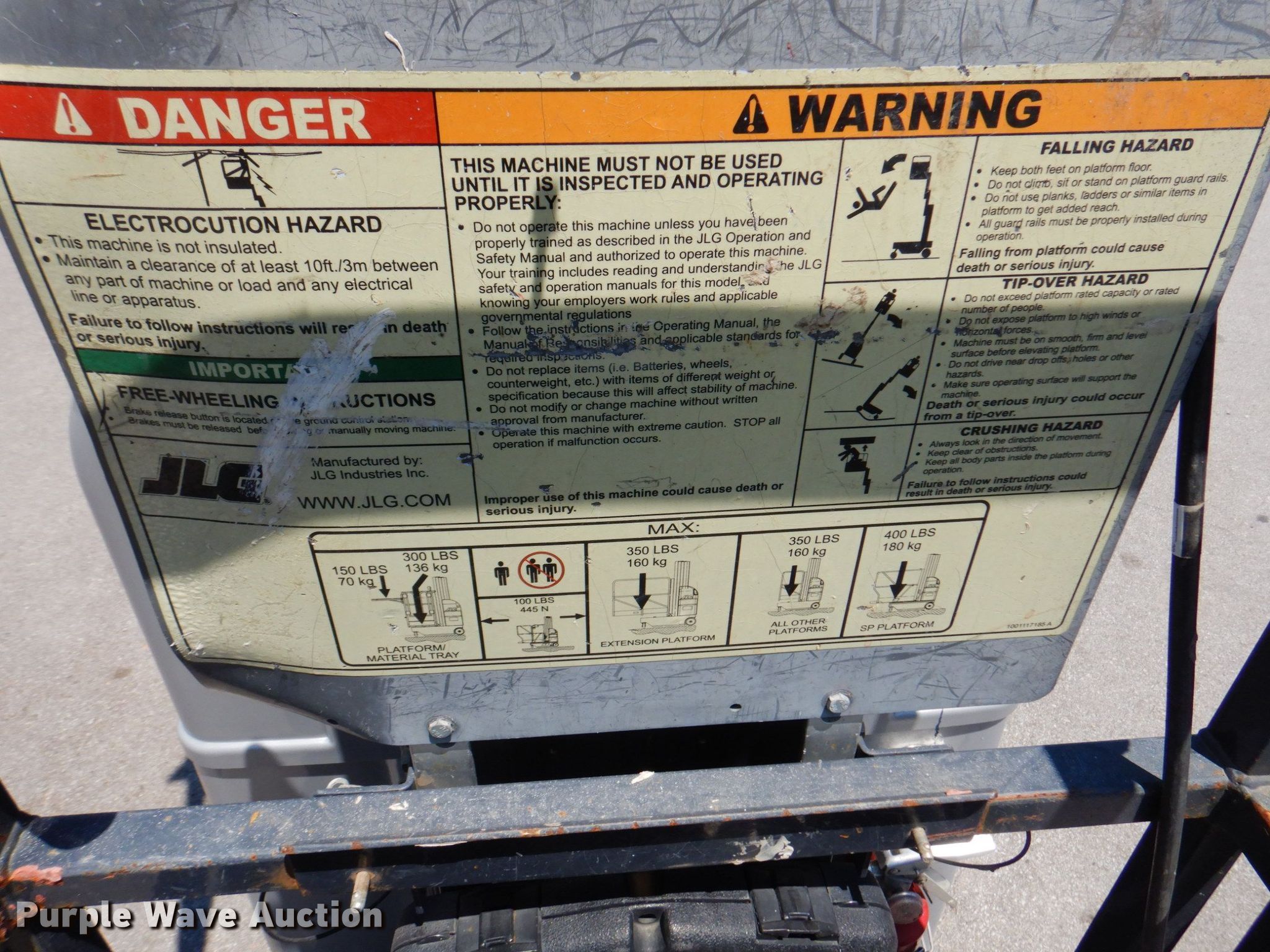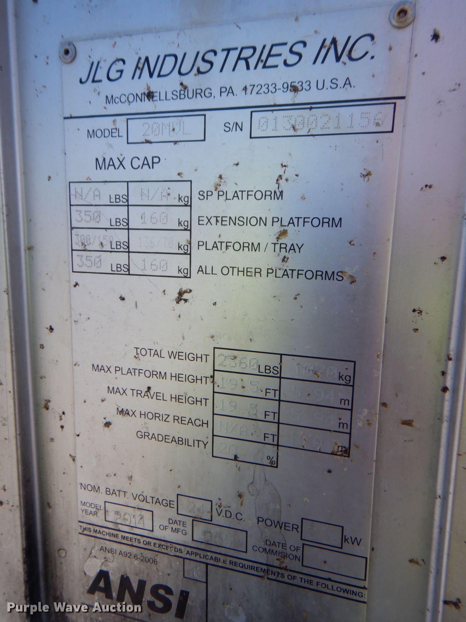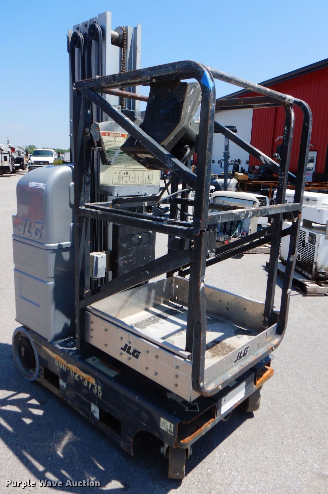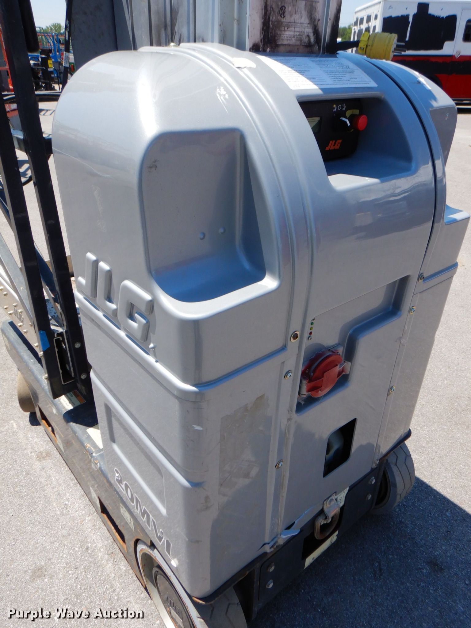 2014 JLG 20MVL vertical lift. Hours: Unknown, Serial: 0130021156. Features Maximum lift capacity: 350 lbs, Maximum lift height: 19' 6", Platform: 26.25" L x 25.5" W, AC power outlet, Controls: Remote, Motion alarms. Tires Tire size: 323x100, Non-marking. Notes Manuals. Jordan Machinery / S & N Auto Sales. 25050 US Hwy 275. Waterloo, NE 68069
