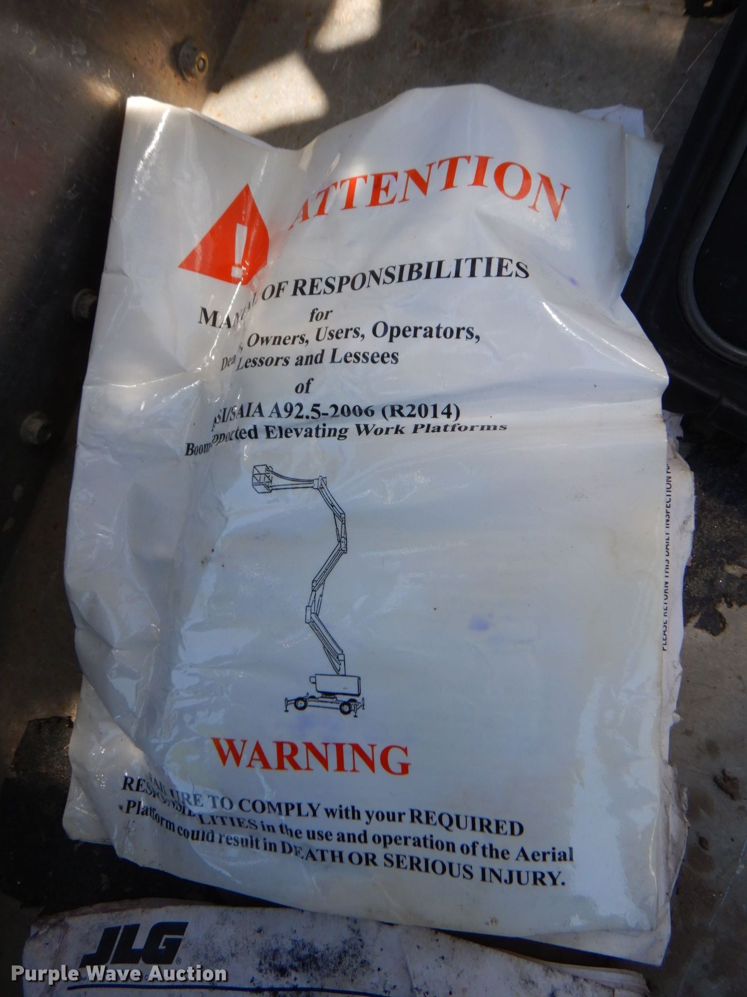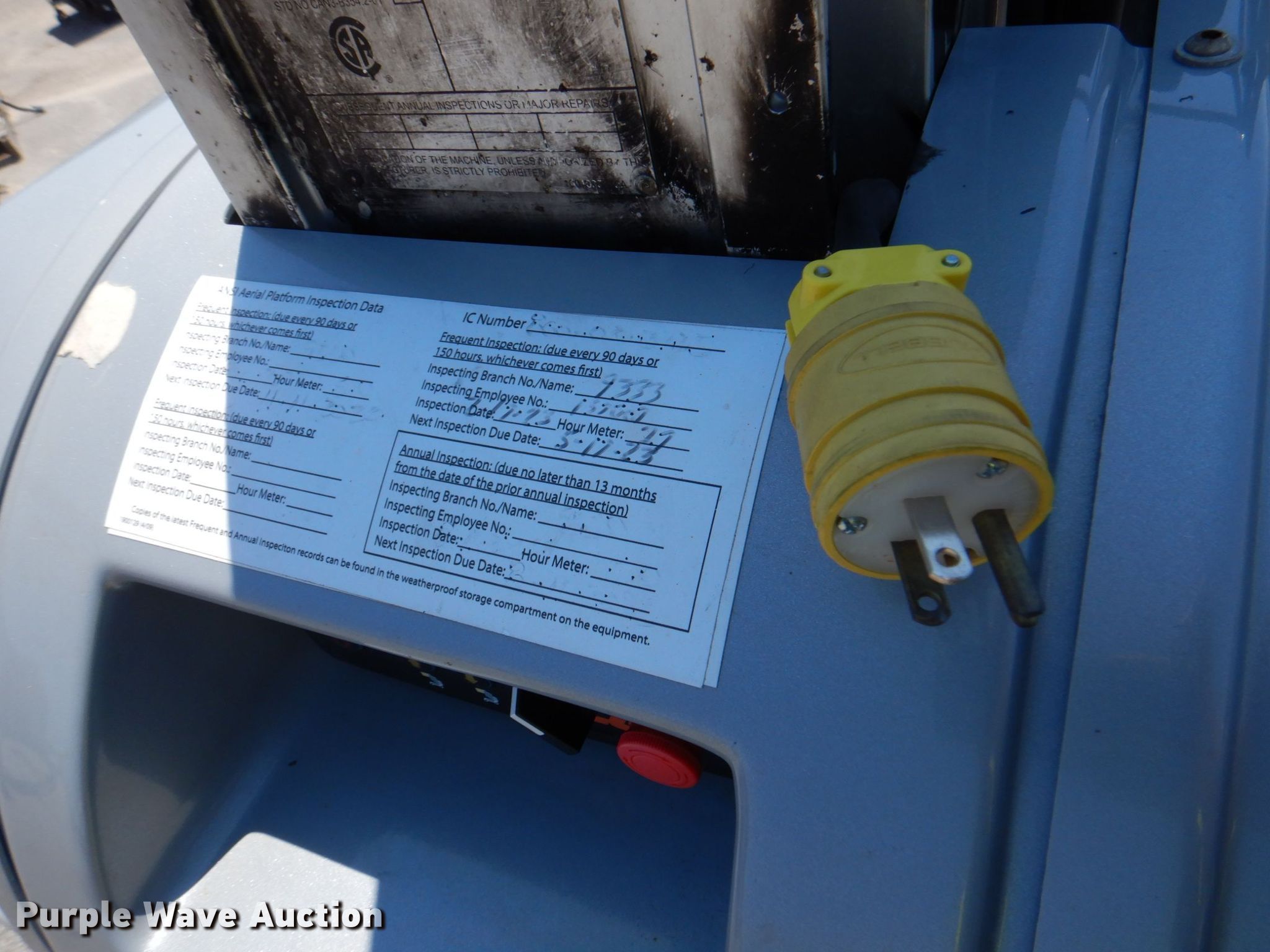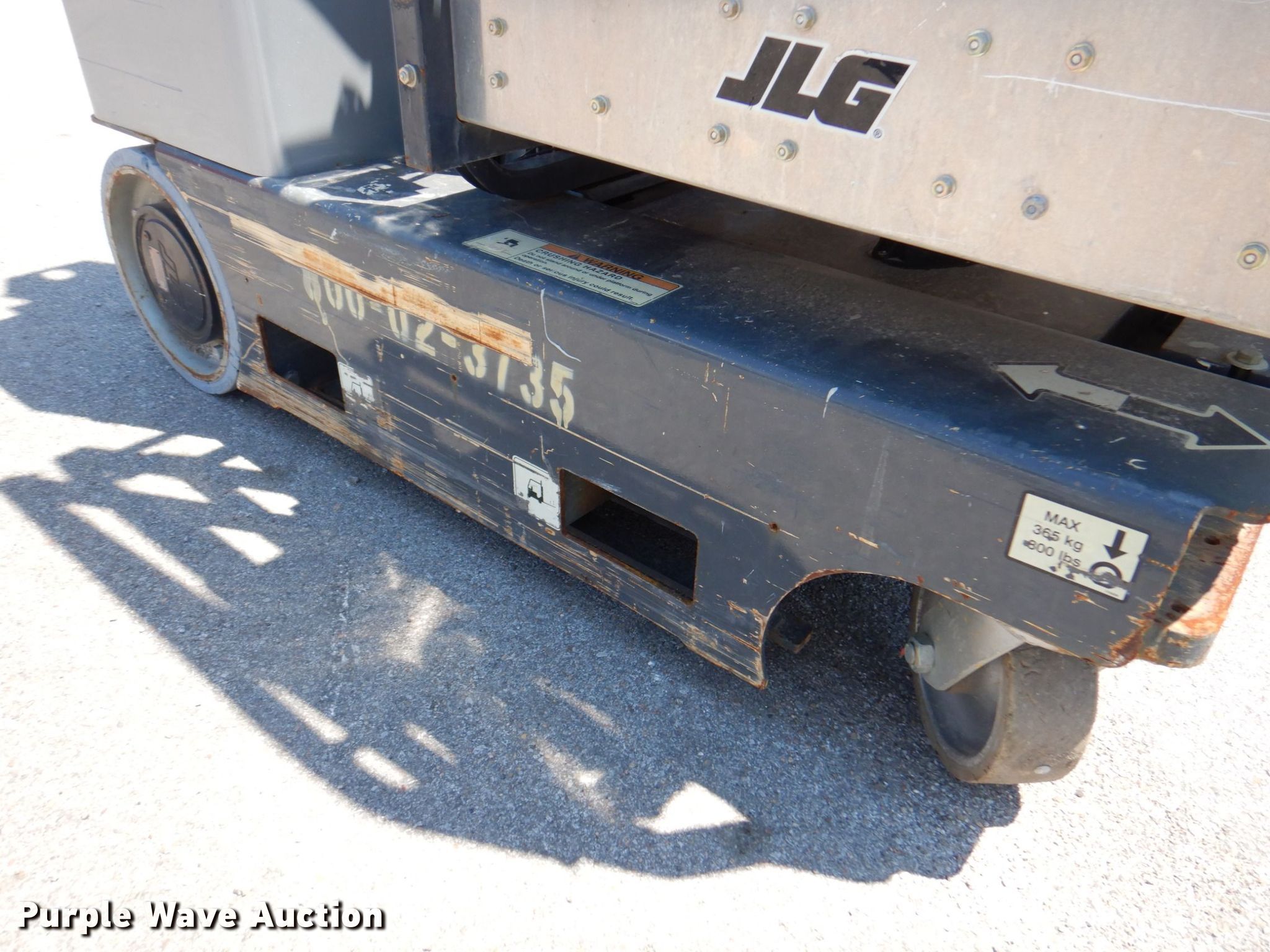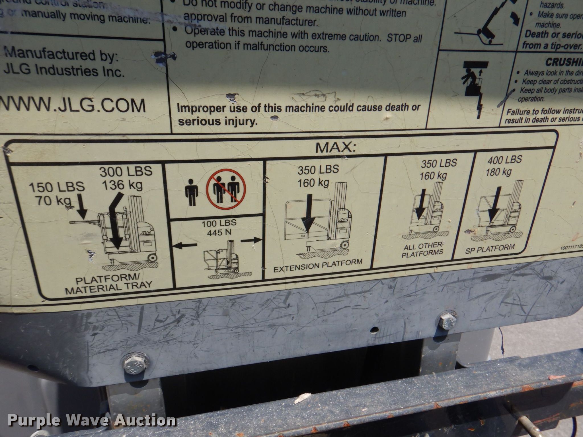 2014 JLG 20MVL vertical lift. Hours: Unknown, Serial: 0130021156. Features Maximum lift capacity: 350 lbs, Maximum lift height: 19' 6", Platform: 26.25" L x 25.5" W, AC power outlet, Controls: Remote, Motion alarms. Tires Tire size: 323x100, Non-marking. Notes Manuals. Jordan Machinery / S & N Auto Sales. 25050 US Hwy 275. Waterloo, NE 68069
