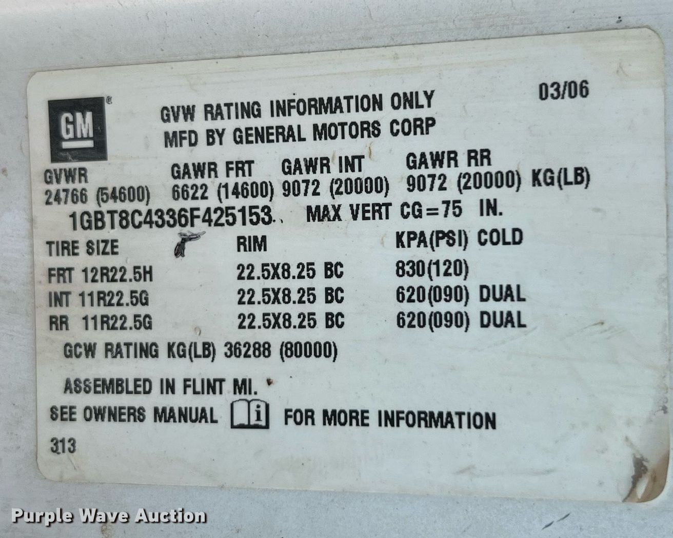 2006 Chevrolet C8500 dump truck. Miles: 167,930 on odometer, VIN: 1GBT8C4336F425153. Engine Isuzu 6HK1-TC, Displacement: 7.8L, Cylinders: 6, Fuel type: Diesel. Transmission Eaton Fuller, Manual. Chassis Axles: Tandem, Suspension: Spring over walking beam, Brakes: Air, PTO. Interior AC, Heat, Cruise control. Features Dump bed HiBilt, 15' 11" L x 96" W, Side height: 39", Side board height: 12", Bed type: Steel, Ram: Single , End gate: Air operated. Tires Front: 315/80R22.5, Rear: 11R22.5. Notes High pressure fuel pump, fuel rail, and injectors replaced in January 2023, Dash warning indicator: Check engine, ABS, Windshield chipped or cracked. View repairs. Missouri title. Title distribution may be delayed up to 14 days from verification of funds. Jim Moore Retirement Auction. 4880 Jade Road. Kingdom City, MO 65262