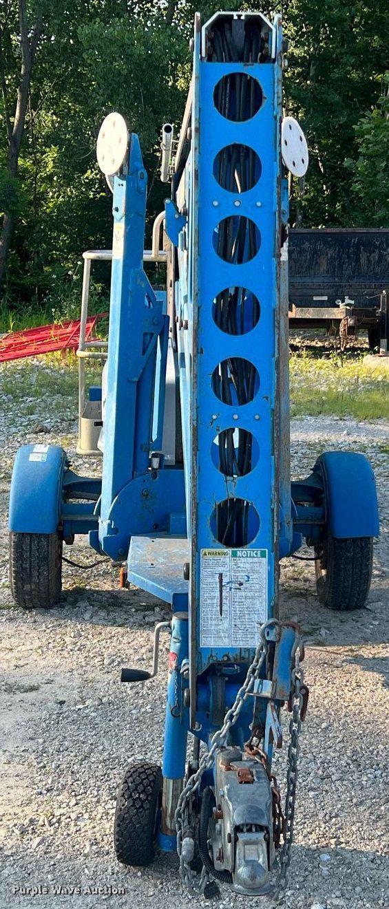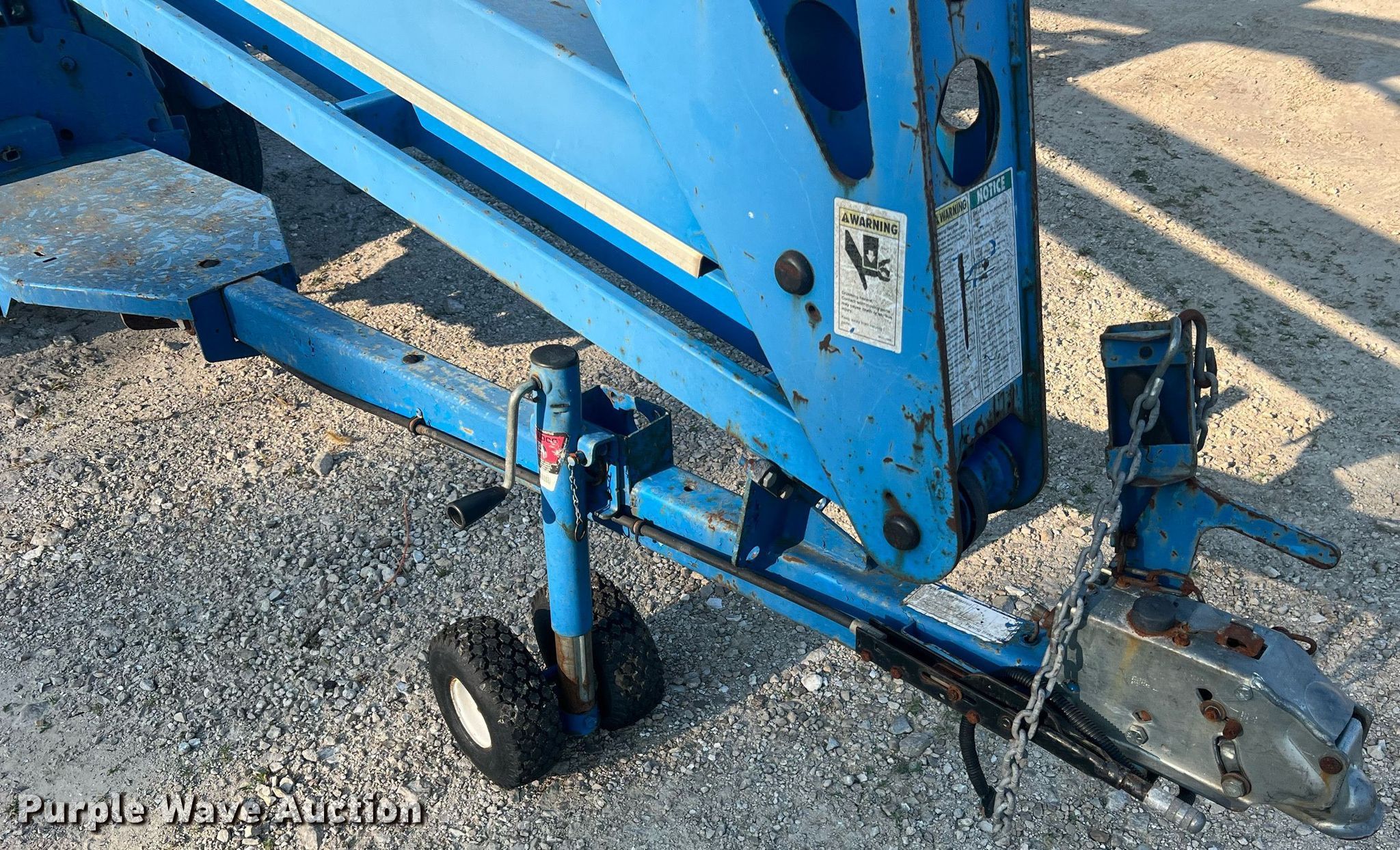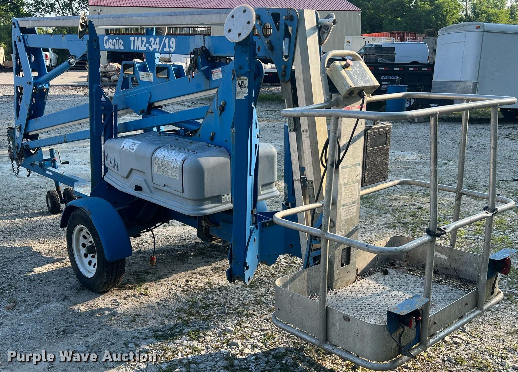 2000 Genie TMZ-34/19 boom lift. Hours: 288 on meter, VIN: 1G9AA1913YR252247, Serial: T3400-247. Electric Motor Volts: 24. Features Tow behind, Maximum lift capacity: 500 lbs, Maximum reach length: 19', Maximum lift height: 34', Hydraulic outriggers, Platform: 29" L x 48" W, AC power outlet, Controls: Platform, Ground, Travel speed: 28 mph. Tires Tire size: 185R14C. Notes Dead battery, Intermittent operating issues. This is worksite support equipment and will not come with a title. Transfer of ownership documentation will be a bill of sale. Quality Cut Lawn Care LLC. 600 Hillsdale Rd. Columbia, MO 65201
