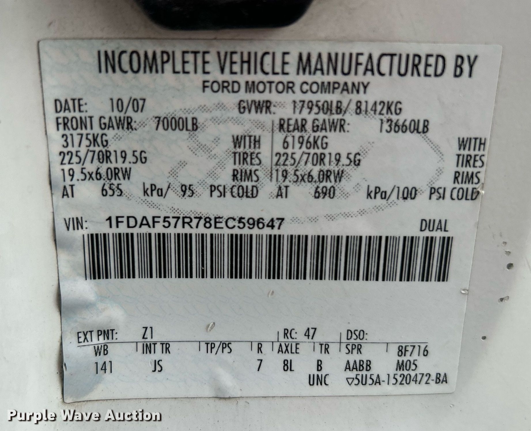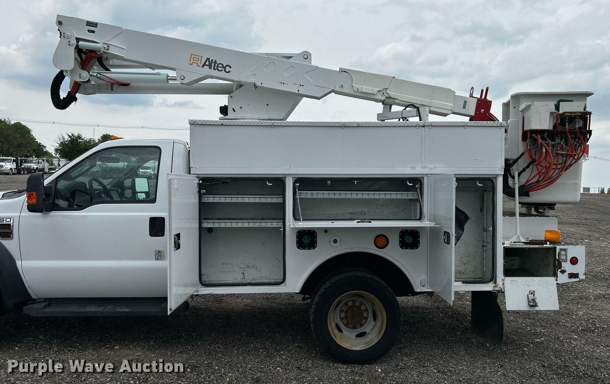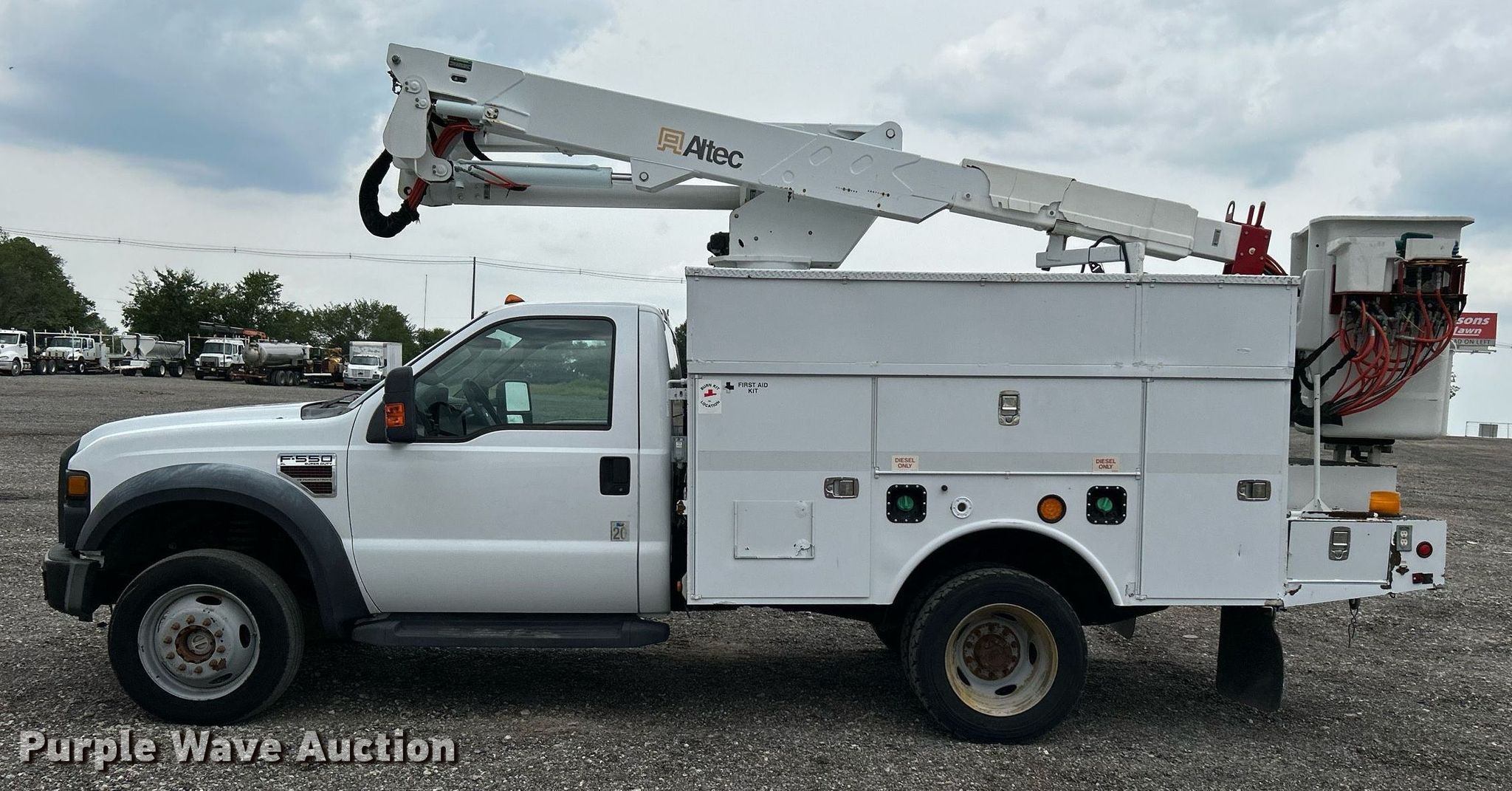 2008 Ford F550 Super Duty bucket truck. Miles: 154,062 on odometer, VIN: 1FDAF57R78EC59647. Engine Displacement: 6.4L, Cylinders: 8, Fuel type: Diesel. Transmission Automatic. Chassis Four wheel drive, Axles: Single, Suspension: Spring, Brakes: Hydraulic, PTO, GVWR: 17,950 lbs, Wheelbase: 141". Interior AC, Heat, Heated mirrors, Cruise control, Auxiliary controls. Features Bed Altec SO CAL, Serial: 856-9630634, 9' L x 93" W, Boom 2008 Altec AT37-G, Serial: 1007DE8948, Maximum lift capacity: 350 lbs, Maximum lift height: 37.5', Boom type: Articulating, Insulated, Man basket, Boom controls Platform/ basket.. Tires Size: 225/70R19.5. Notes Hood damage. Oklahoma title. Title distribution may be delayed up to 14 days from verification of funds. 15107 North 137th East Avenue. Collinsville, OK 74021