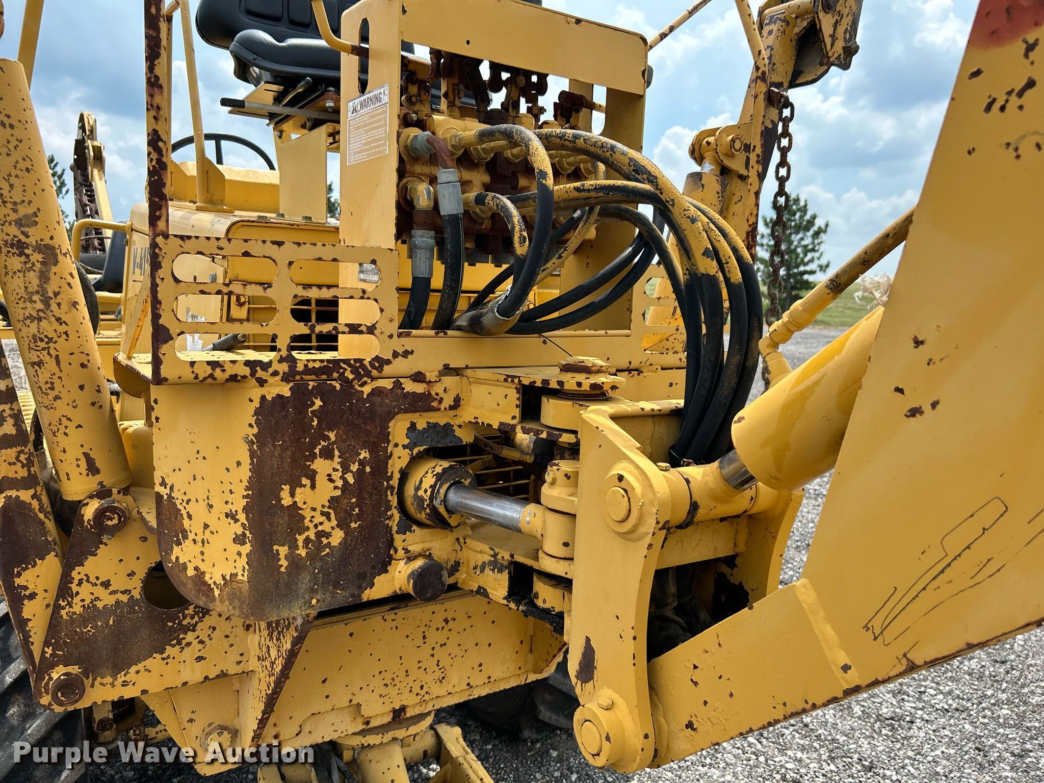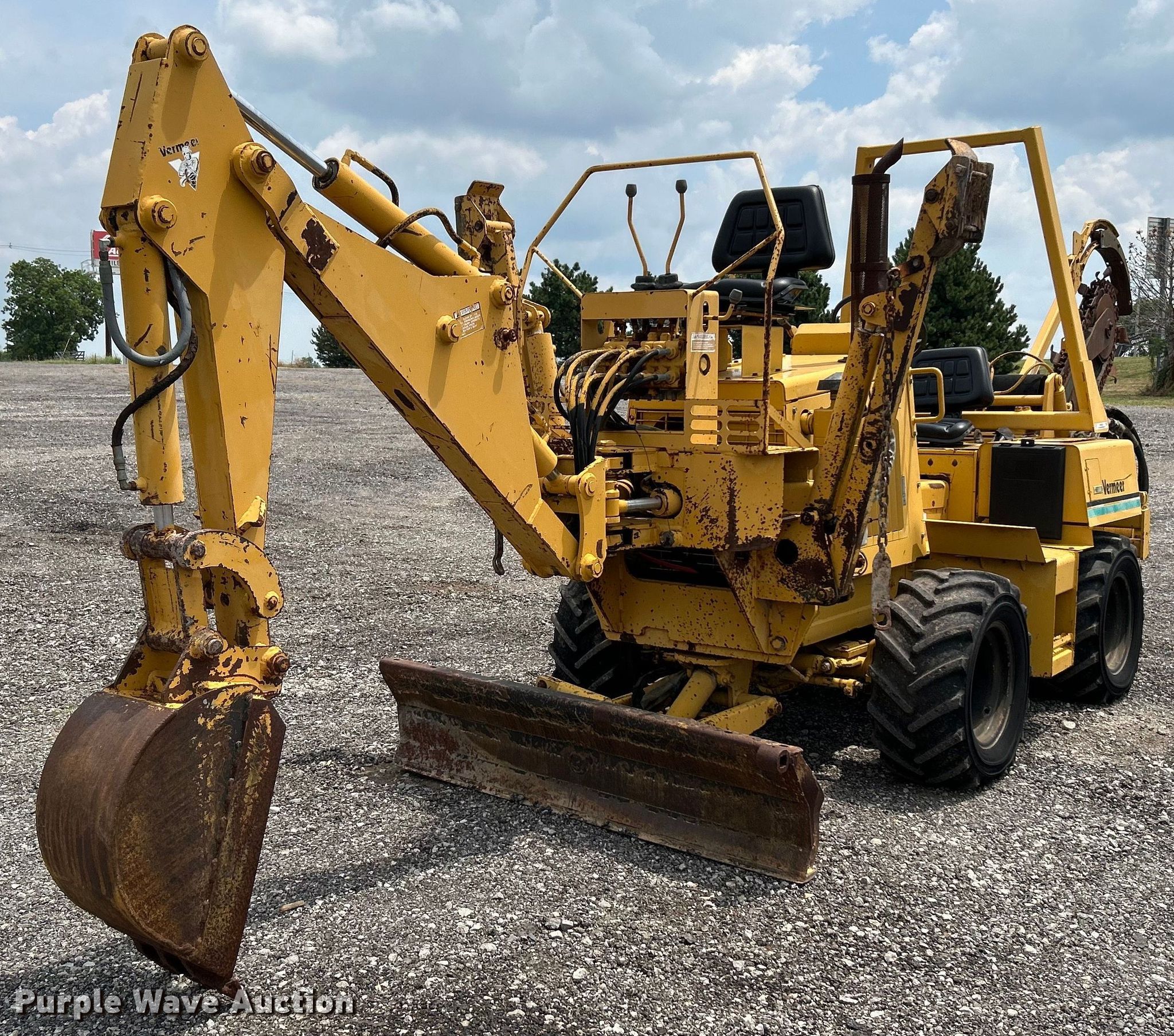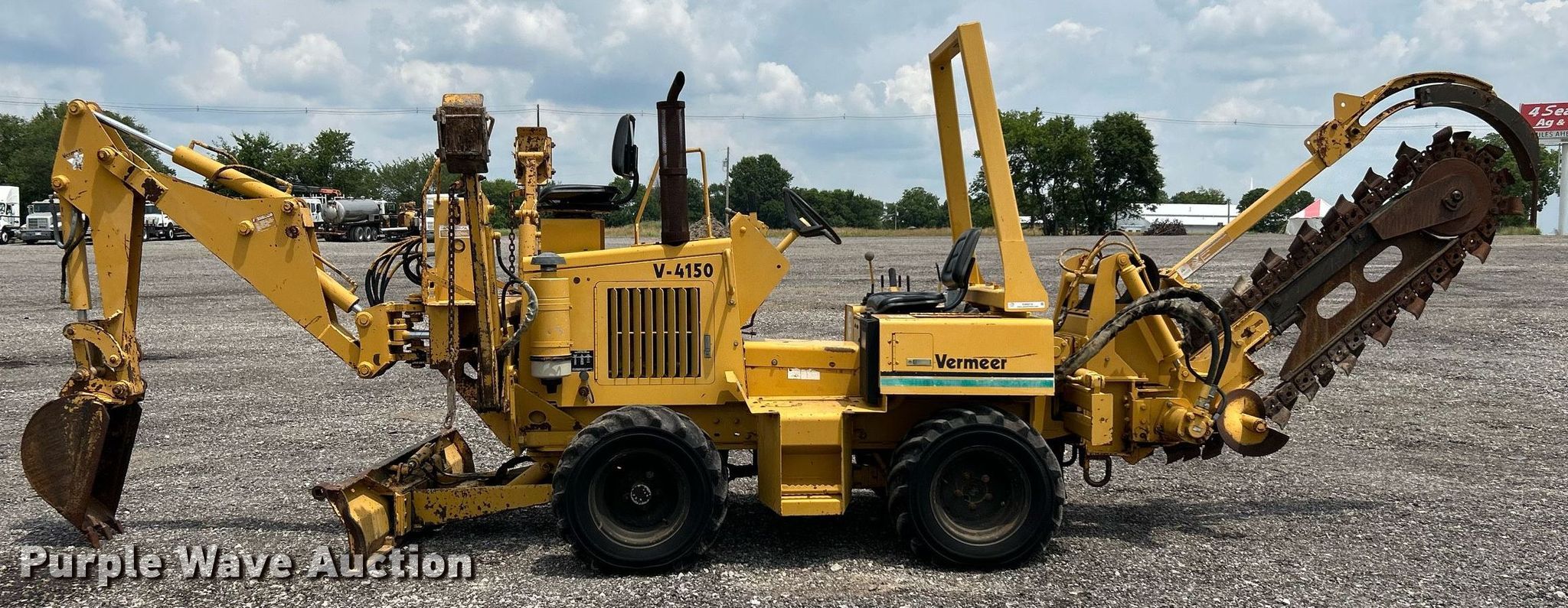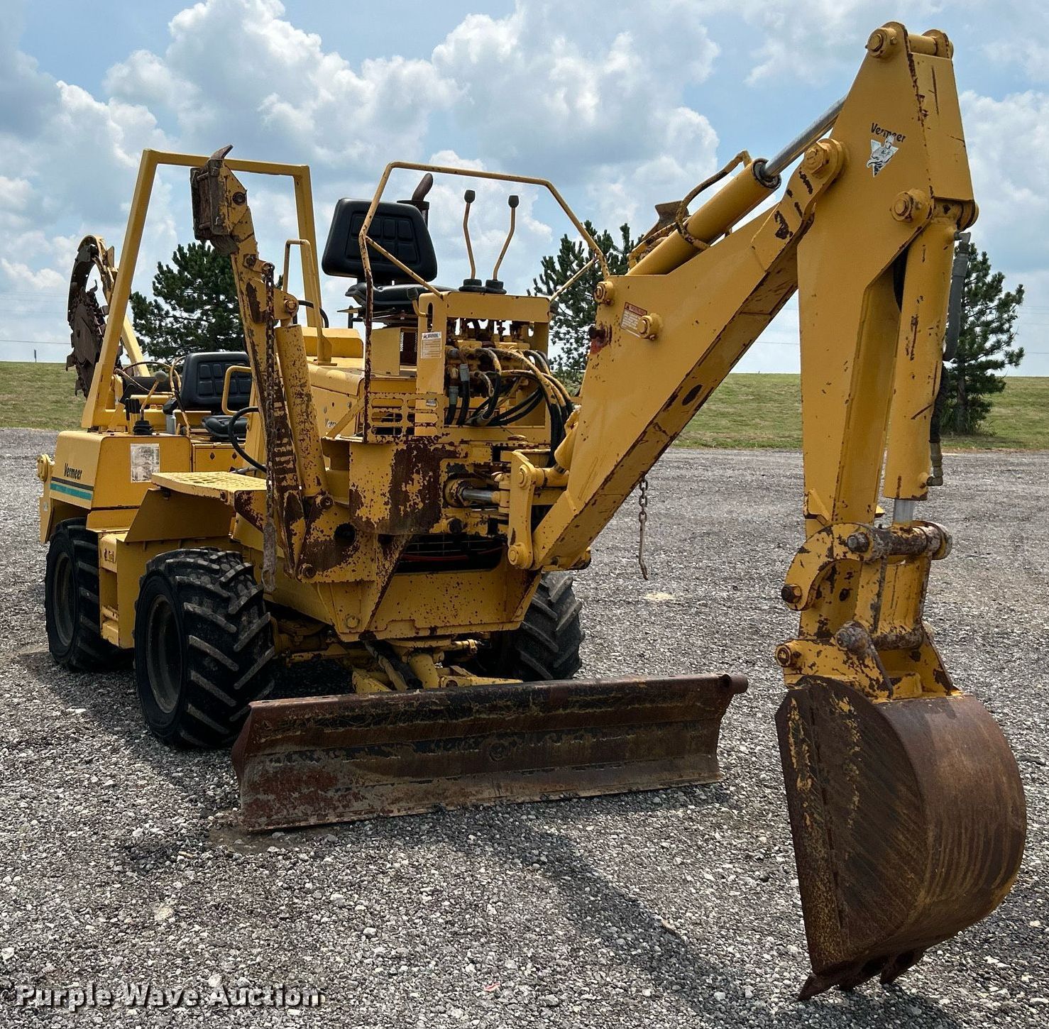 1994 Vermeer V4150 trencher. Hours: 1,028 on meter, Serial: 1VTF08207R1000462. Engine Deutz, Cylinders: 3, Fuel type: Diesel. Transmission Hydrostatic, Four wheel drive. Operators station OROPS. Features Trencher Model: V1650, Serial: 1VRL070R6R1000659, Estimated dig depth: 60", Wheel diameter: 14", Cutting width: 5", Teeth: Dirt, Crumber, Backhoe Model: V730A, Serial: 1VRJ080T0R10005536, Bucket width: 12", Backfill blade Width: 64". Tires Size: 29x12.50-15. 15107 North 137th East Avenue. Collinsville, OK 74021