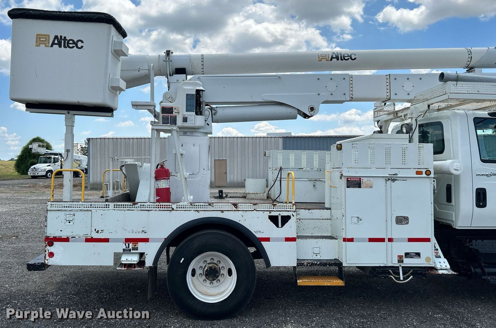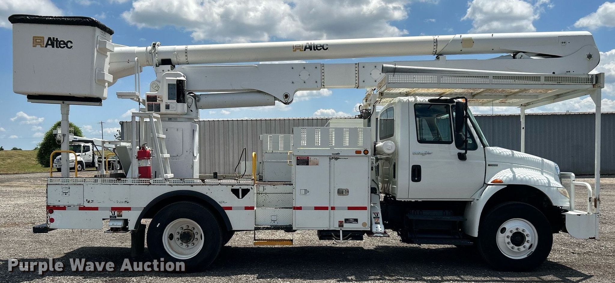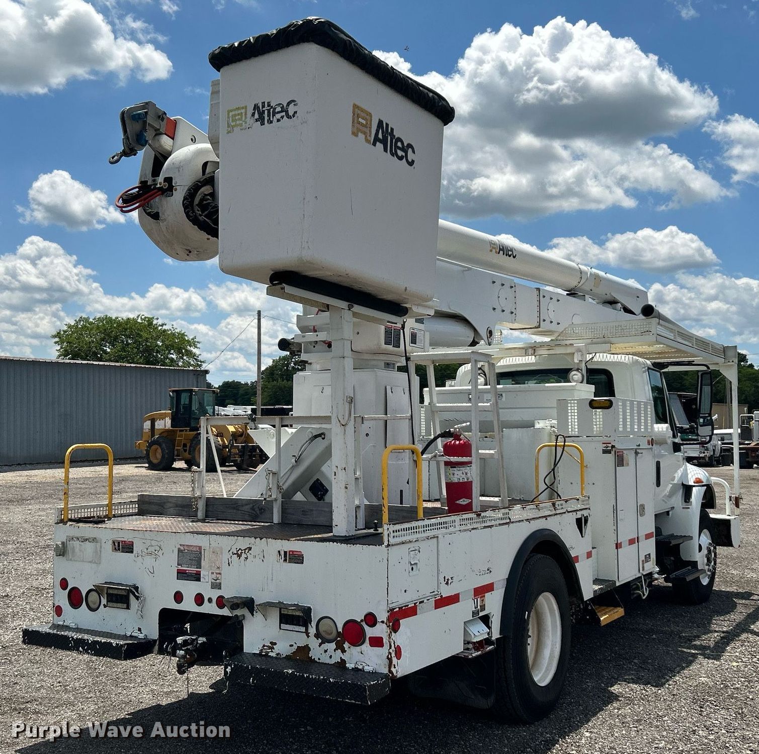 2010 International 4400 bucket truck. Miles: 124,087 on odometer, Hours: 12,205 on meter, VIN: 1HTMKAAN3AH196100. Engine International MaxxForce DT, Displacement: 7.6L, Cylinders: 6, Fuel type: Diesel. Transmission Automatic. Chassis Axles: Single, Suspension: Spring, Brakes: Air, PTO, GVWR: 33,000 lbs. Interior AC, Heat, Cruise control. Features Bed Altec, 15' 2" L x 92" W, Boom Altec AA55E, Serial: 0709EM0686, Maximum lift capacity: 700 lbs, Maximum lift height: 55', Boom type: Articulating, Insulated, Man basket, Boom controls Ground, Platform/ basket.. Tires Size: 11R22.5. Notes Windshield chipped or cracked. Oklahoma title. Title distribution may be delayed up to 14 days from verification of funds. 15107 North 137th East Avenue. Collinsville, OK 74021