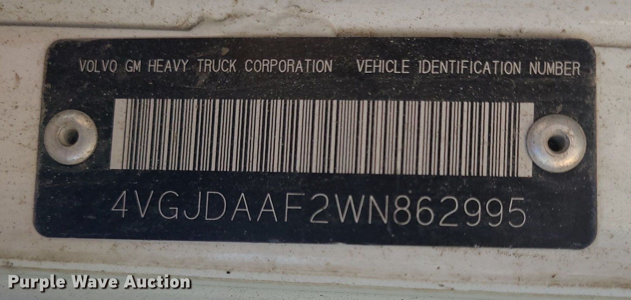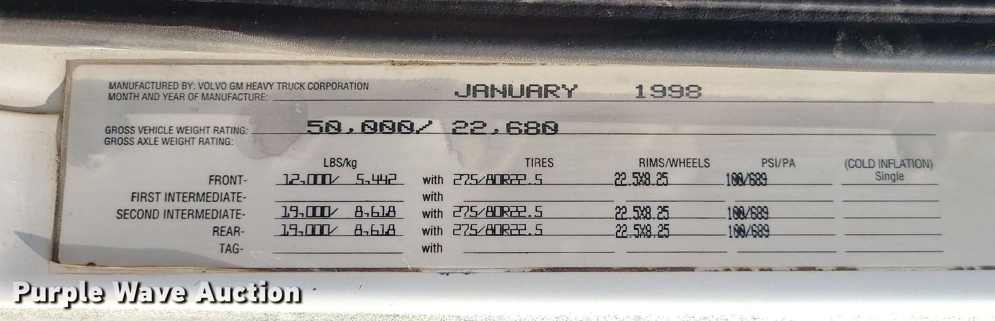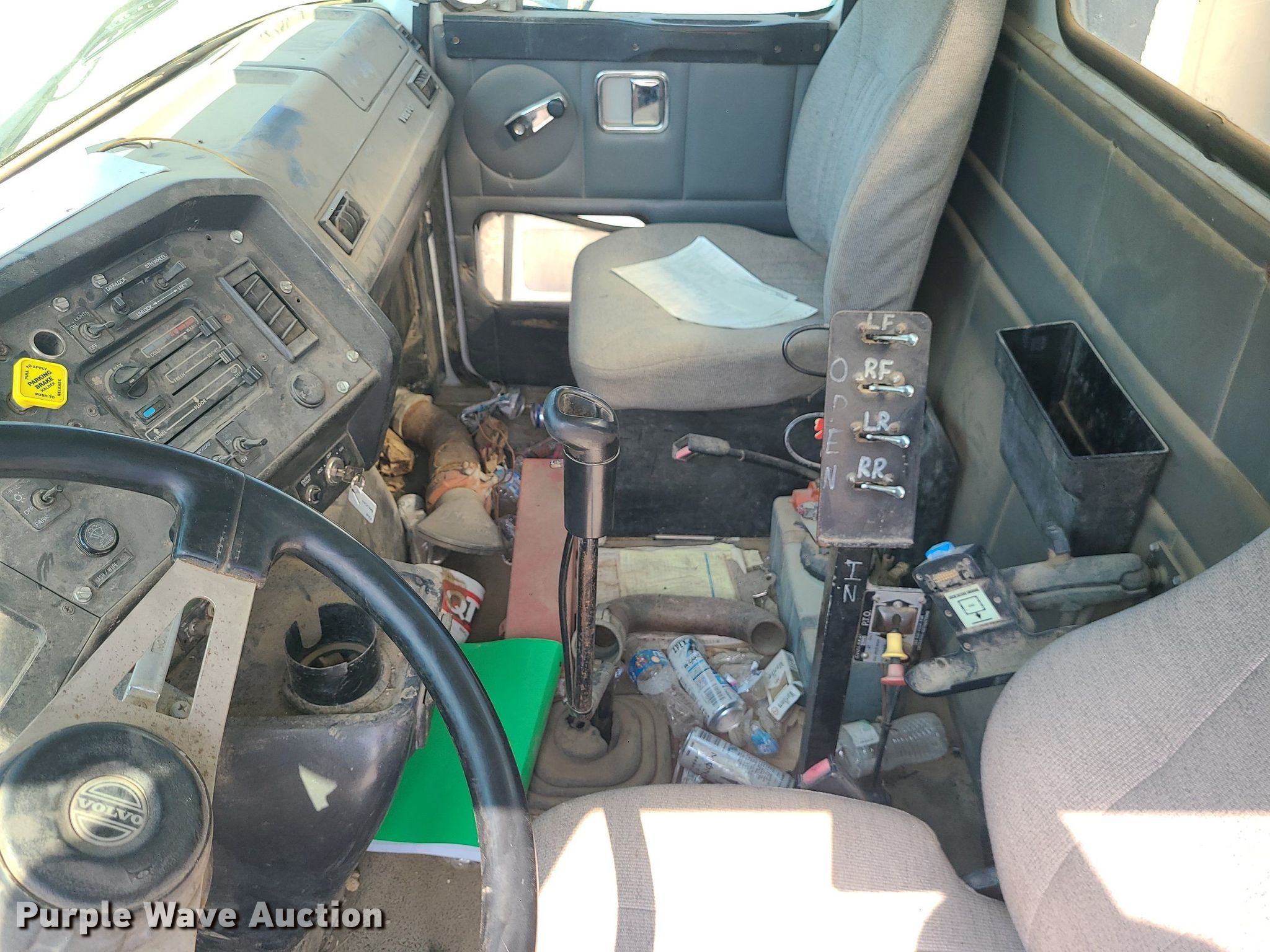 1998 Volvo WG water truck. Miles: 1,421 on odometer, VIN: 4VGJDAAF2WN862995. Engine Caterpillar 3208, Displacement: 10.4L, Cylinders: 8, Fuel type: Diesel. Transmission Manual. Chassis Axles: Triple, Pusher axle, Differential lock: Inter-axle, Suspension: Spring, Brakes: Air. Interior Heat, Cruise control. Features Bed / tank Walker Stainless Equipment Co., 18' L x 96" W, Spray bar: Front, Rear, Top fill. Tires Front: 315/80R22.5, Rear: 11R22.5, Lift axle: 295/75R22.5. Notes Dash warning indicator: ABS. Missouri title. Title distribution may be delayed up to 14 days from verification of funds. Superior Bowen Asphalt Co.. 15301 Broadmoor Street. Overland Park, KS 66223