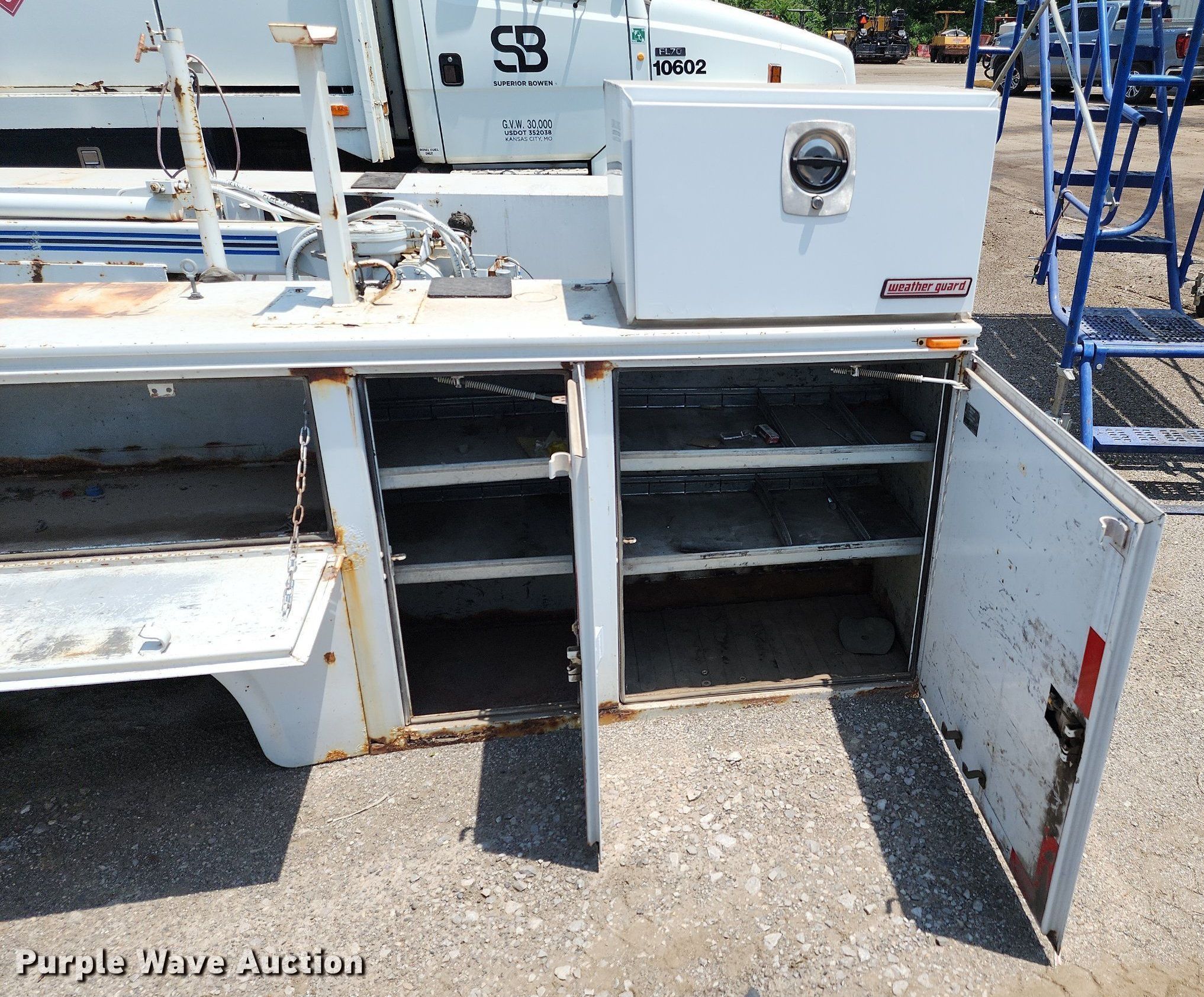Knapheide 6132D54J utility bed. 11' L x 98" W, Crane Auto Crane, Capacity: 3,200 lbs. Superior Bowen Asphalt. 2501 Manchester Trafficway. Kansas City, MO 64129