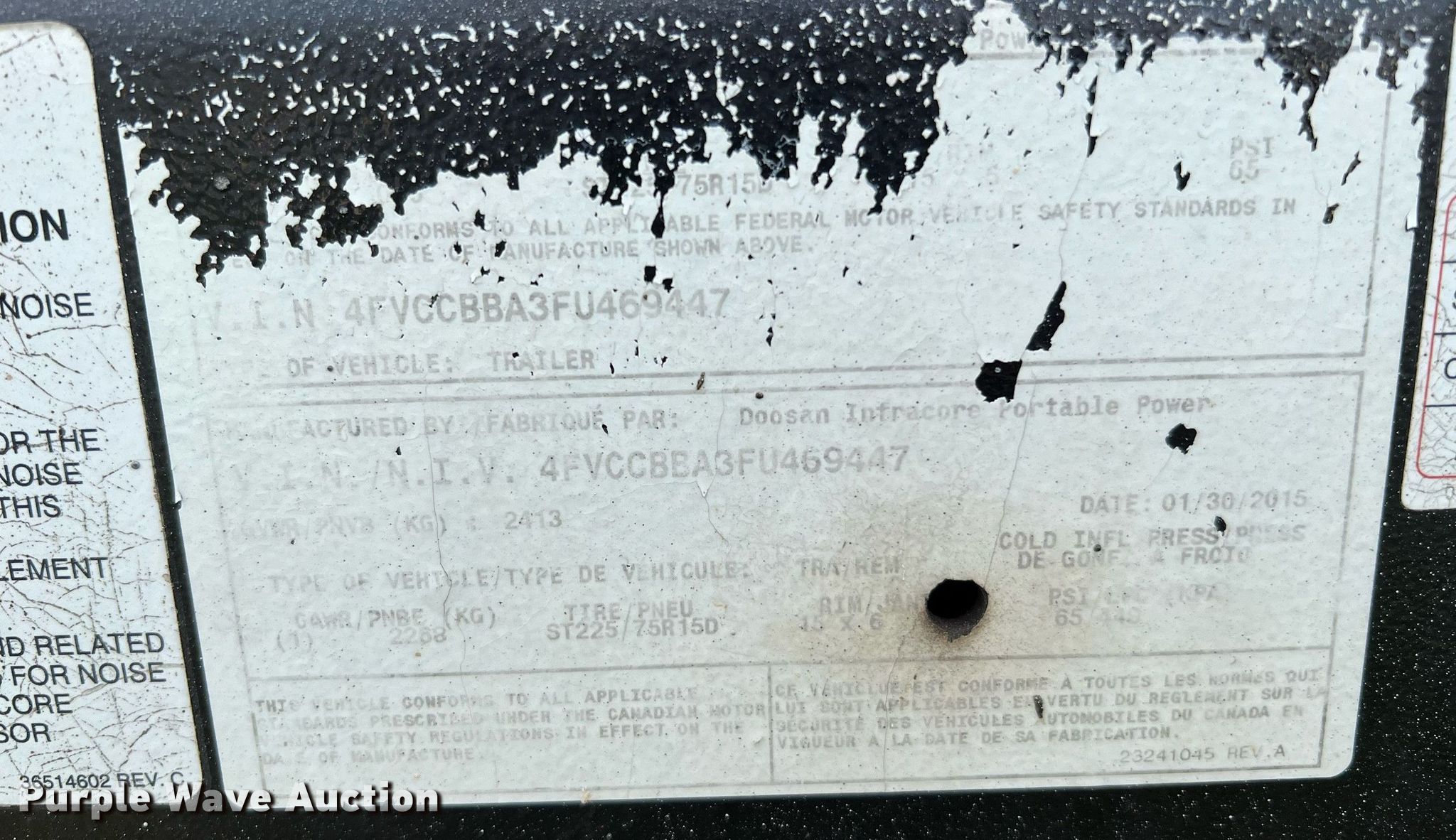 2015 Doosan P425/HP375 air compressor. Hours: 5,028 on meter, VIN: 4FVCCBBA3FU469447. Engine Cylinders: 4, Fuel type: Diesel. Trailer 12' 6" L x 76" W, Ball hitch size: 2", Suspension: Spring, Brakes: Electric, Tire size: 225/75R15. Notes Missing trailer plug. This is worksite support equipment and will not come with a title. Transfer of ownership documentation will be a bill of sale. Plunkett Enterprises. 1825 County Road 212. Angleton, TX 77515