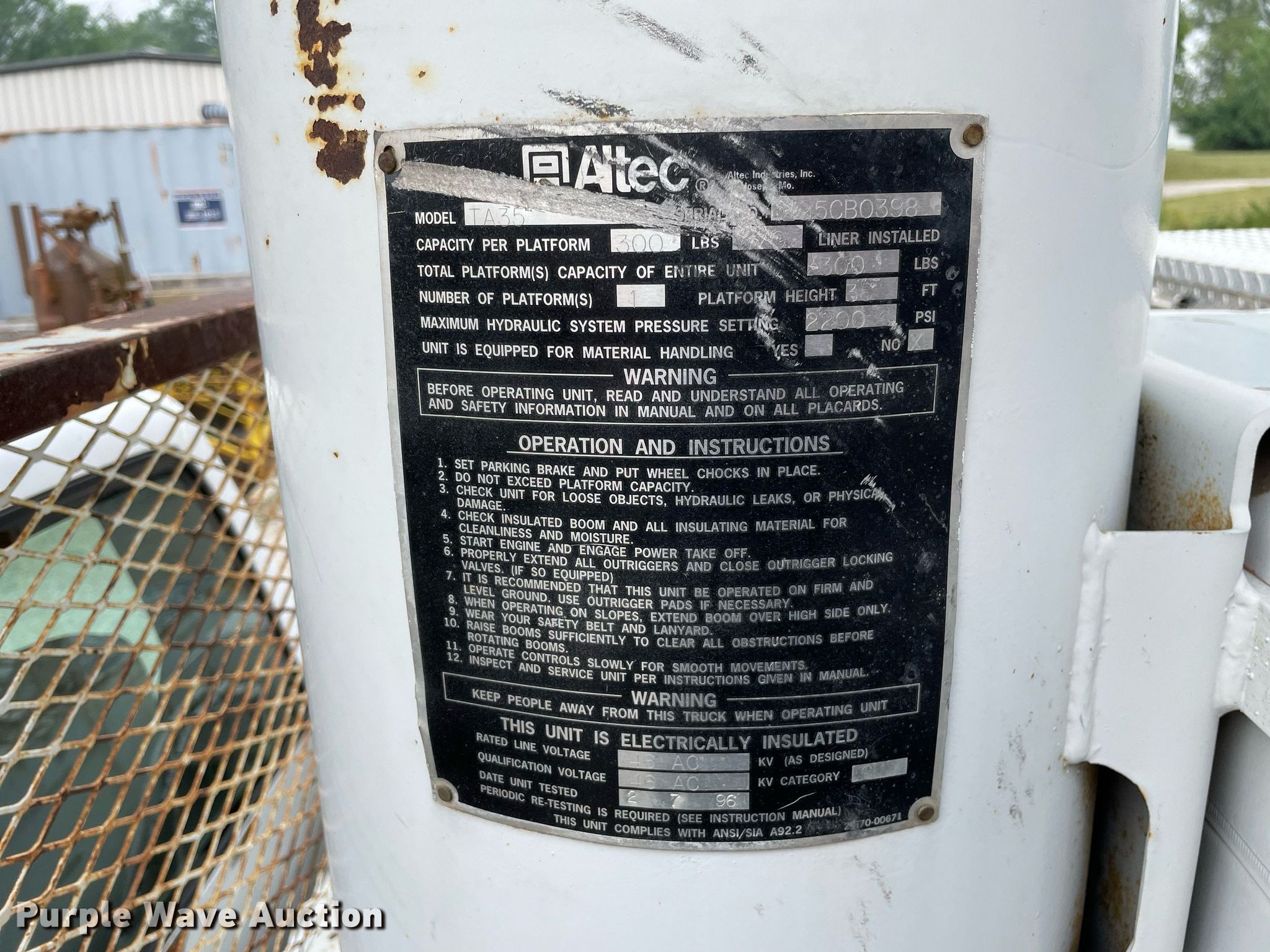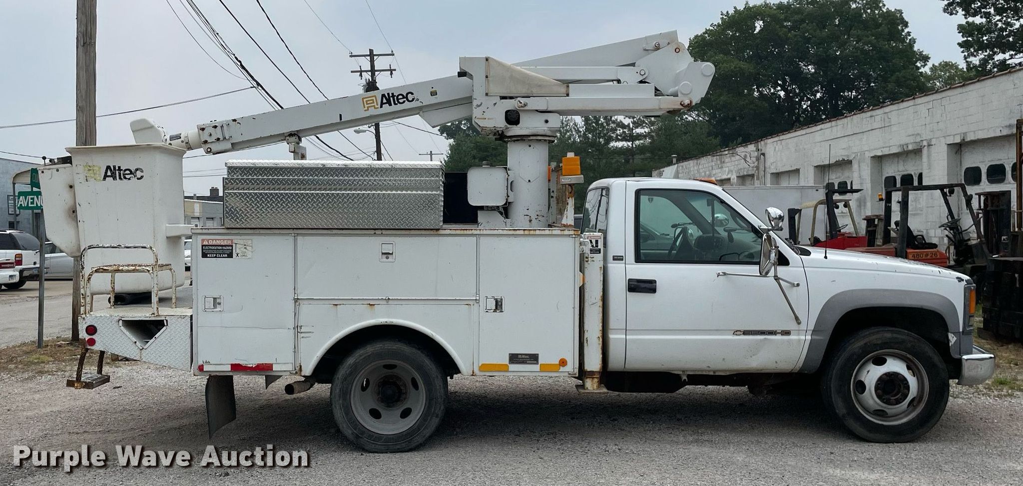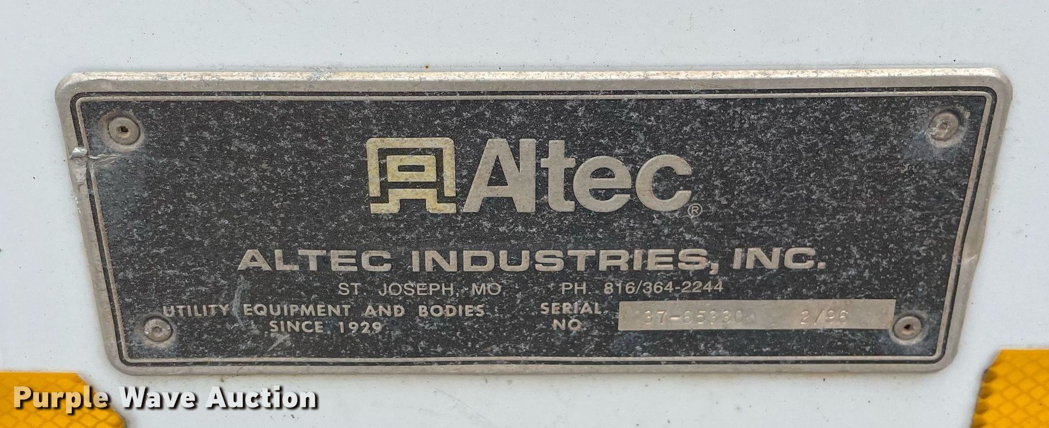 1996 Chevrolet C3500 bucket truck. Miles: 131,724 on odometer, VIN: 1GBKC34F8TJ104173. Engine Displacement: 6.5L, Cylinders: 8, Fuel type: Diesel. Transmission Automatic. Chassis Axles: Single, Suspension: Spring, Brakes: Hydraulic, PTO. Interior AC, Heat. Features Bed Altec, Serial: 37-65330, 8' 6" L x 92" W, Boom 1996 Altec TA35, Maximum lift capacity: 300 lbs, Maximum lift height: 35', Boom type: Articulating, Insulated, Telescopic, Man basket, Boom controls Ground, Platform/ basket.. Tires Size: 225/70R19.5. Notes Unknown operating condition passenger outrigger, Non-operational fuel gauge. View repairs. Illinois title. Title distribution may be delayed up to 14 days from verification of funds. Lancaster Construction Co.. 806 Warrington Ave. Danville, IL 61832