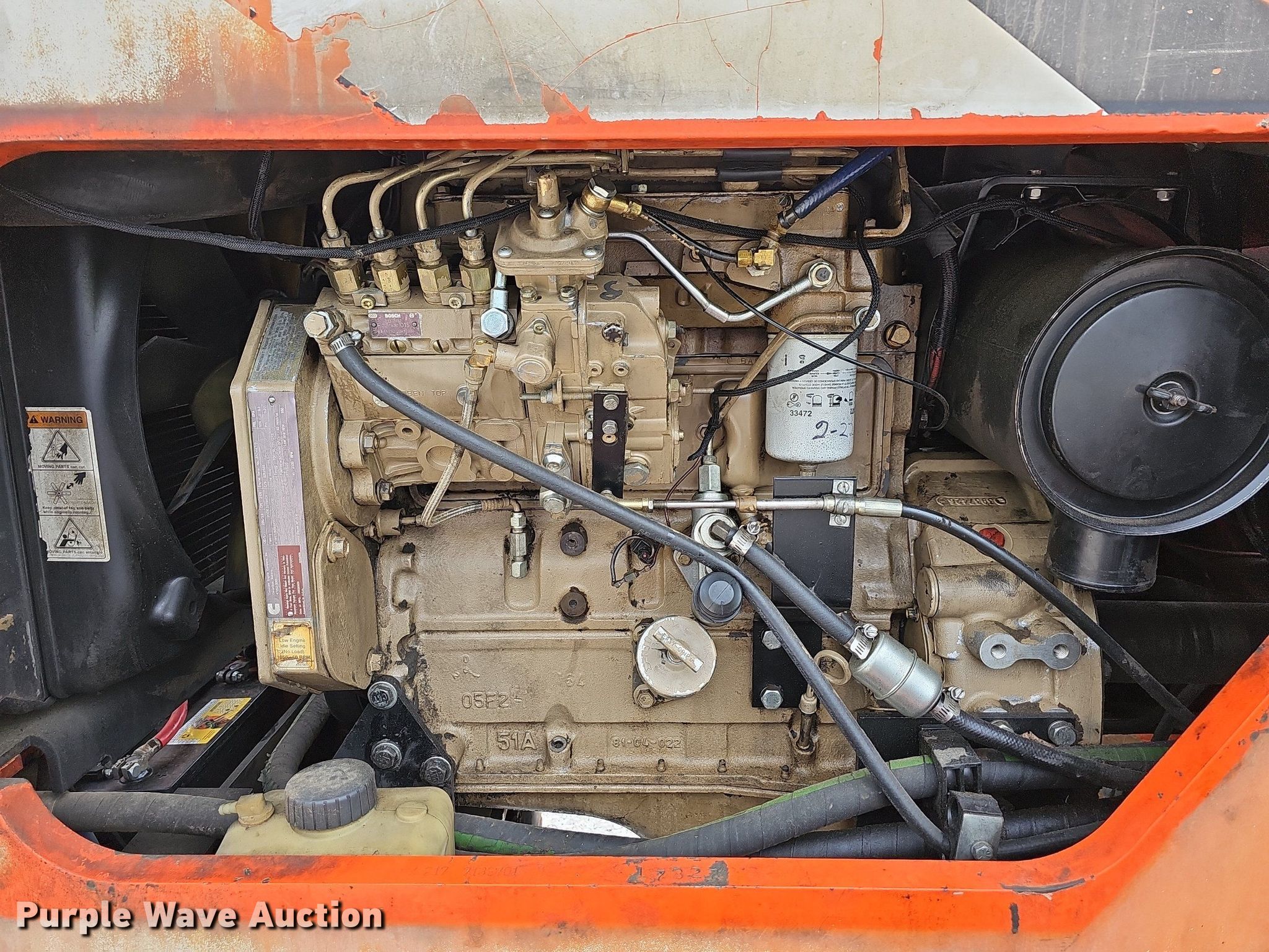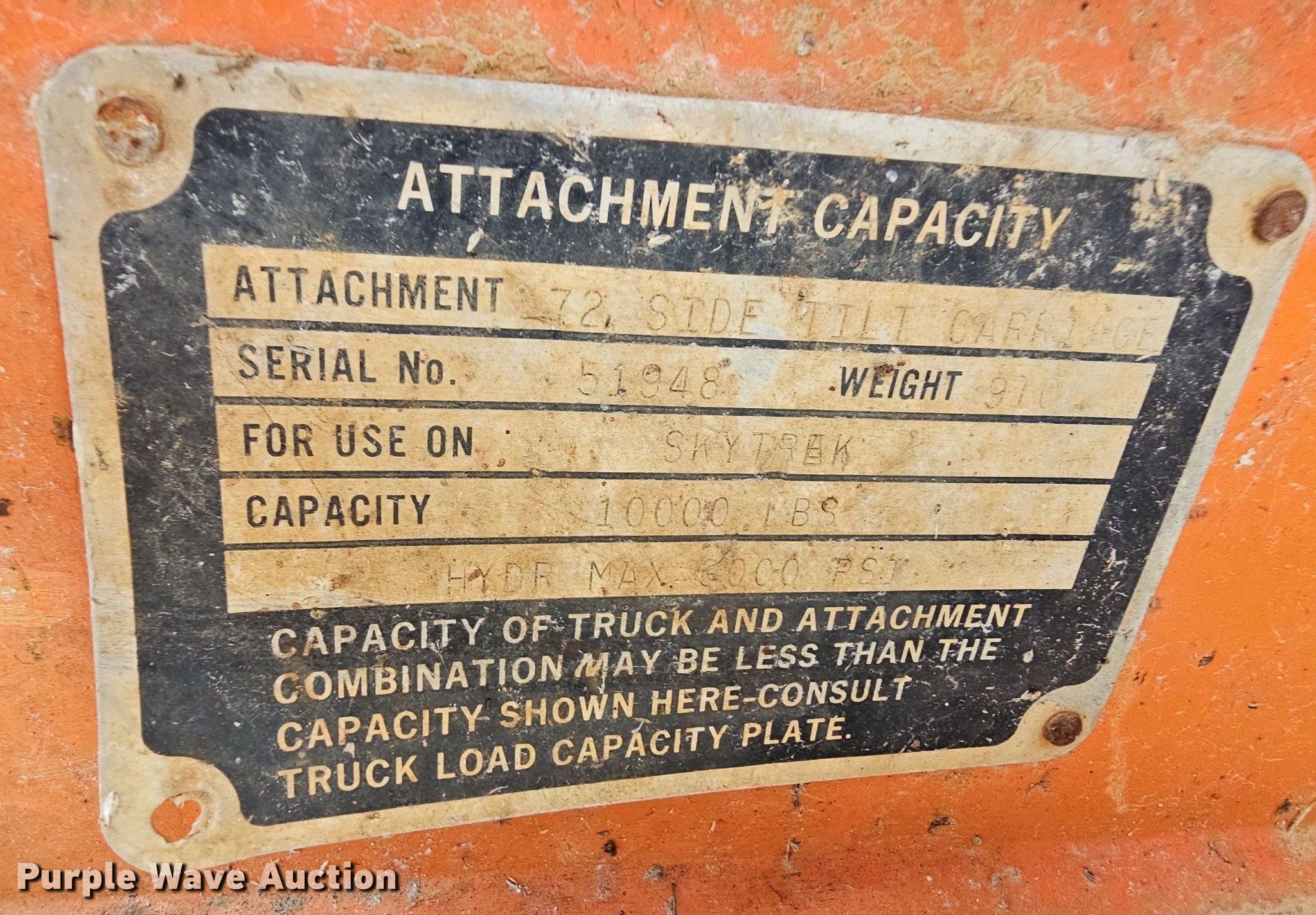 2002 SkyTrak 10054 telehandler. Hours: 6,134 on meter, Serial: 17827. Engine Cummins B3.9-C, Serial: 46244716, Cylinders: 4, Fuel type: Diesel. Transmission Powershift, 4F - 4R, Four wheel drive. Operators station Canopy, Heat. Features Maximum lift capacity: 10,000 lbs, Maximum lift height: 54', Boom stages: 4, Fork length: 47", Tilt carriage. Tires Size: 17.5-25, Foam filled. Notes Glass cracked. Cornerstone Building Services. 710 North McCroskey Street. Nixa, MO 65714