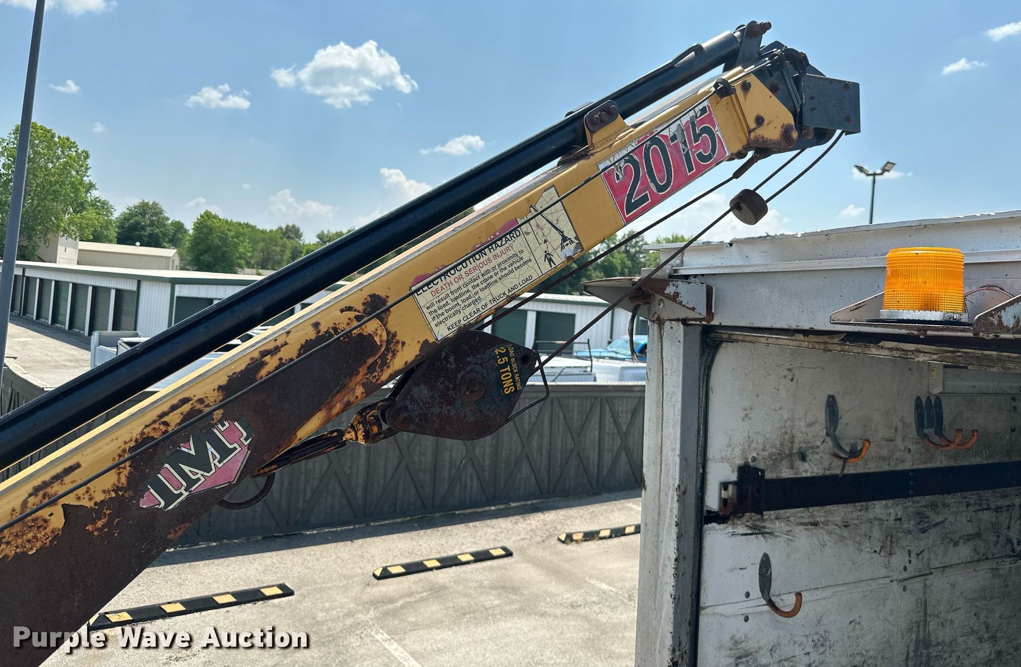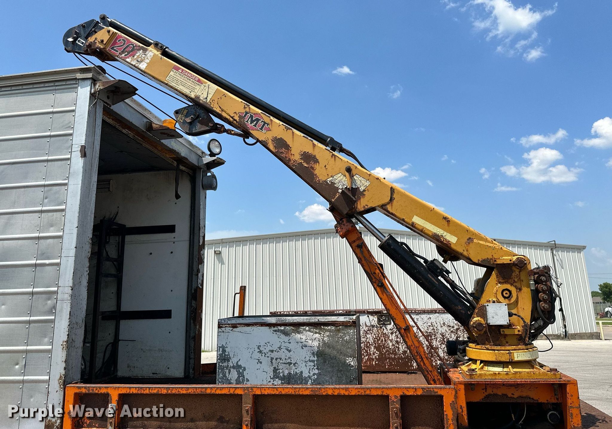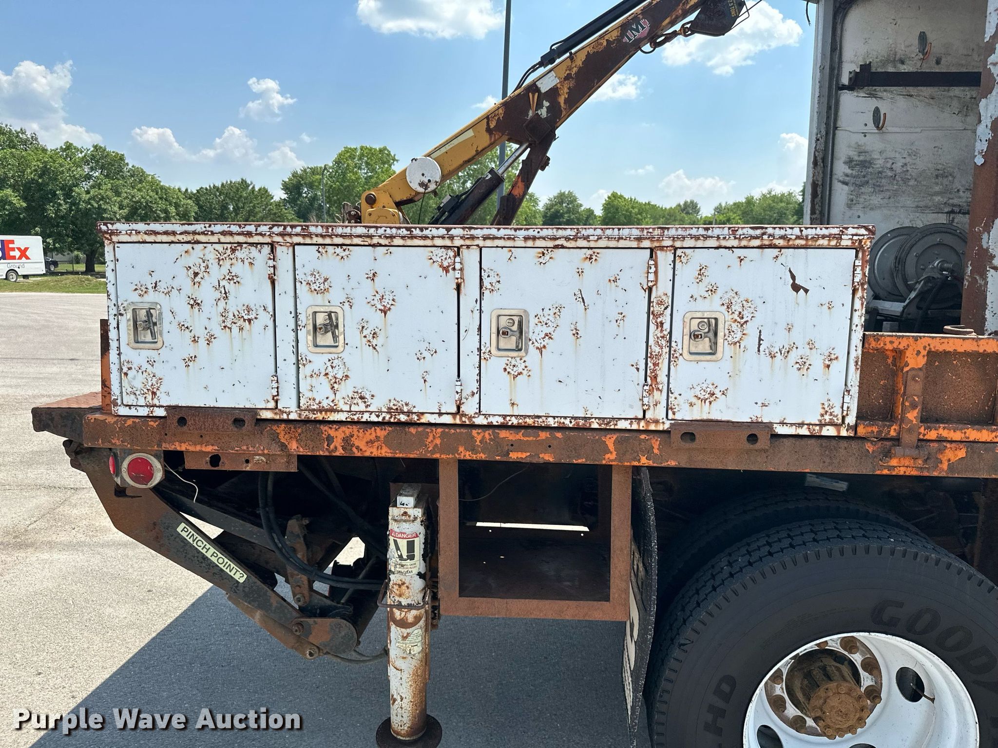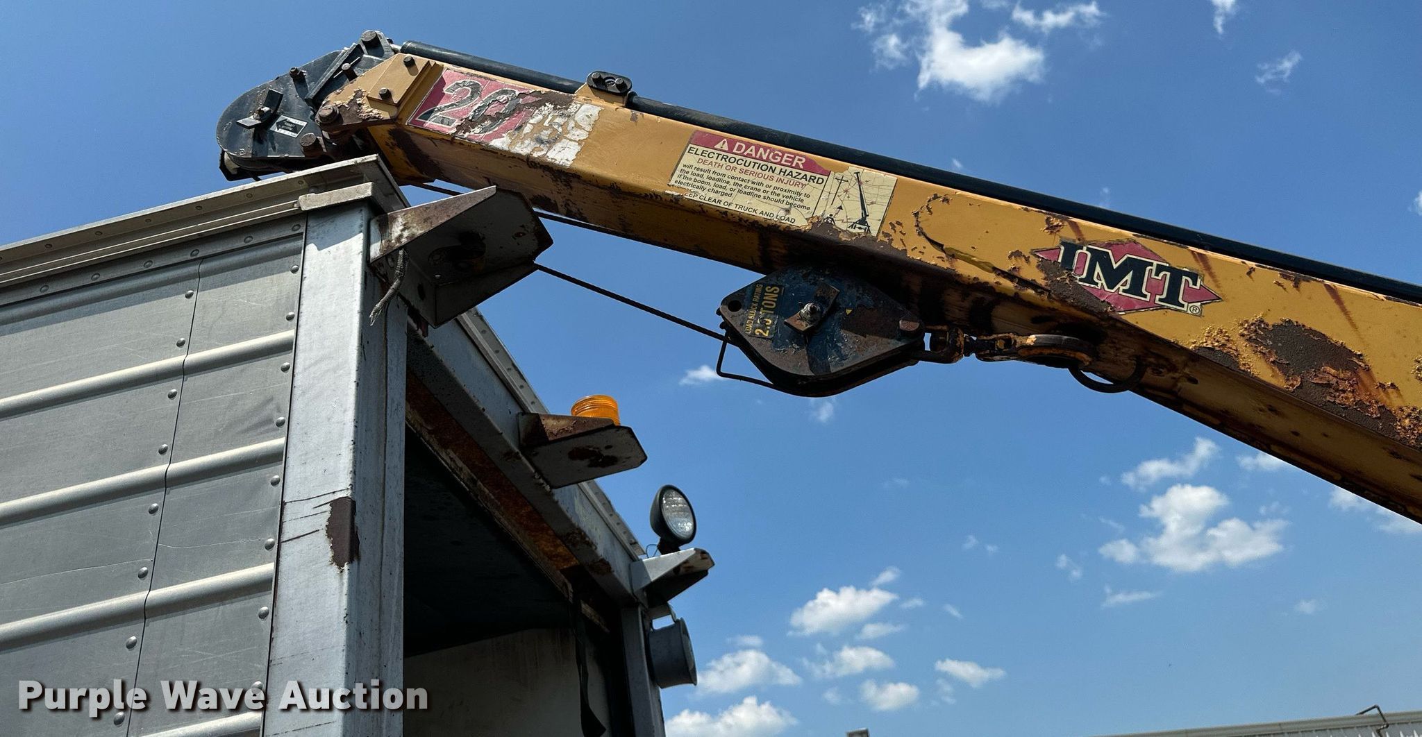 1995 Ford F800 utility / service truck. Miles: 177,589 on odometer, VIN: 1FDXF80E5SVA69985. Engine Cummins C Series, Displacement: 8.3L, Cylinders: 6, Fuel type: Diesel. Transmission Ford Road Ranger, Manual, Speed: 9. Chassis Axles: Single, Suspension: Spring, Brakes: Air, PTO, Wet kit, GVWR: 31,000 lbs, Wheelbase: 214". Interior AC, Heat, Auxiliary controls. Features Bed 18' 6" L x 7' 10" W, Box height: 6' 10", Crane IMT 2015, Maximum boom length: 20' Maximum lift capacity: 2,200 lbs.. Tires Size: 11R22.5. Notes Windshield chipped or cracked. Oklahoma title. Title distribution may be delayed up to 14 days from verification of funds. 13780 E 146th St N. Collinsville, OK 74021