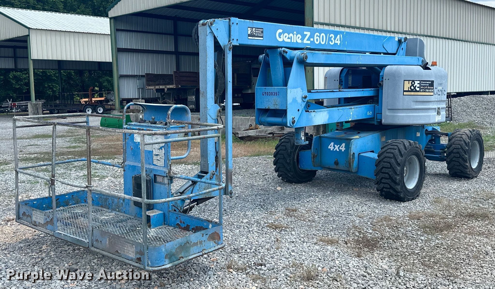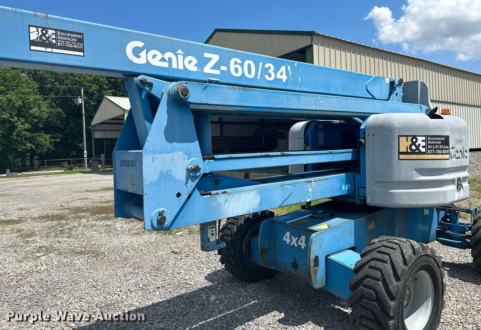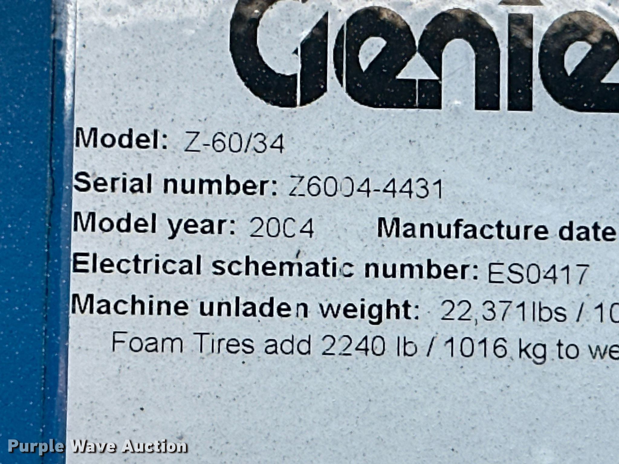 Purple Wave is selling a used Boom Lift in Oklahoma. This item is a 2004 Genie Z-60/34 boom lift with the following: Hours: 545 on meter, Actual hours unknown, Serial: Z6004-4431