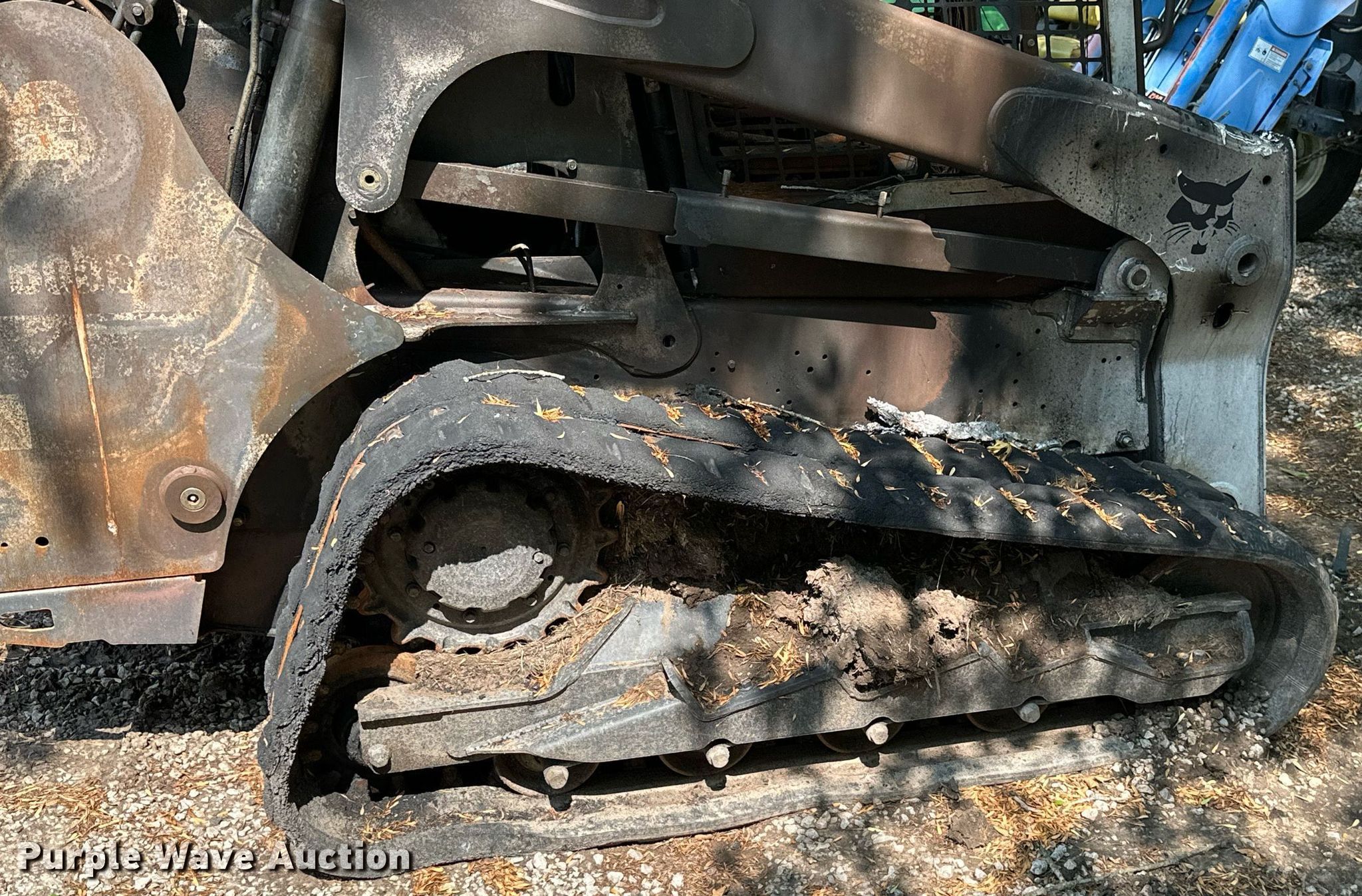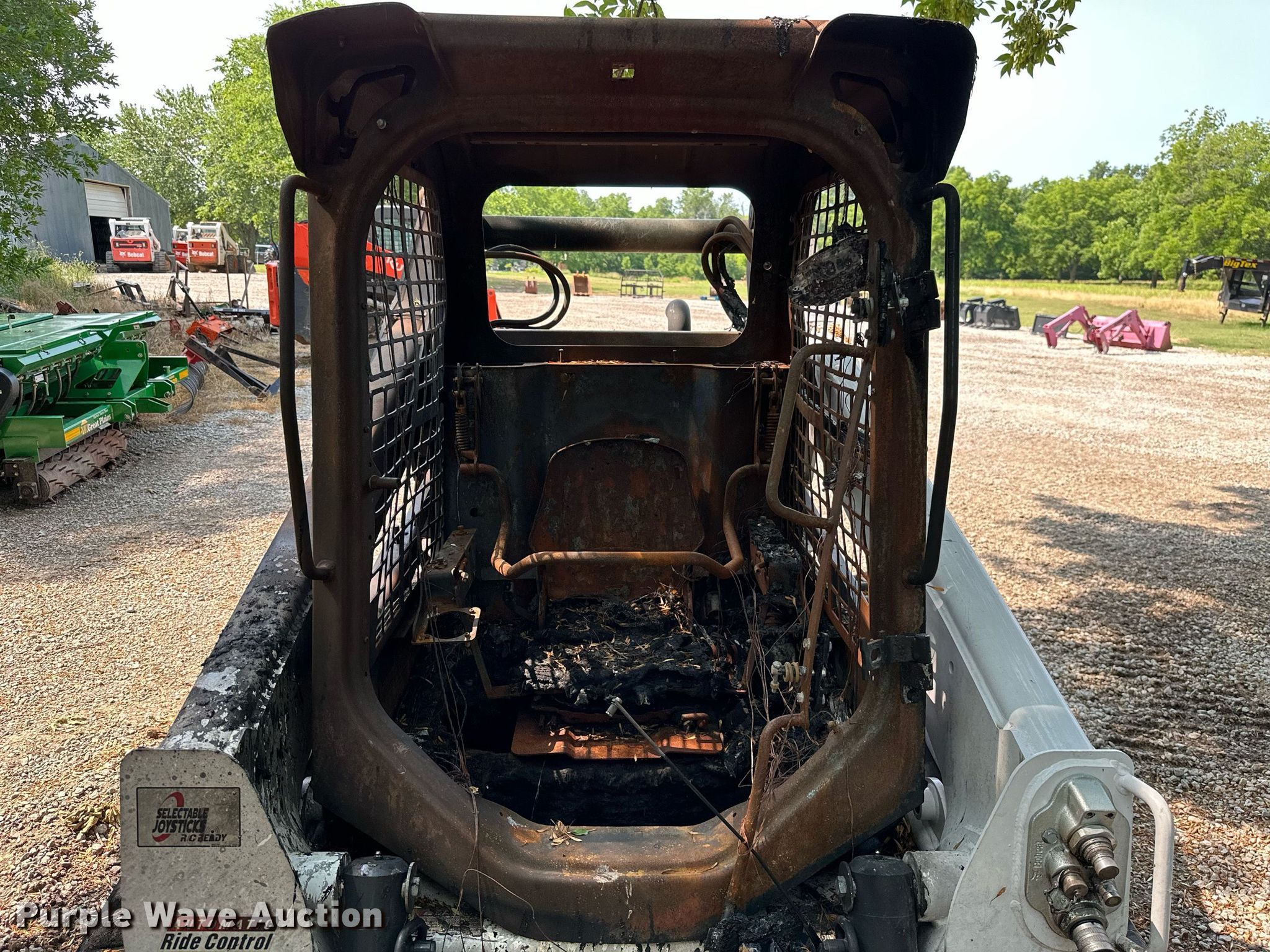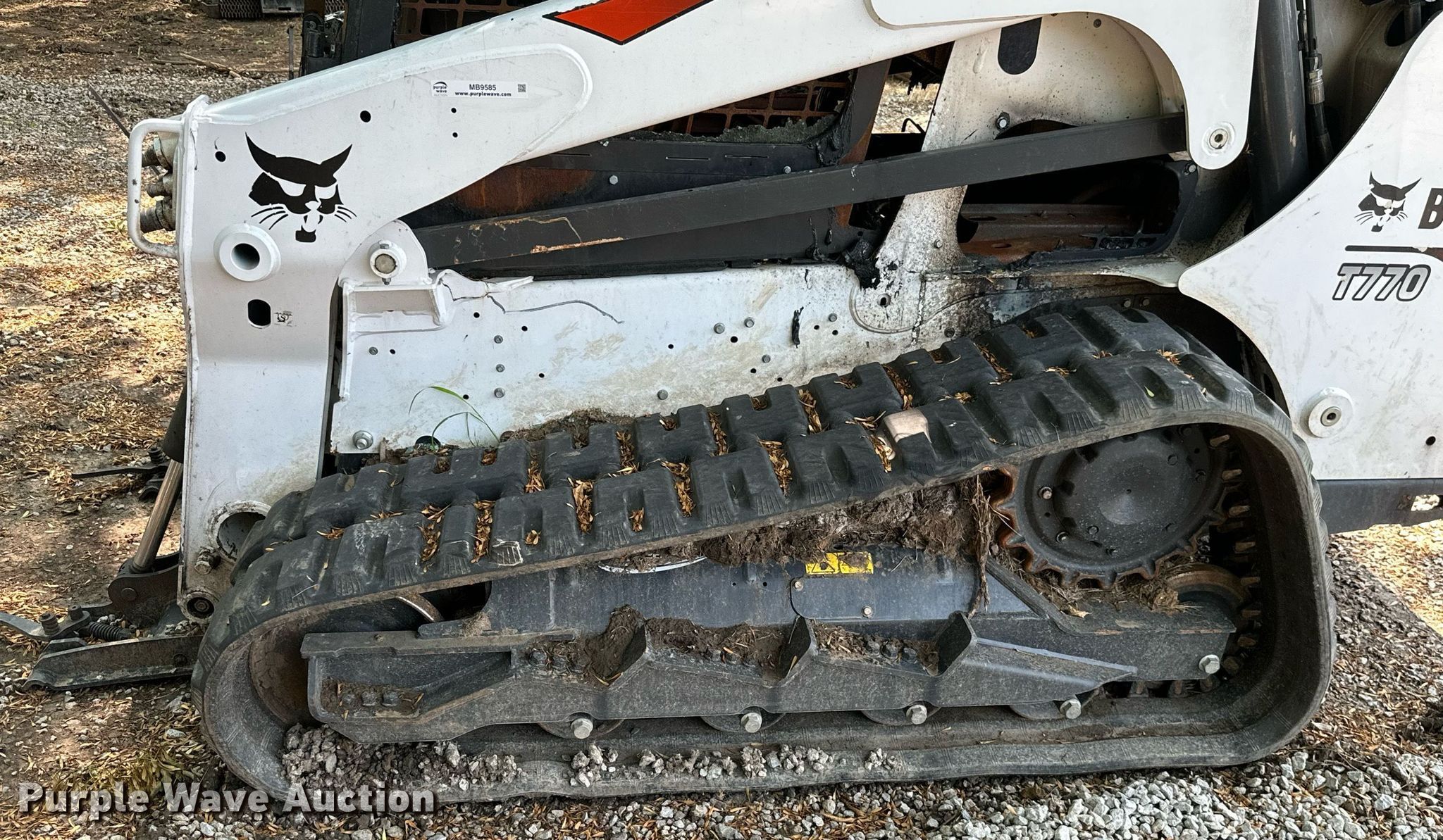 Bobcat T770 tracked skid steer loader. Hours: Unknown. Engine Cylinders: 4, Fuel type: Diesel. Transmission Hydrostatic. Features Auxiliary hydraulics, Quick coupler: Hydraulic. Tracks Width: 18". Notes Fire damage, Parts missing, Non-operational unit. 3B Ranch. Oologah, OK 74053