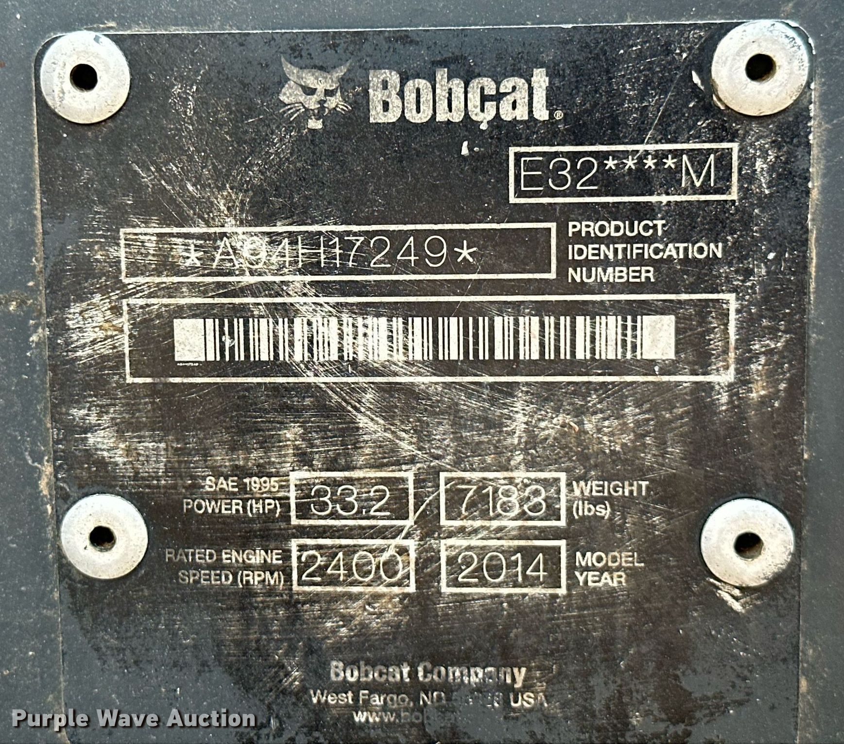 Purple Wave is selling a used Mini Excavator in Oklahoma. This item is a 2014 Bobcat E32 mini excavator with the following: Hours: 805 on meter, Serial: A94H17249