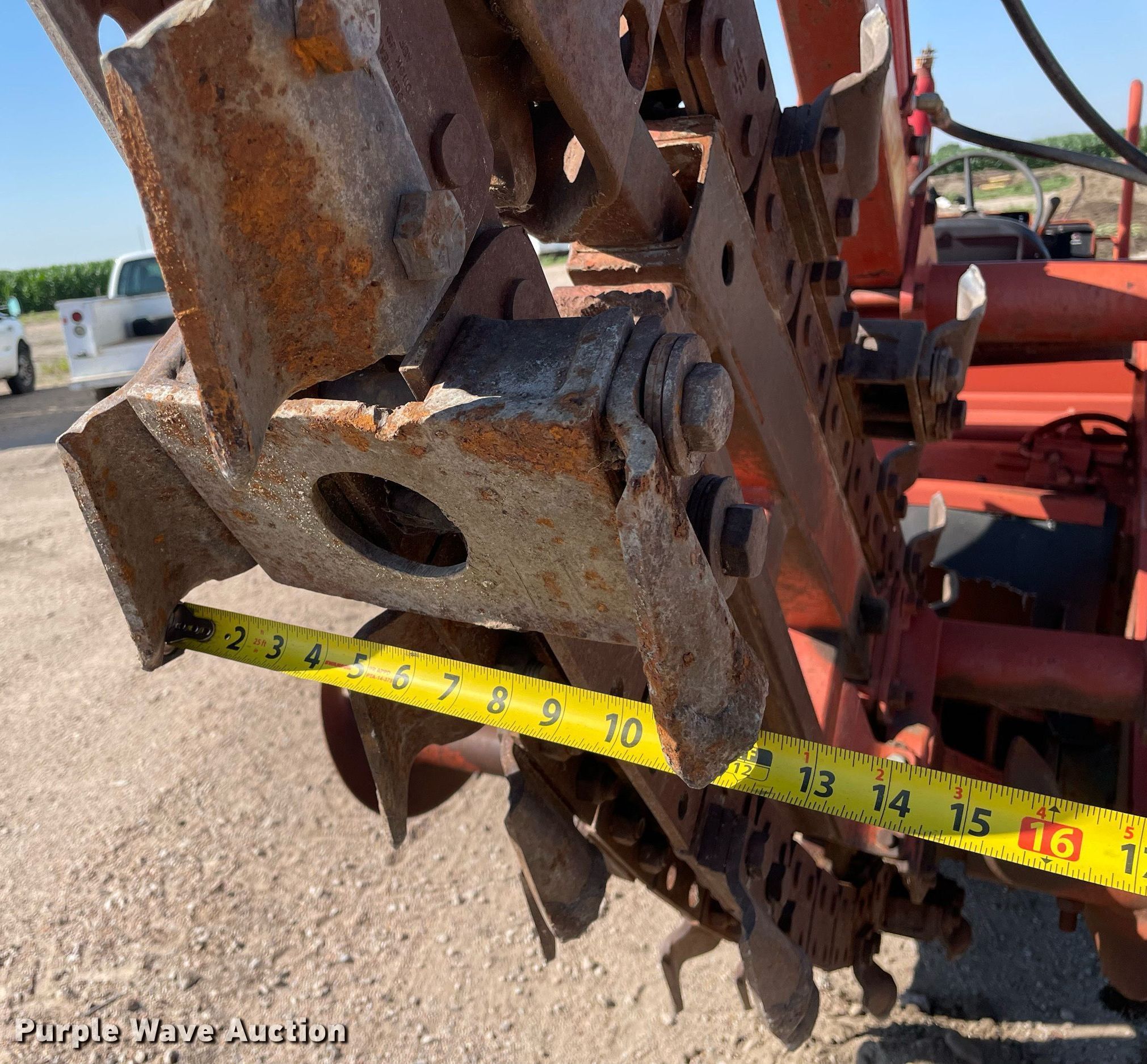 1986 Ditch Witch 5010DD trencher. Hours: 4,040 on meter, Serial: 6C1138. Engine Deutz F3L912, Cylinders: 3, Fuel type: Diesel, kW: 39. Transmission Manual, 4F - 1R, Two speed travel, Four wheel drive. Operators station OROPS. Features Trencher Model: A615, Serial: 2C1592, Estimated dig depth: 52", Cutting width: 12", Teeth: Dirt, Hydraulic crumber, Backfill blade Width: 72", Suite case weights: 6. Tires Size: 31x15.50-15. Notes Battery not included , Hydraulic lift cylinder leak , Tires included , Flat tires. Voegeli Concrete. Maize, KS 67101