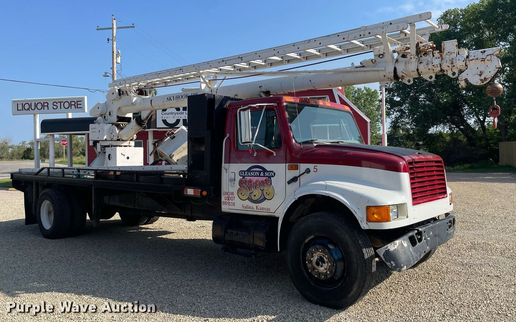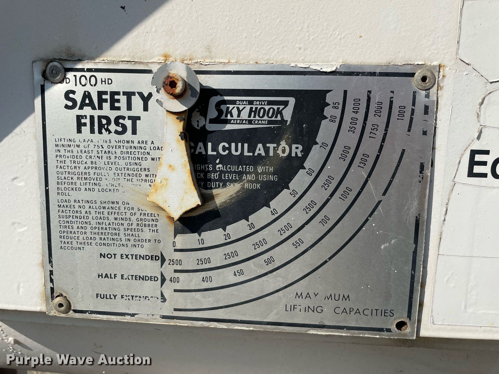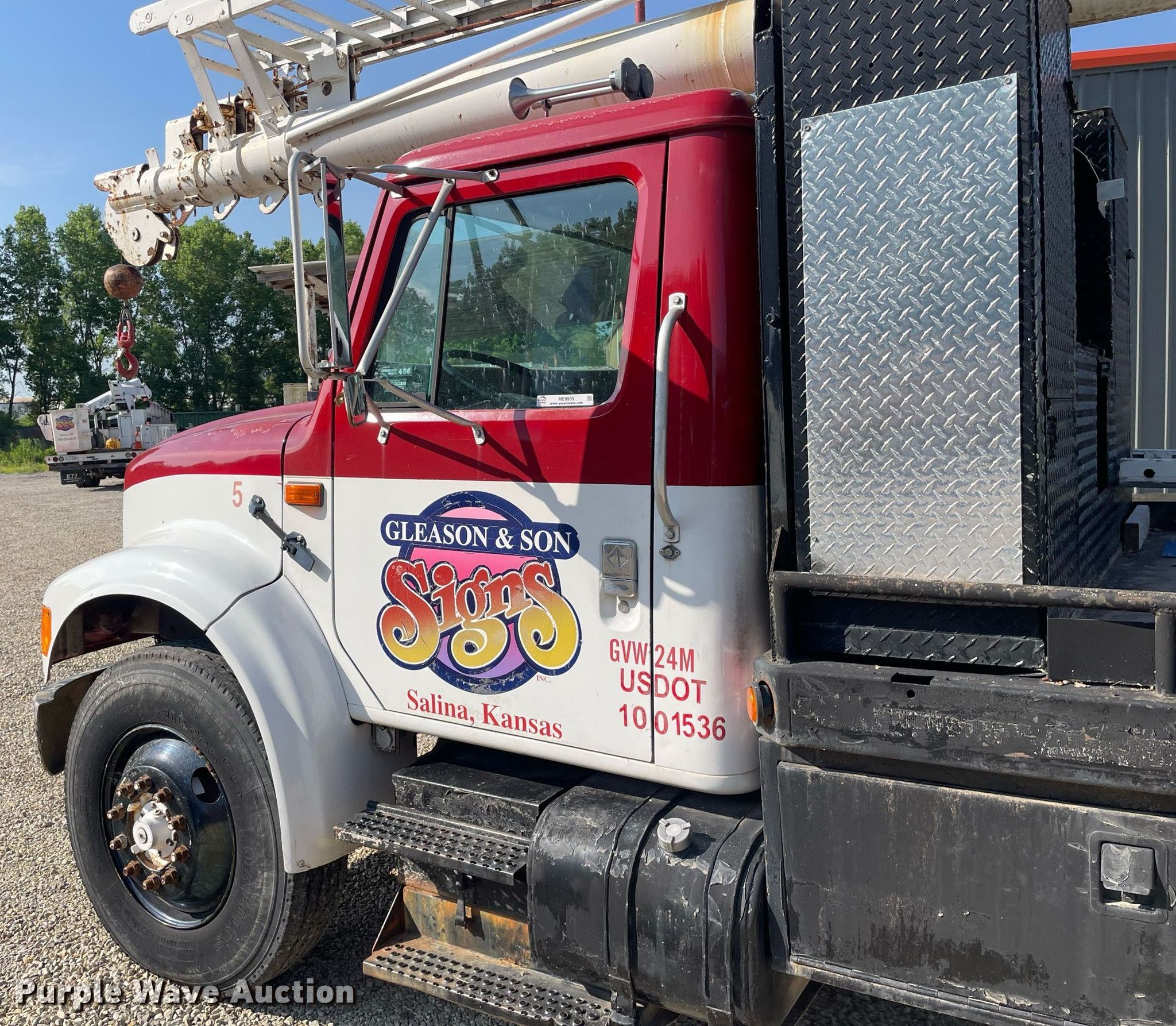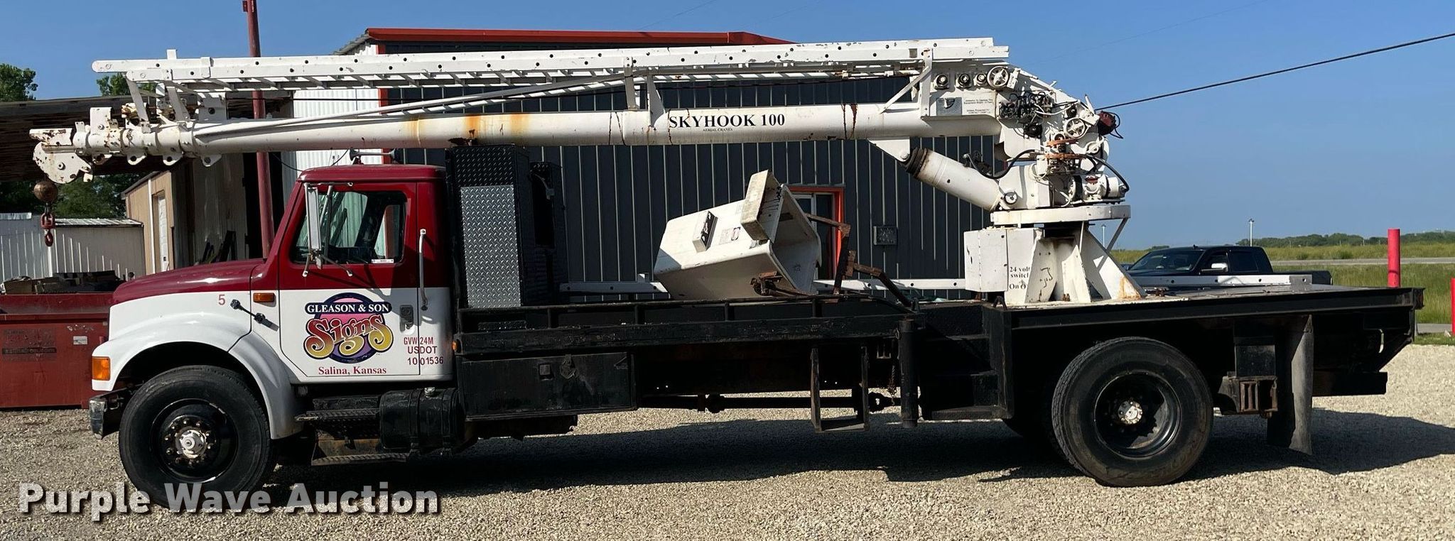 1991 International 4900 crane truck. Miles: 182,164 on odometer, Hours: 5,392 on meter, VIN: 1HTSDNUN2MH372658. Engine International DT466, Displacement: 7.6L, Cylinders: 6, Fuel type: Diesel. Transmission Spicer Double Duty D , Manual, Speed: 5, plus 2. Chassis Axles: Single, Suspension: Spring, Brakes: Air. Interior AC, Heat. Features Flatbed 22' 2" L x 95" W, Crane Aerial Cranes Skyhook 100, Boom Telescopic, Maximum boom length: 100' Sections: 4, Maximum lift capacity: 4,000 lbs, Boom controls Ground, Crane block Sheaves: 1, Lift chart, Man basket. Tires Size: 11R22.5. Notes Battery issues, weak, Crane rotational issues, stick. Kansas title. Title distribution may be delayed up to 30 days from verification of funds. Gleason & Son Signs Inc.. Salina, KS 67401