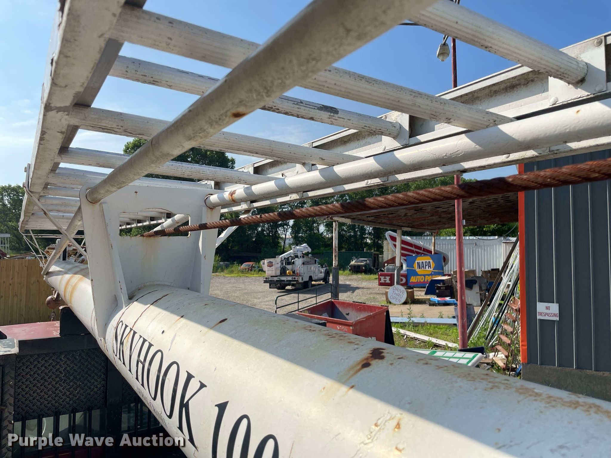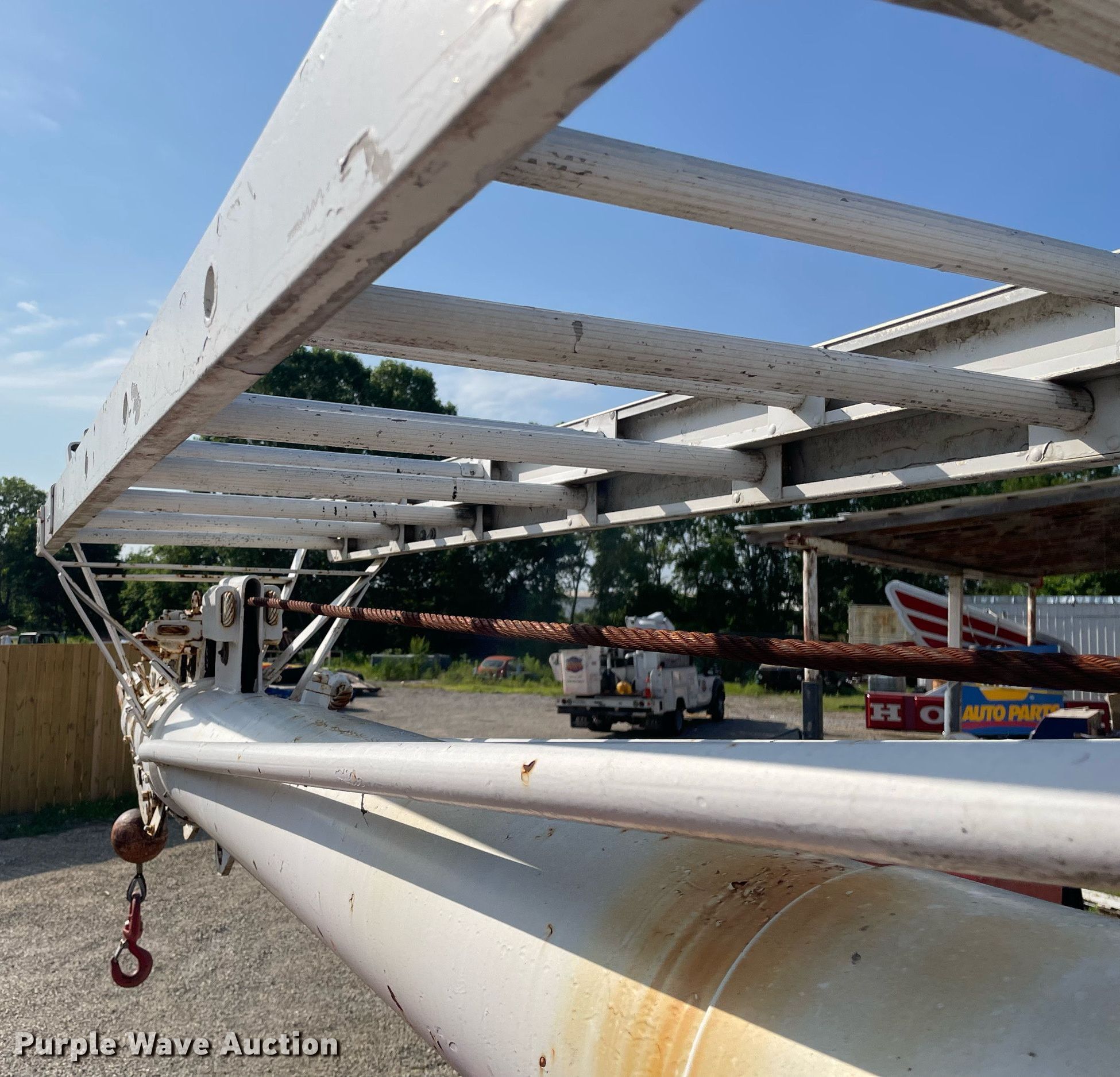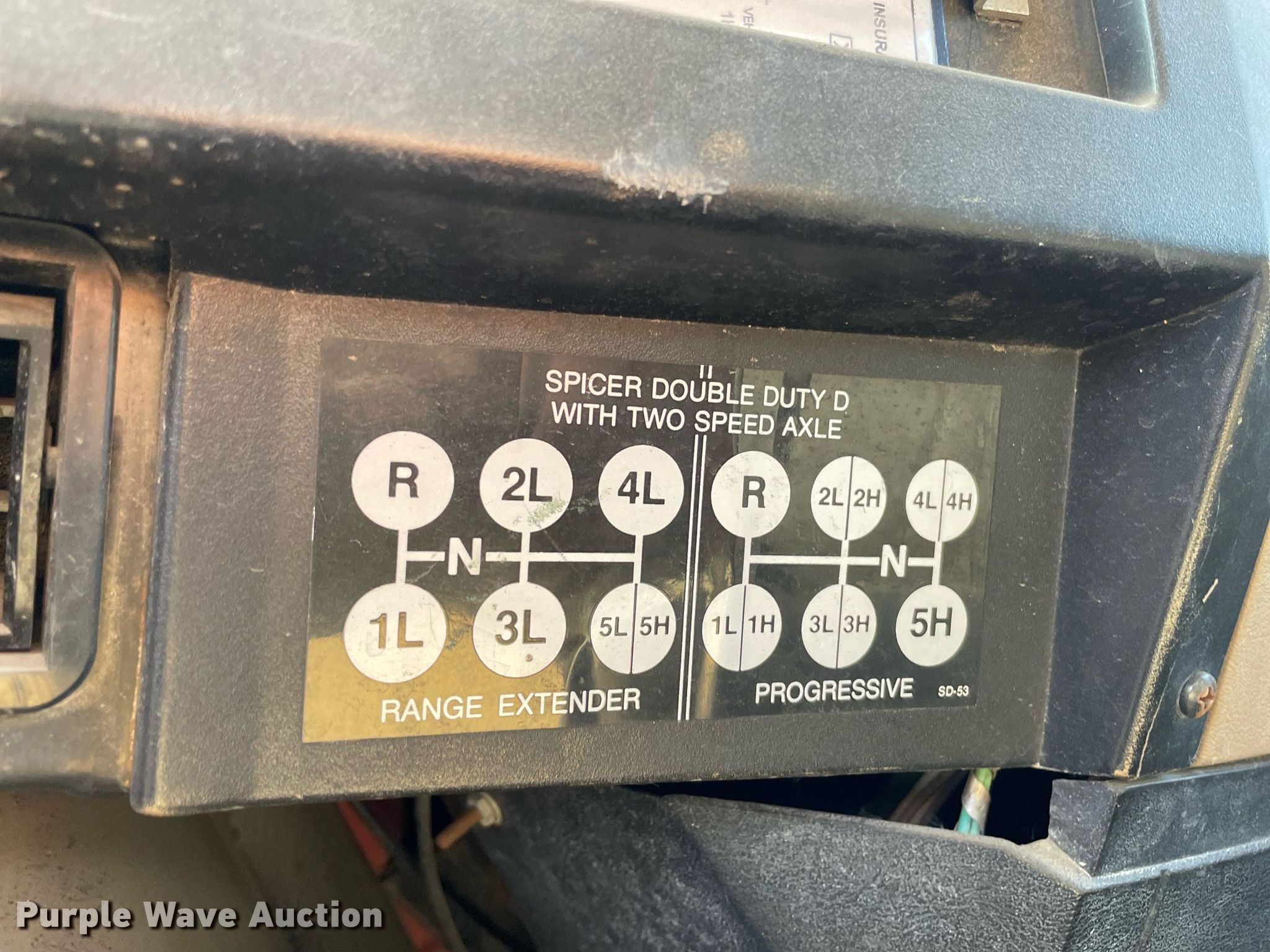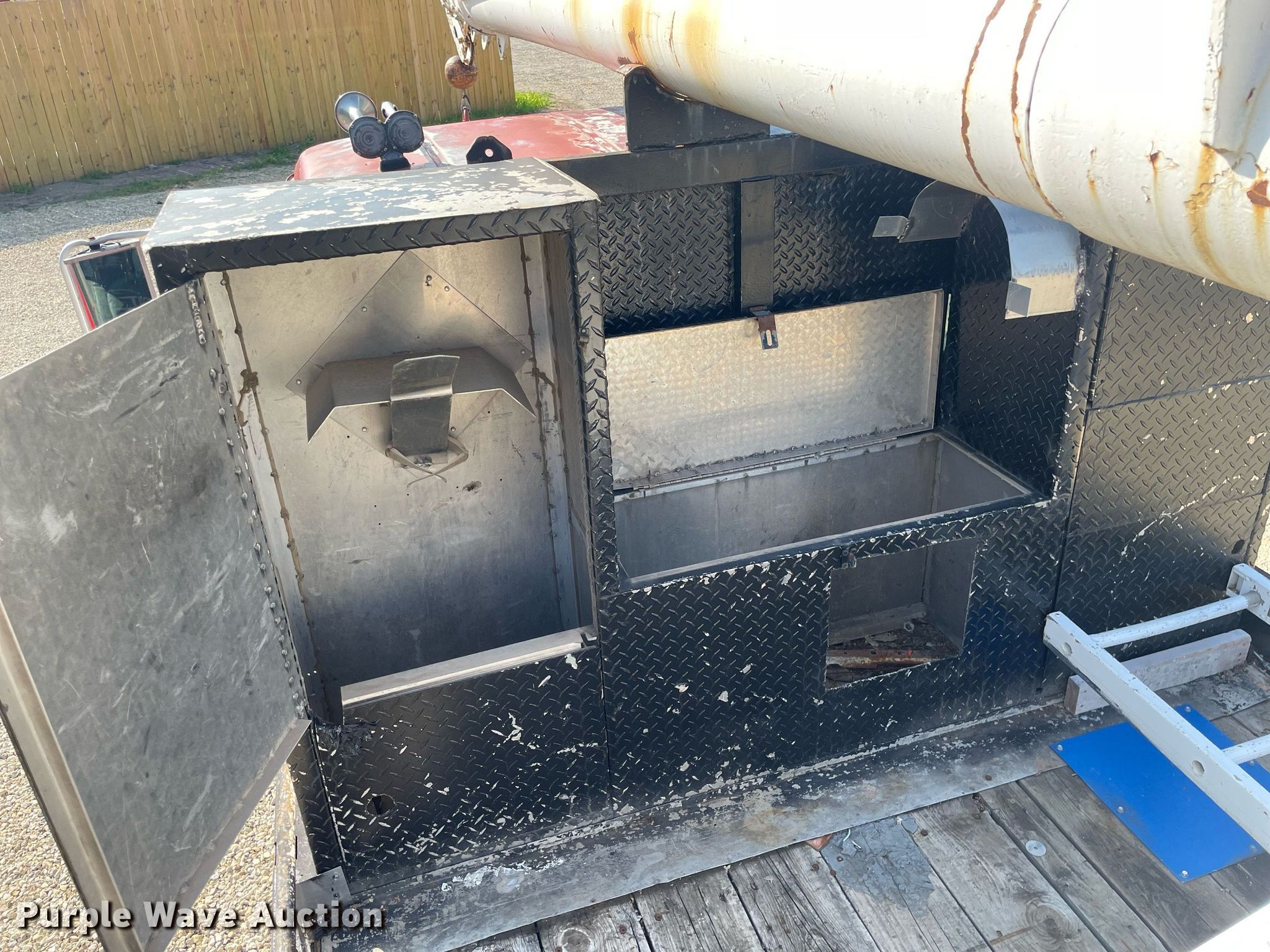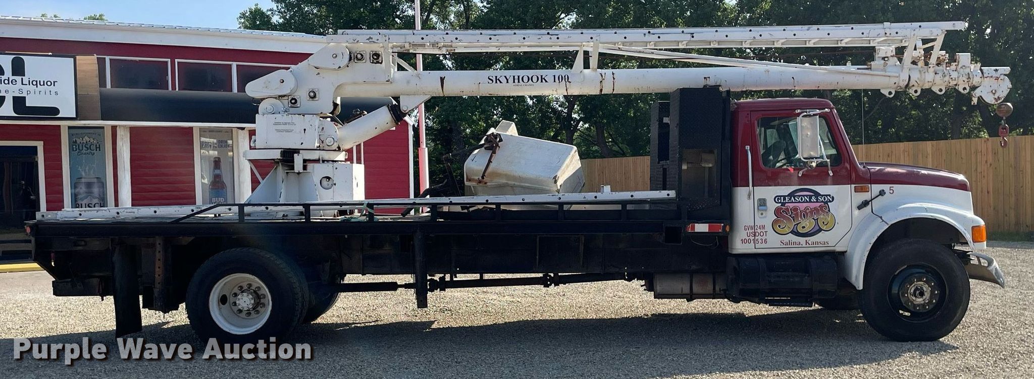 1991 International 4900 crane truck. Miles: 182,164 on odometer, Hours: 5,392 on meter, VIN: 1HTSDNUN2MH372658. Engine International DT466, Displacement: 7.6L, Cylinders: 6, Fuel type: Diesel. Transmission Spicer Double Duty D , Manual, Speed: 5, plus 2. Chassis Axles: Single, Suspension: Spring, Brakes: Air. Interior AC, Heat. Features Flatbed 22' 2" L x 95" W, Crane Aerial Cranes Skyhook 100, Boom Telescopic, Maximum boom length: 100' Sections: 4, Maximum lift capacity: 4,000 lbs, Boom controls Ground, Crane block Sheaves: 1, Lift chart, Man basket. Tires Size: 11R22.5. Notes Battery issues, weak, Crane rotational issues, stick. Kansas title. Title distribution may be delayed up to 30 days from verification of funds. Gleason & Son Signs Inc.. Salina, KS 67401