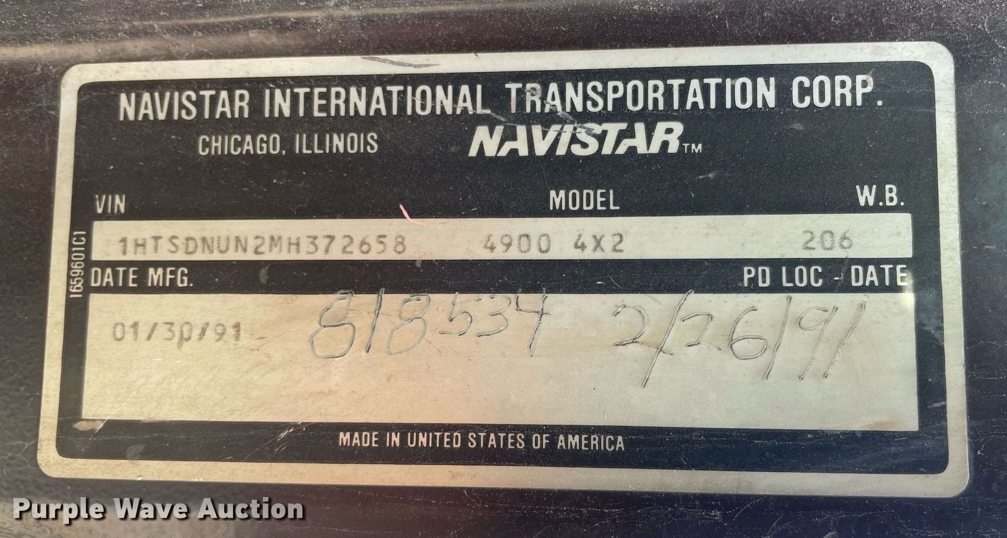 Purple Wave is selling a used Crane Truck in Kansas. This item is a 1991 International 4900 crane truck with the following: Miles: 182,164 on odometer, Hours: 5,392 on meter, VIN: 1HTSDNUN2MH372658