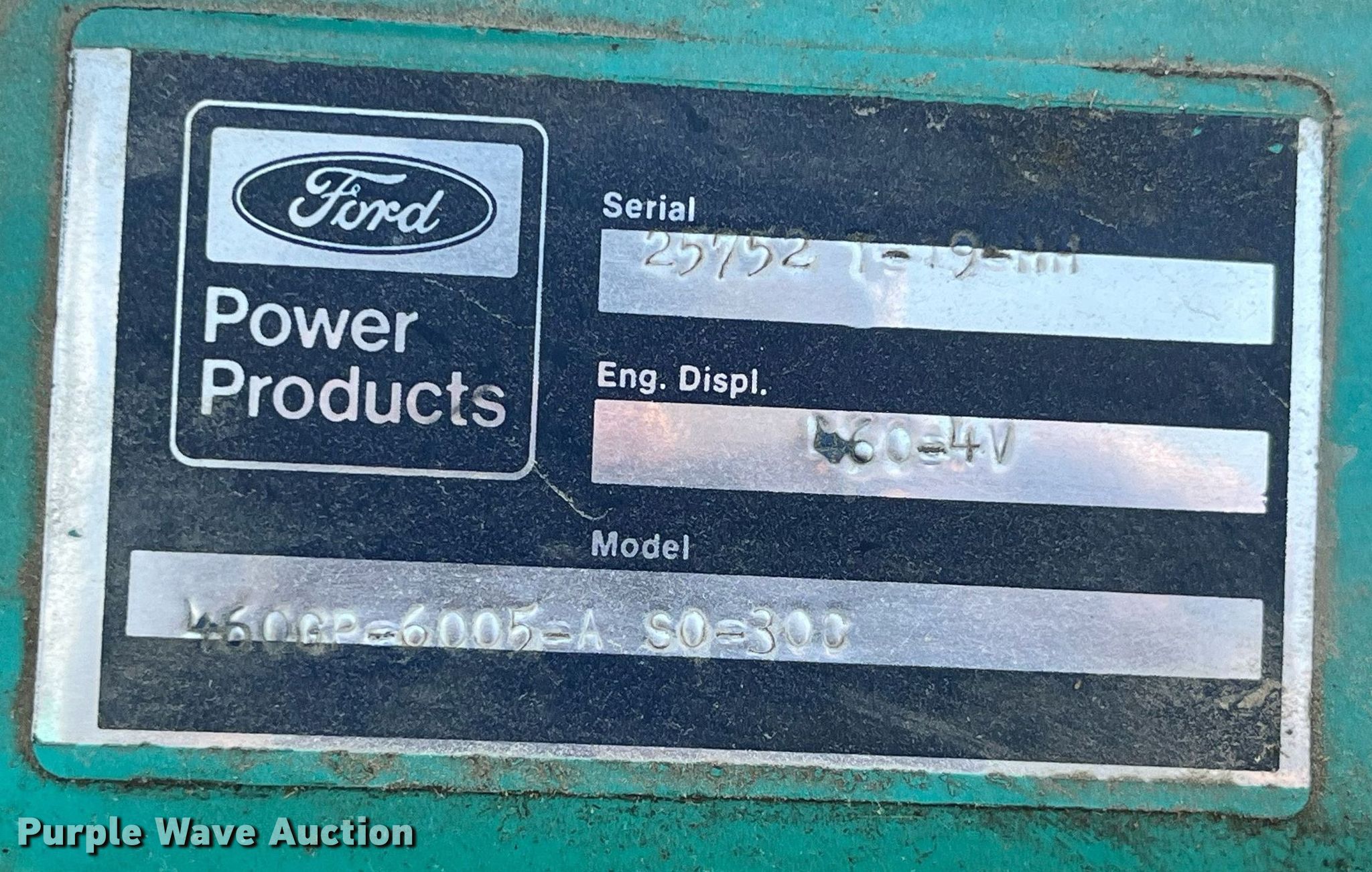 Onan 55OEN-15R/13448B generator. Hours: 1,048 on meter, Serial: H770259386. Engine Ford 4600GP-6005-A S0-30C, Serial: 25752 T-19-HH, Cylinders: 8, Fuel type: LPG, Natural gas. Features Generator Onan 55OEN-15R/13448B, Phase: Single kVA: 46, kW: 37, Phase: Three kVA: 69, kW: 55, Electric start. Notes Unknown operating condition. Moffett Mechanical LLC. 107 West Grand Ave. Memphis, MO 63555