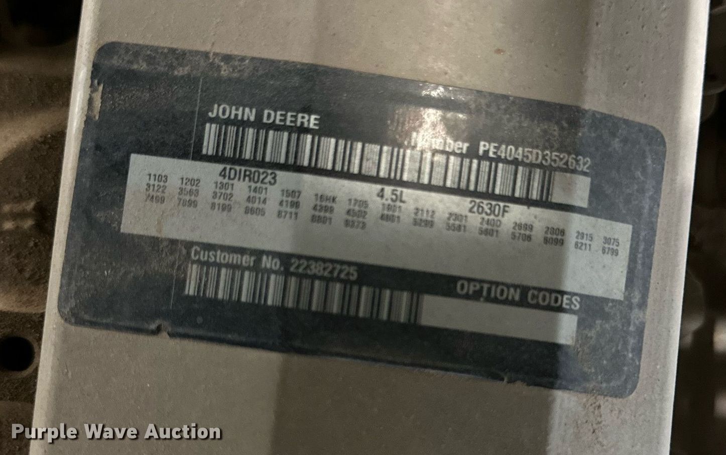 2004 Ingersoll Rand P185WJD air compressor. Hours: 4,738 on meter, Serial: 345483UD0221. Engine John Deere 4045D, Displacement: 4.5L , Cylinders: 4, Fuel type: Diesel, kW: 60. Features Air compressor Silvan, CFM: 185, PSI: 100. Trailer 12' L x 72" W, Axles: Single, Tire size: 205/75R15, GVWR: 2,990 lbs, GAWR: 2,870 lbs. Notes Fluid leaks. This is worksite support equipment and will not come with a title. Transfer of ownership documentation will be a bill of sale. Tucker Oil Company Inc. 7604 East F M 41. Slaton, TX 79364
