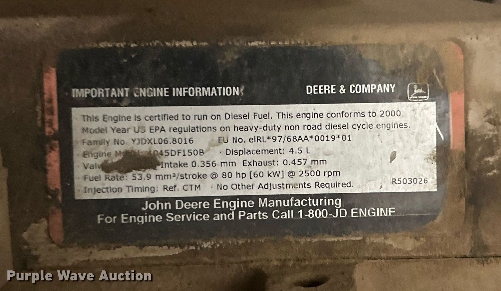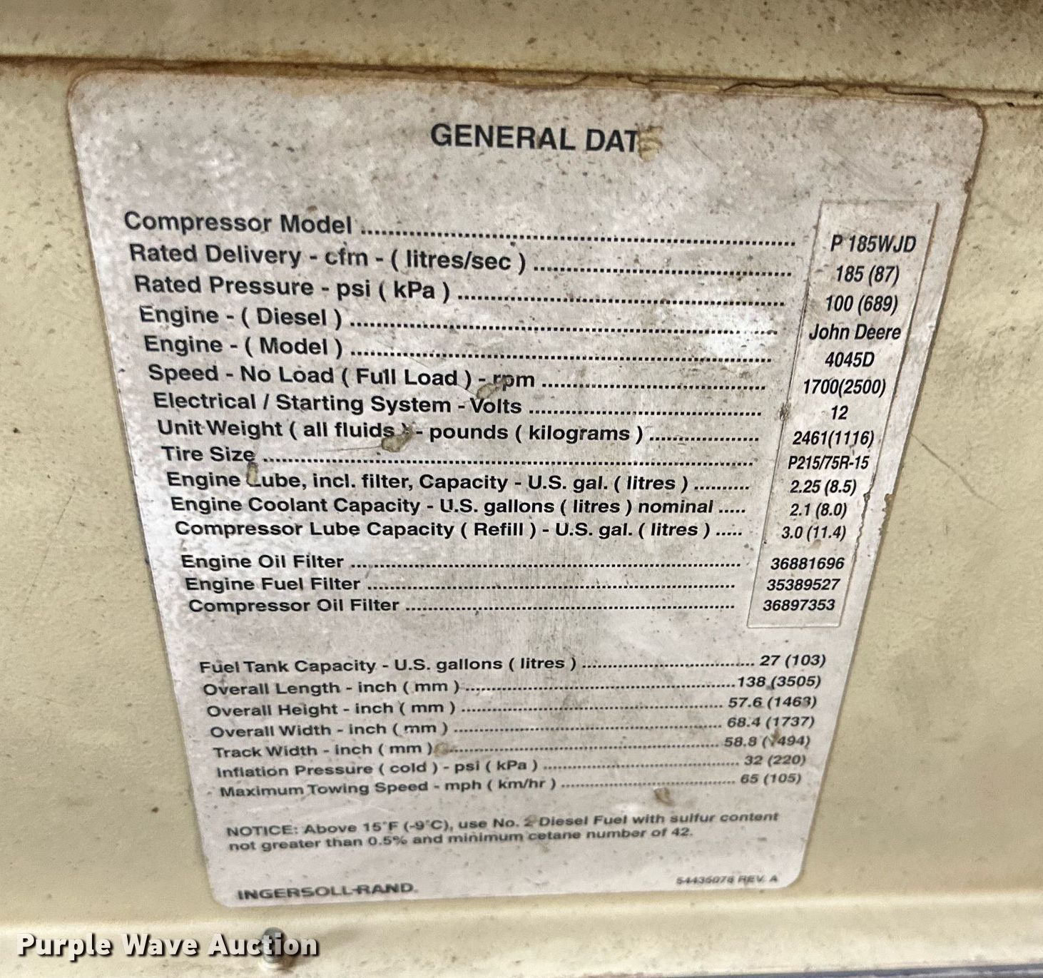 2000 Ingersoll Rand P185WJD air compressor. Hours: 602 on meter, Serial: 311221UDK221. Engine John Deere 4045D, Displacement: 4.5L, Cylinders: 4, Fuel type: Diesel. Features Air compressor Silvan, CFM: 185, PSI: 100. Trailer 11' L x 72" W, Suspension: Spring, Axles: Single, Tire size: 225/75R15, GVWR: 2,990 lbs, GAWR: 2,870 lbs. Notes Possible engine issues Smokes, Rough idle, Unknown operating condition. This is worksite support equipment and will not come with a title. Transfer of ownership documentation will be a bill of sale. Tucker Oil Company Inc. 7604 East F M 41. Slaton, TX 79364