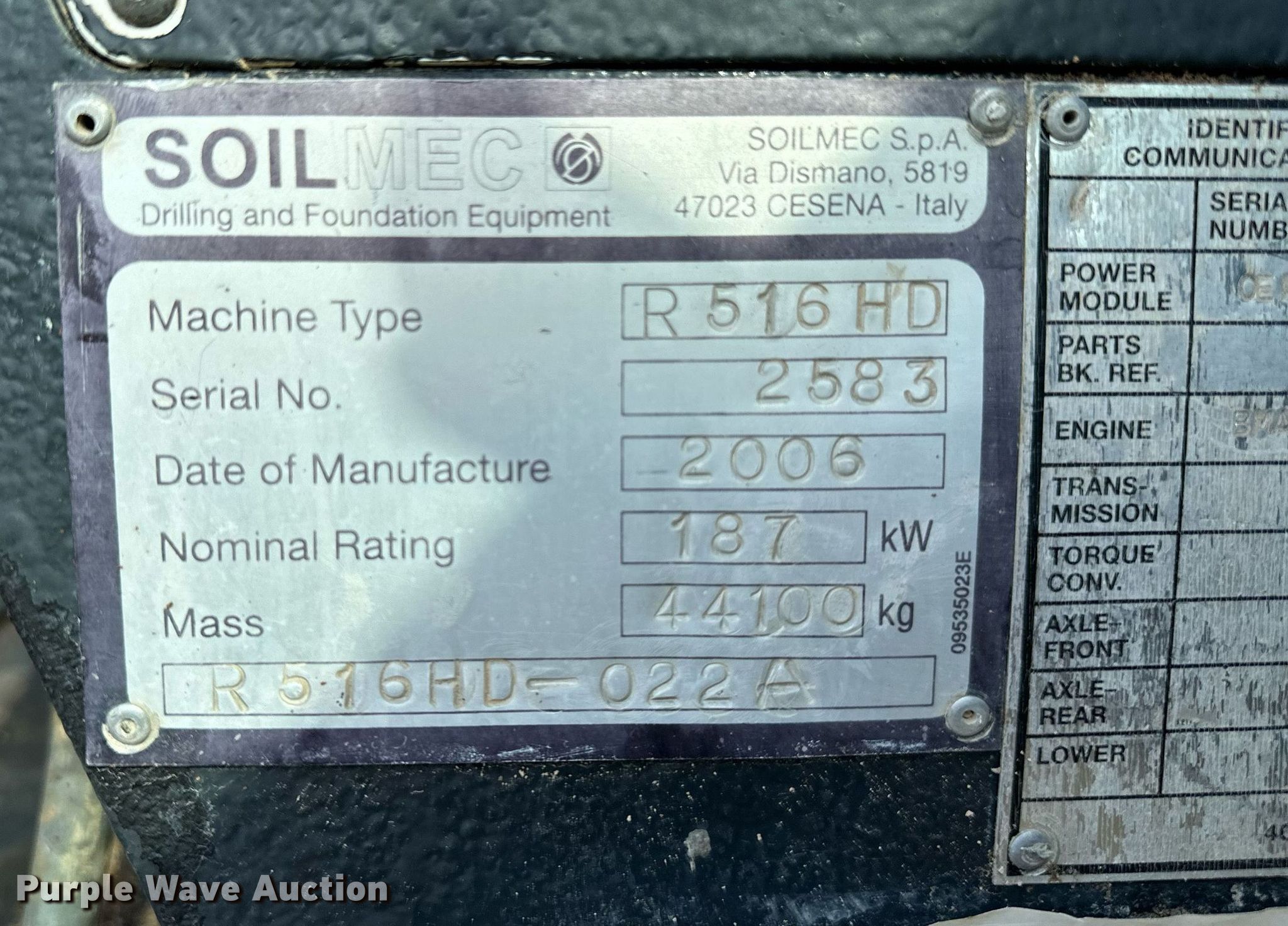 Purple Wave is selling a used Drilling Rig in Oklahoma. This item is a 2006 Soilmec R516 HD drilling rig with the following: Hours: 7,376 on meter, VIN: 2583